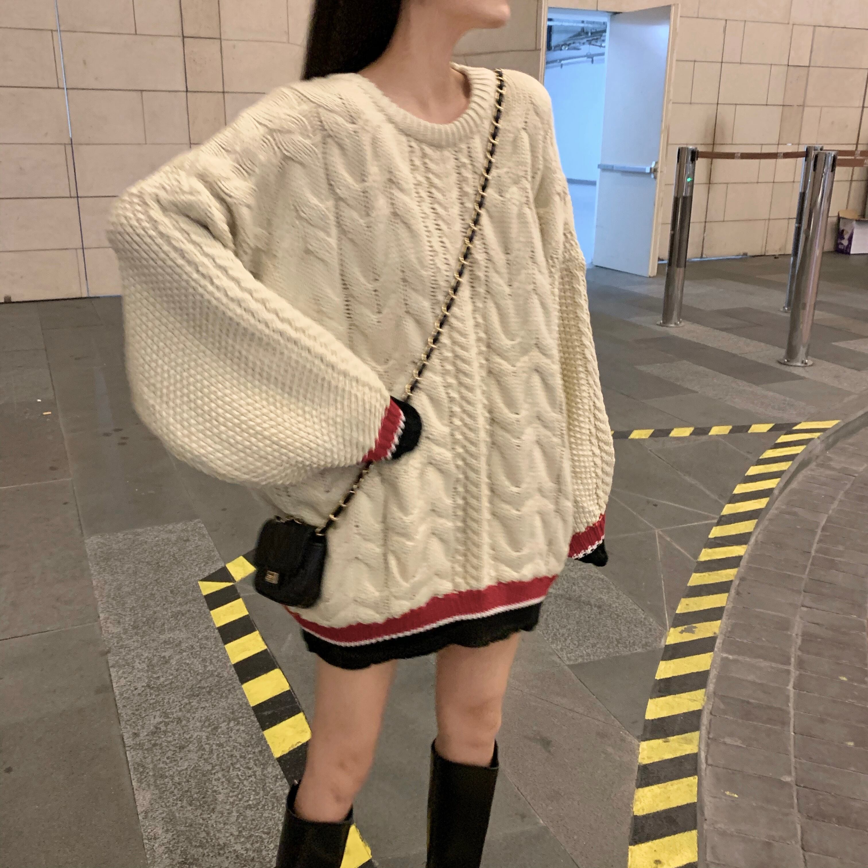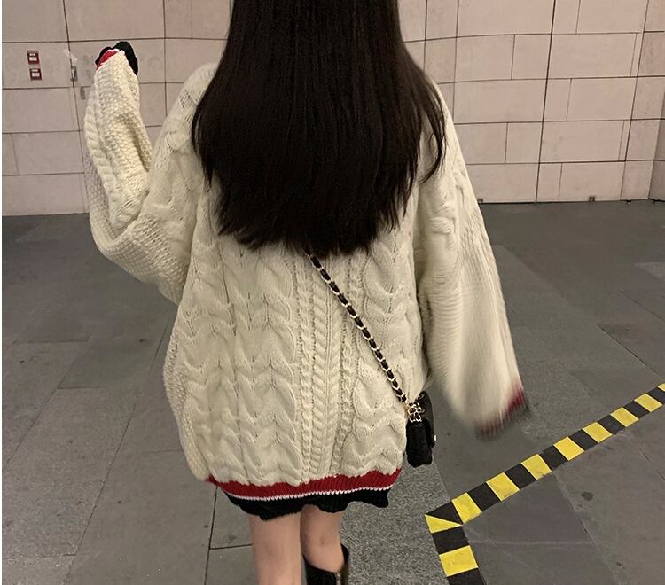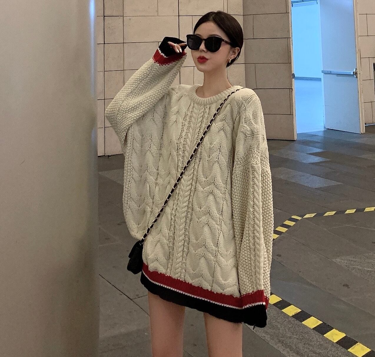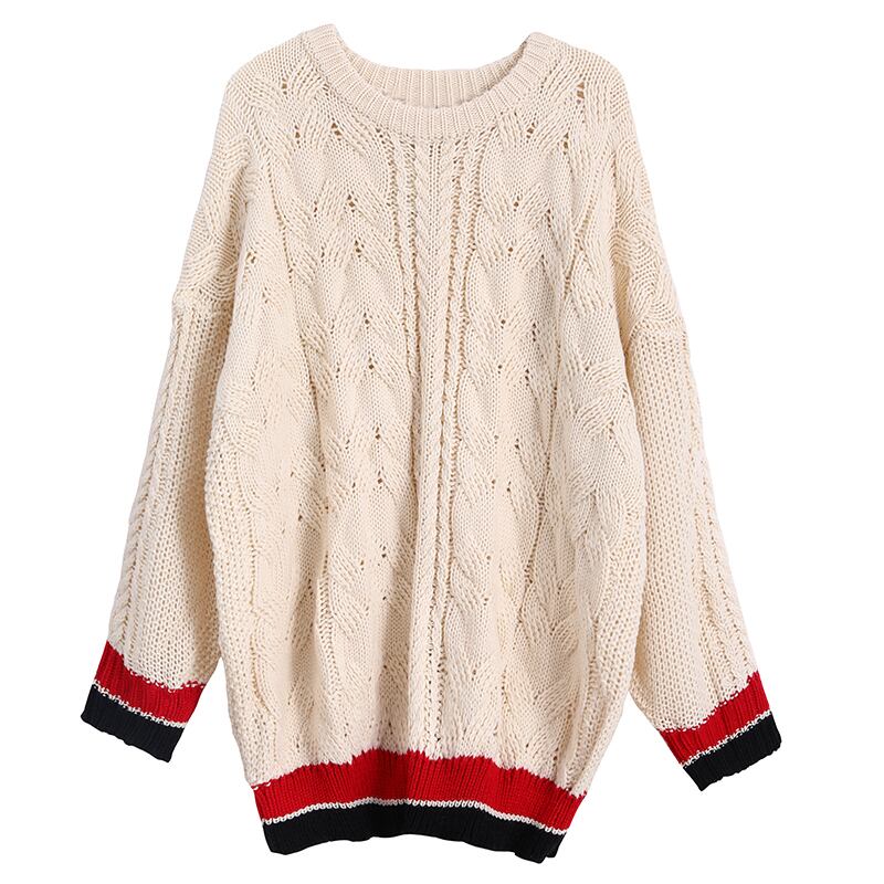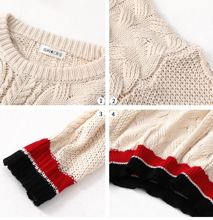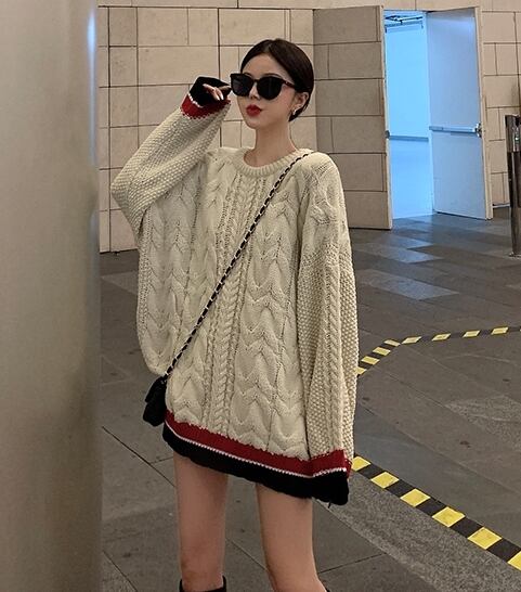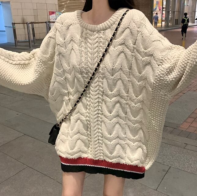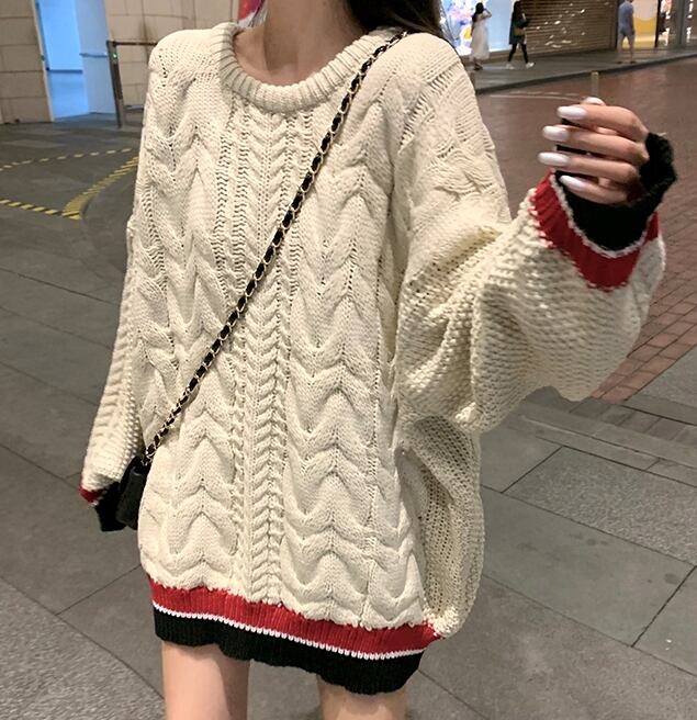 トップス プルオーバー セーター ケーブルニット オーバーサイズ ゆったり ボーダー ラウンドネック 長袖 クール ラフ カジュアル デイリー 春 冬