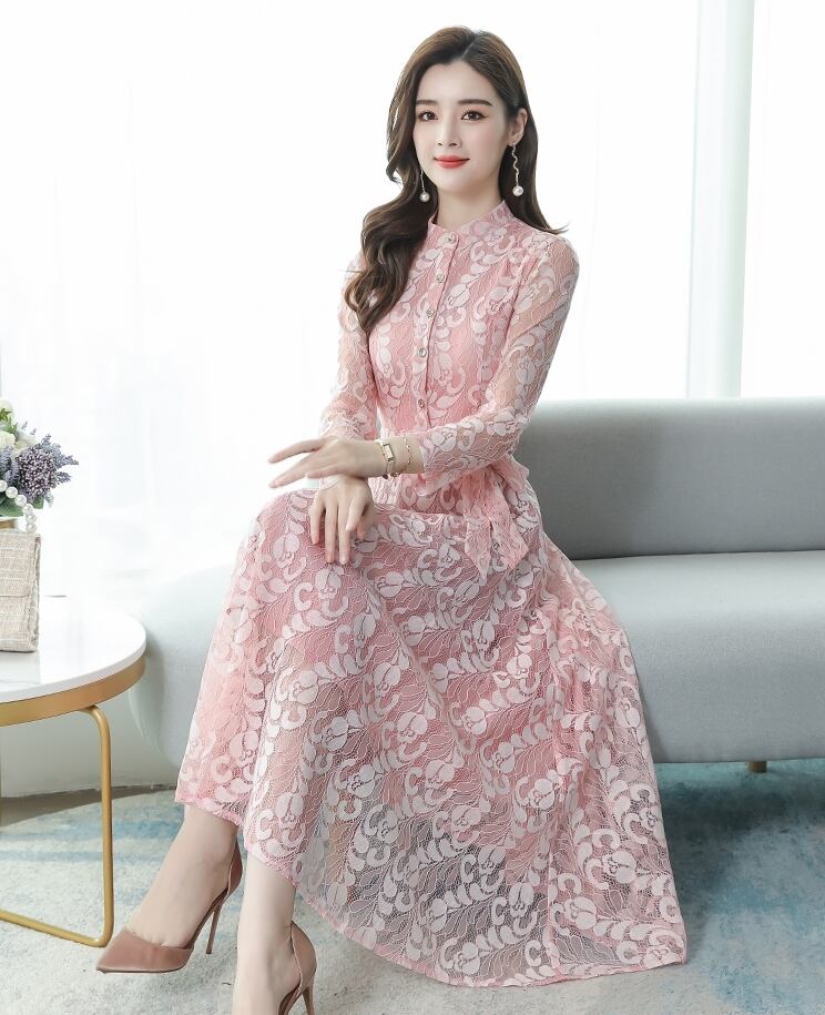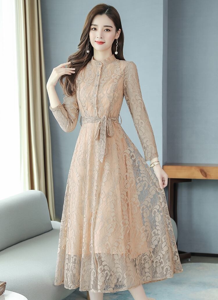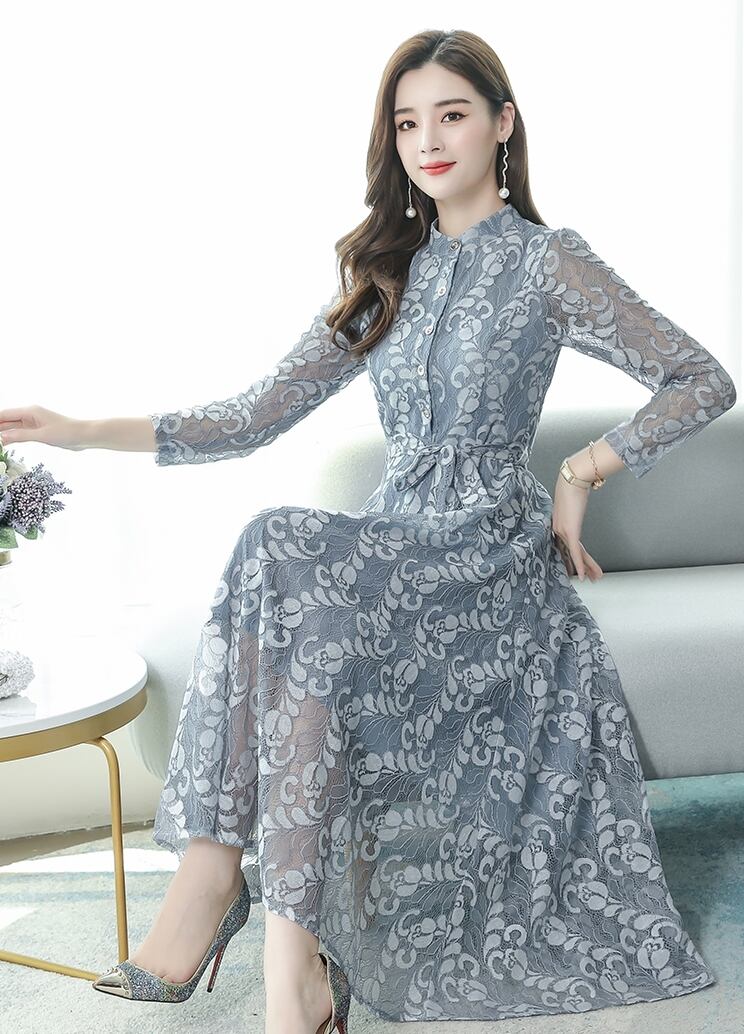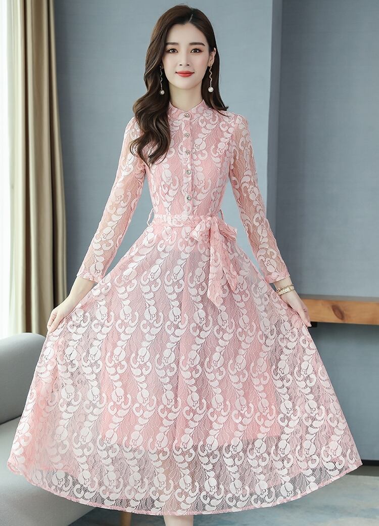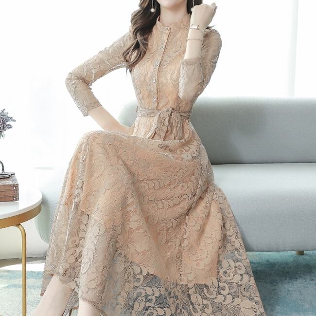 全5色ドレス ワンピース 総レース 花柄 ロング丈 フロントボタン クルーネック ウエストリボン 大人可愛い 上品 エレガント きれいめ お呼ばれ パーティー シック フレア 結婚式 春 夏