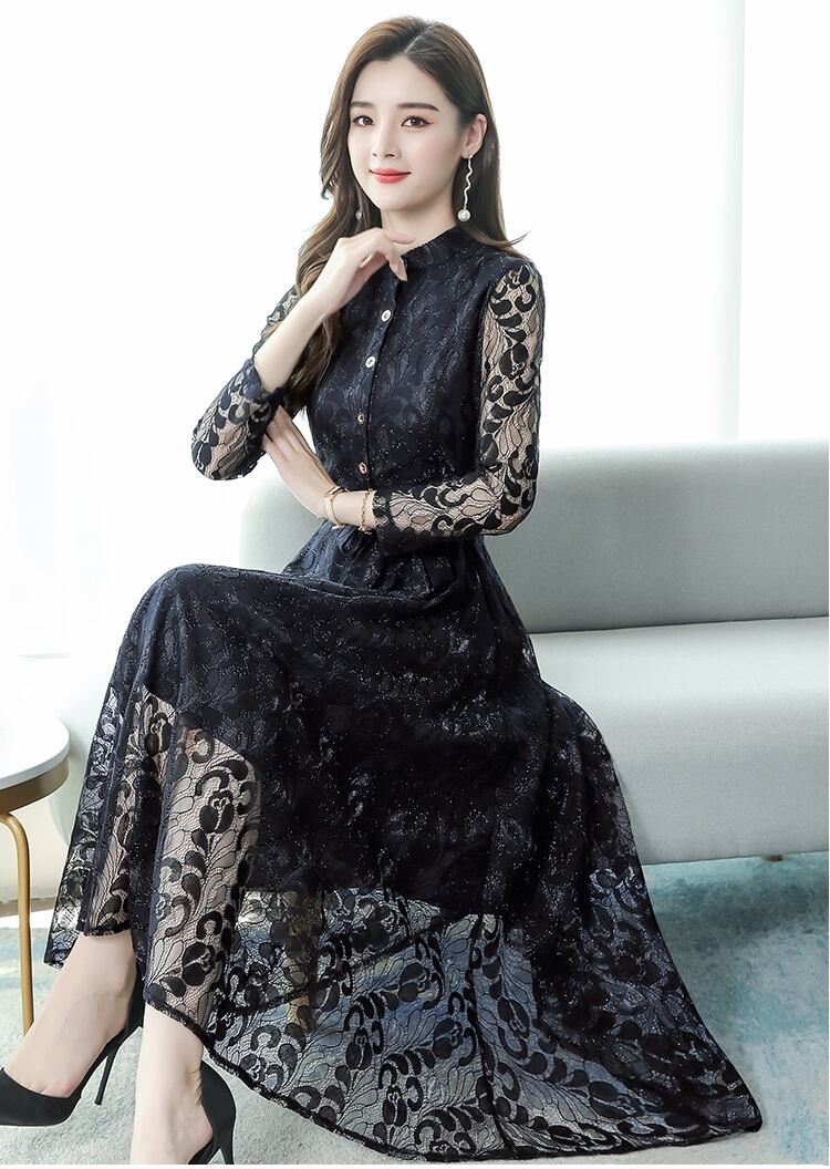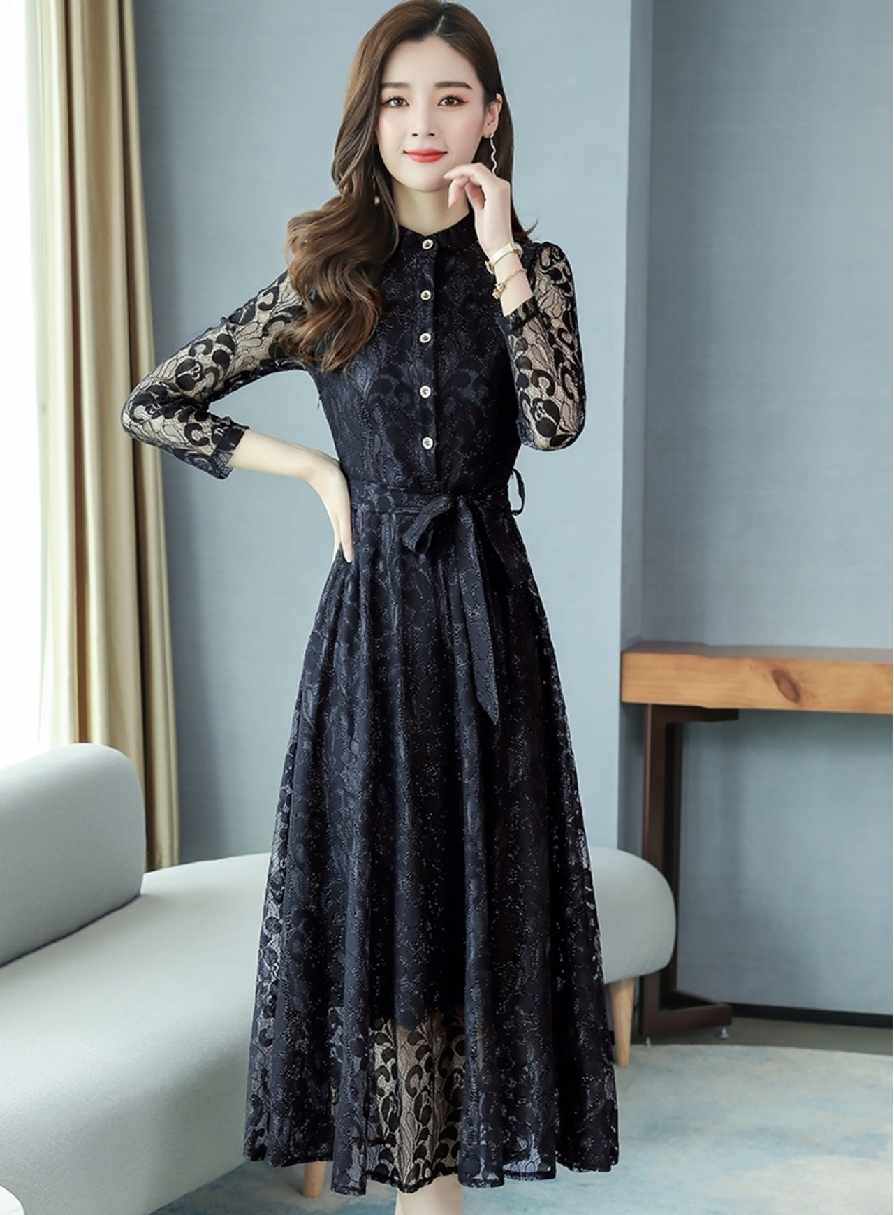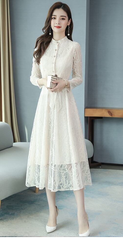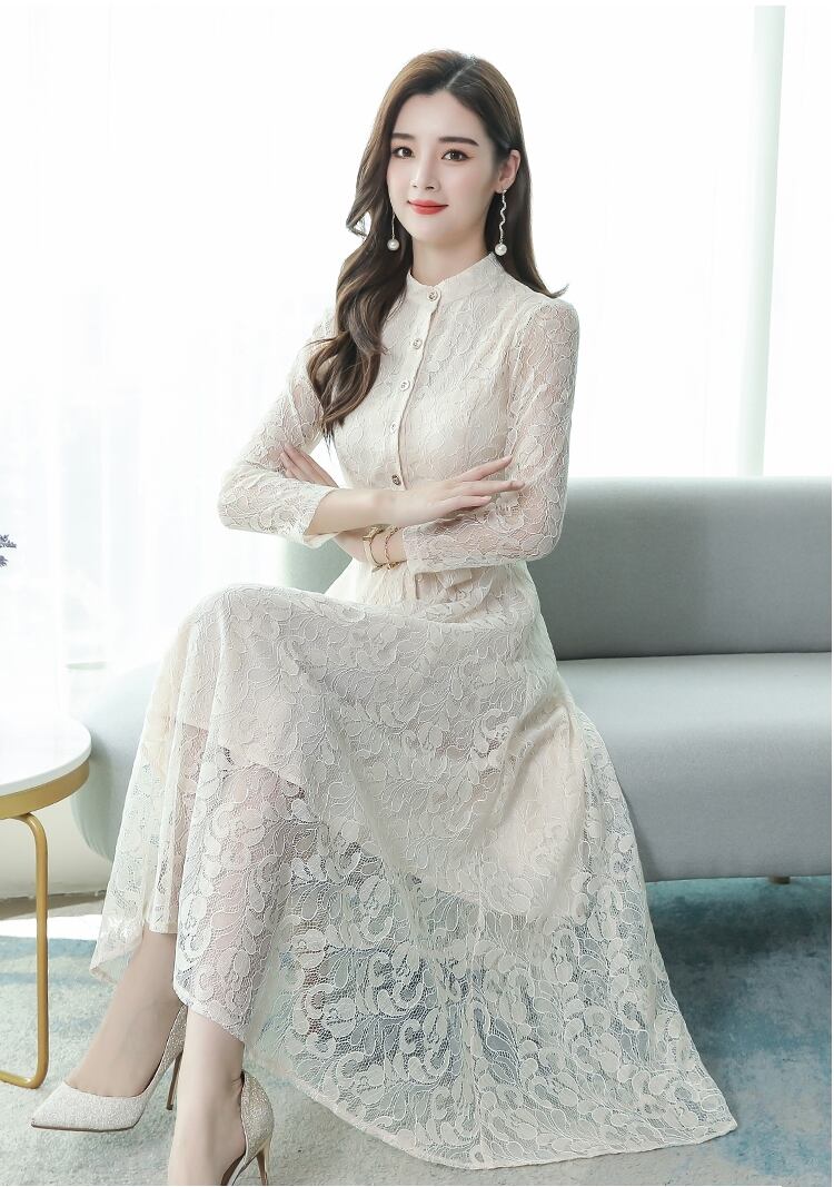 全5色ドレス ワンピース 総レース 花柄 ロング丈 フロントボタン クルーネック ウエストリボン 大人可愛い 上品 エレガント きれいめ お呼ばれ パーティー シック フレア 結婚式 春 夏
