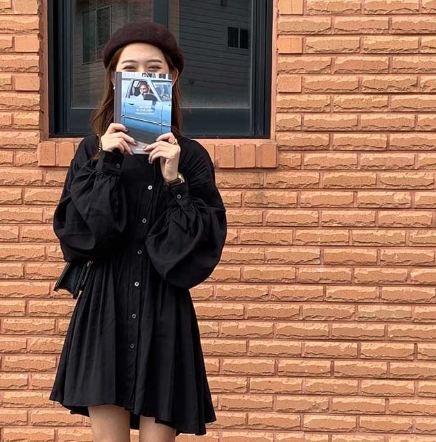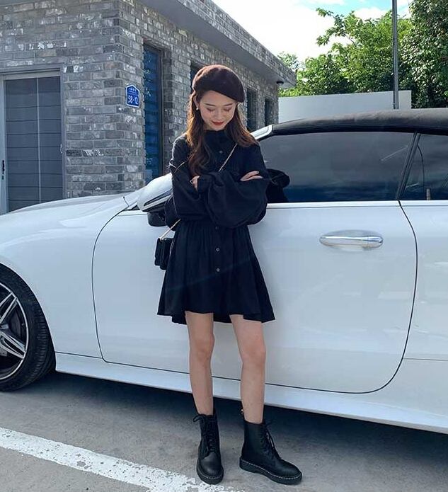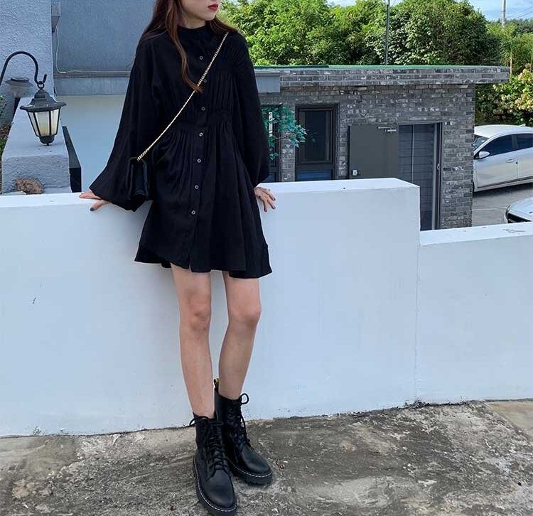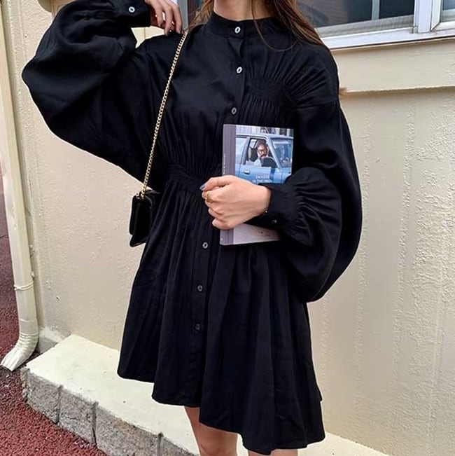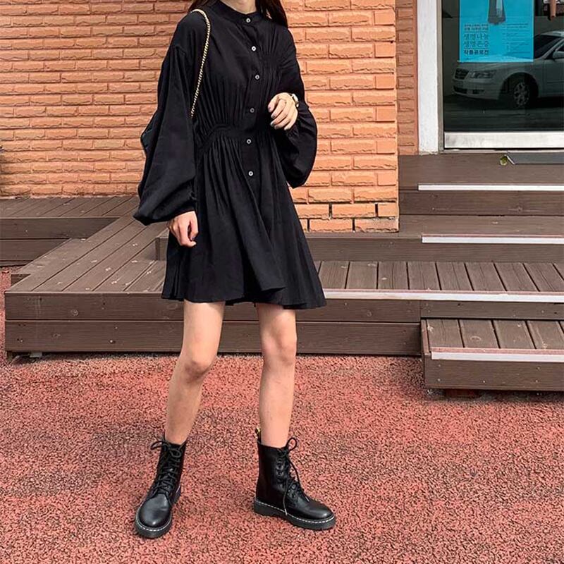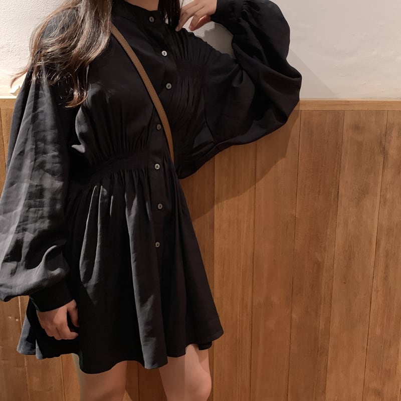 ワンピース ミニ丈 シャツワンピース フロントボタン スタンドカラー パフスリーブ 無地 ゆったり フレア ランタンスリーブ ウエストマーク ガーリー 大人可愛い カジュアル デート 韓国ファッション 春 夏