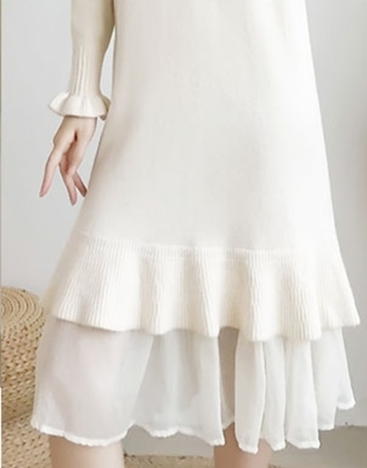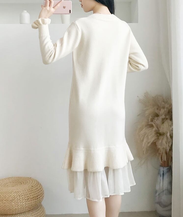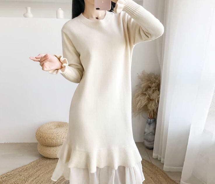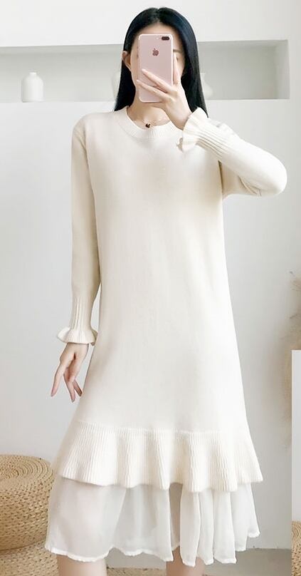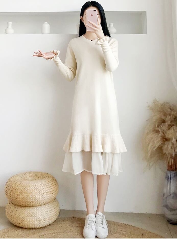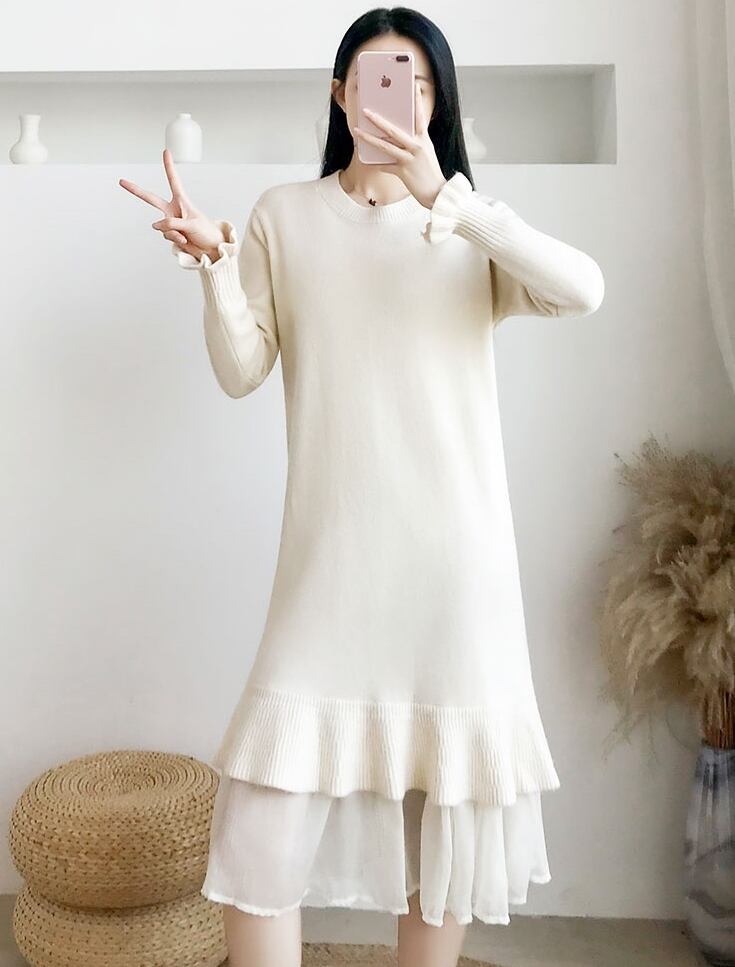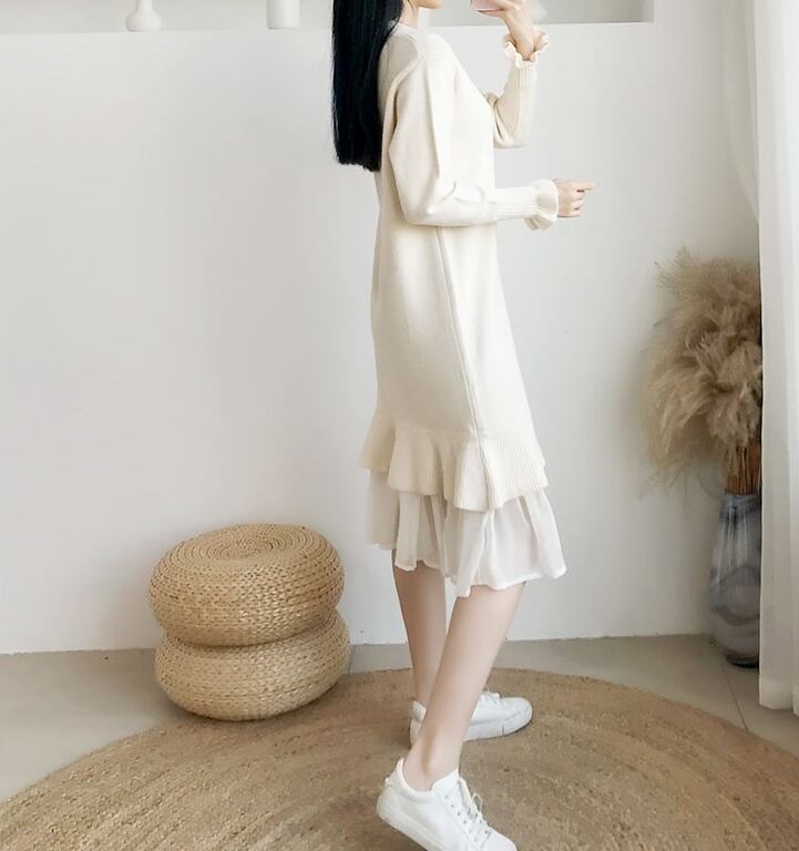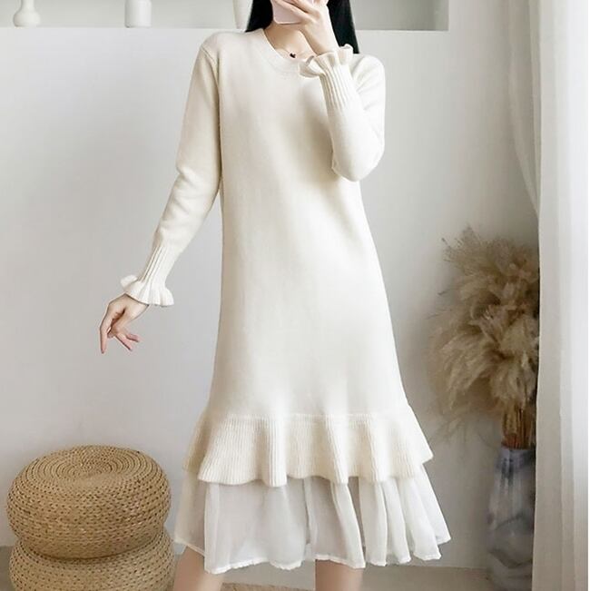 ワンピース ニットワンピース ミモレ丈 フリル マーメイド ゆったり トランペットスリーブ レイヤード風 長袖 クルーネック 無地 上品 カジュアル デイリー シンプル 大人可愛い 韓国ファッション デート 女子会 春 冬