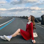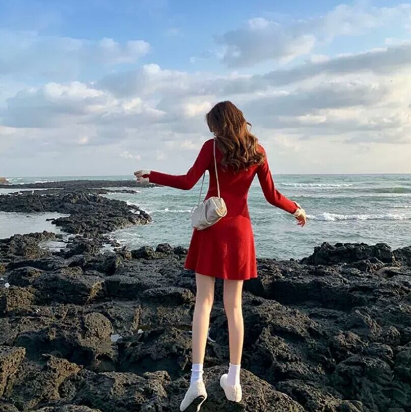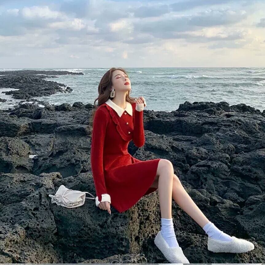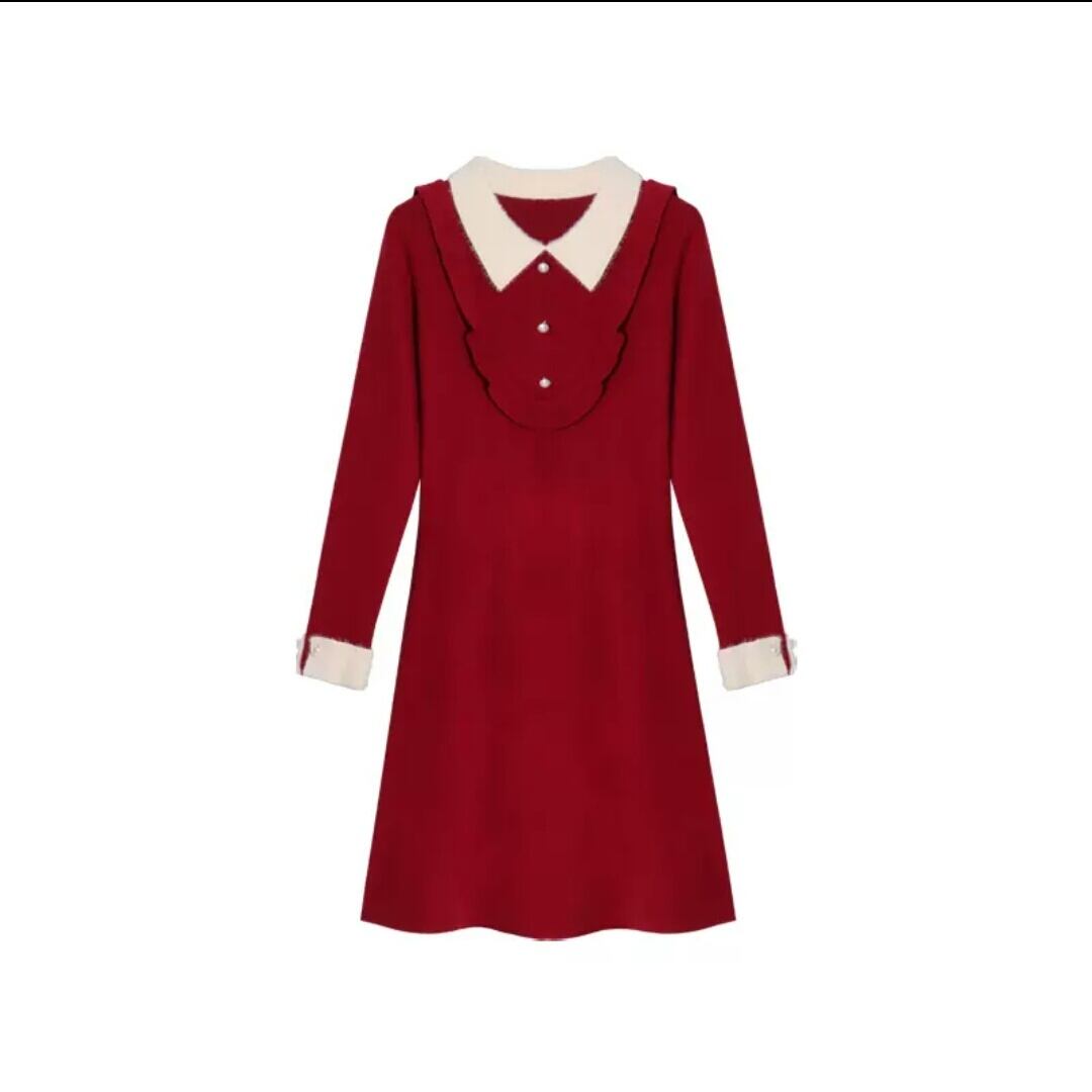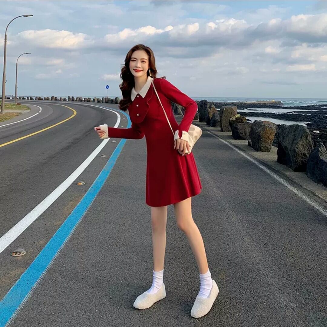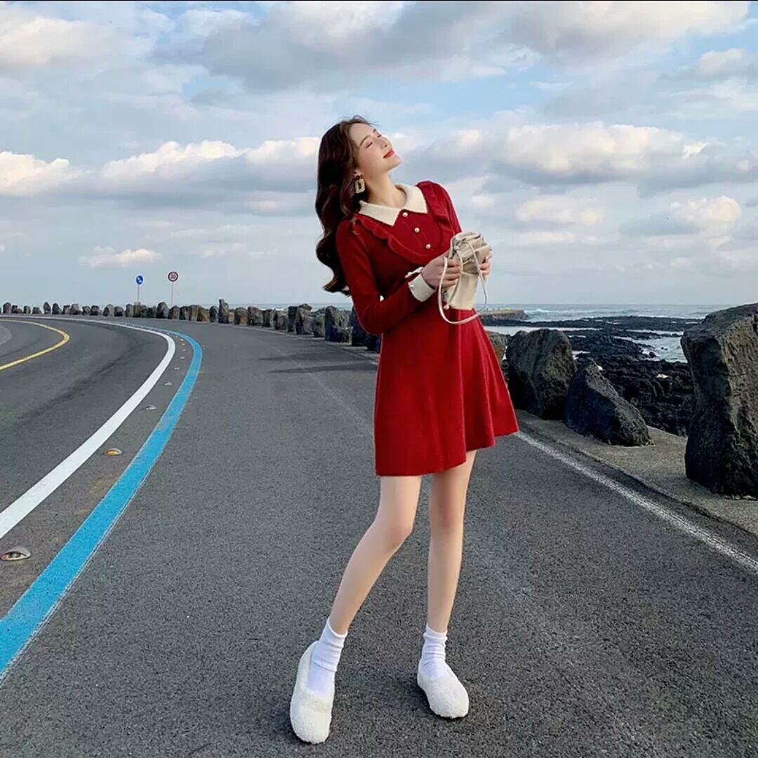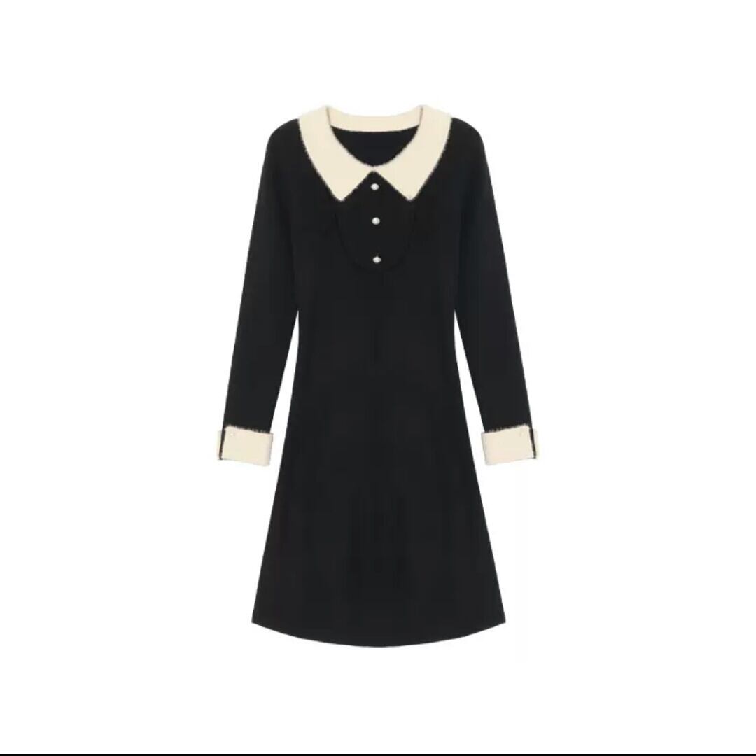 全2色 襟つき ハイウエスト ショート丈 ワンピース ドレス 大人 カジュアル キレイめ 可愛い お出かけ お買い物 デート 女子会 春 秋 通学 学生 通勤 韓国ファッション