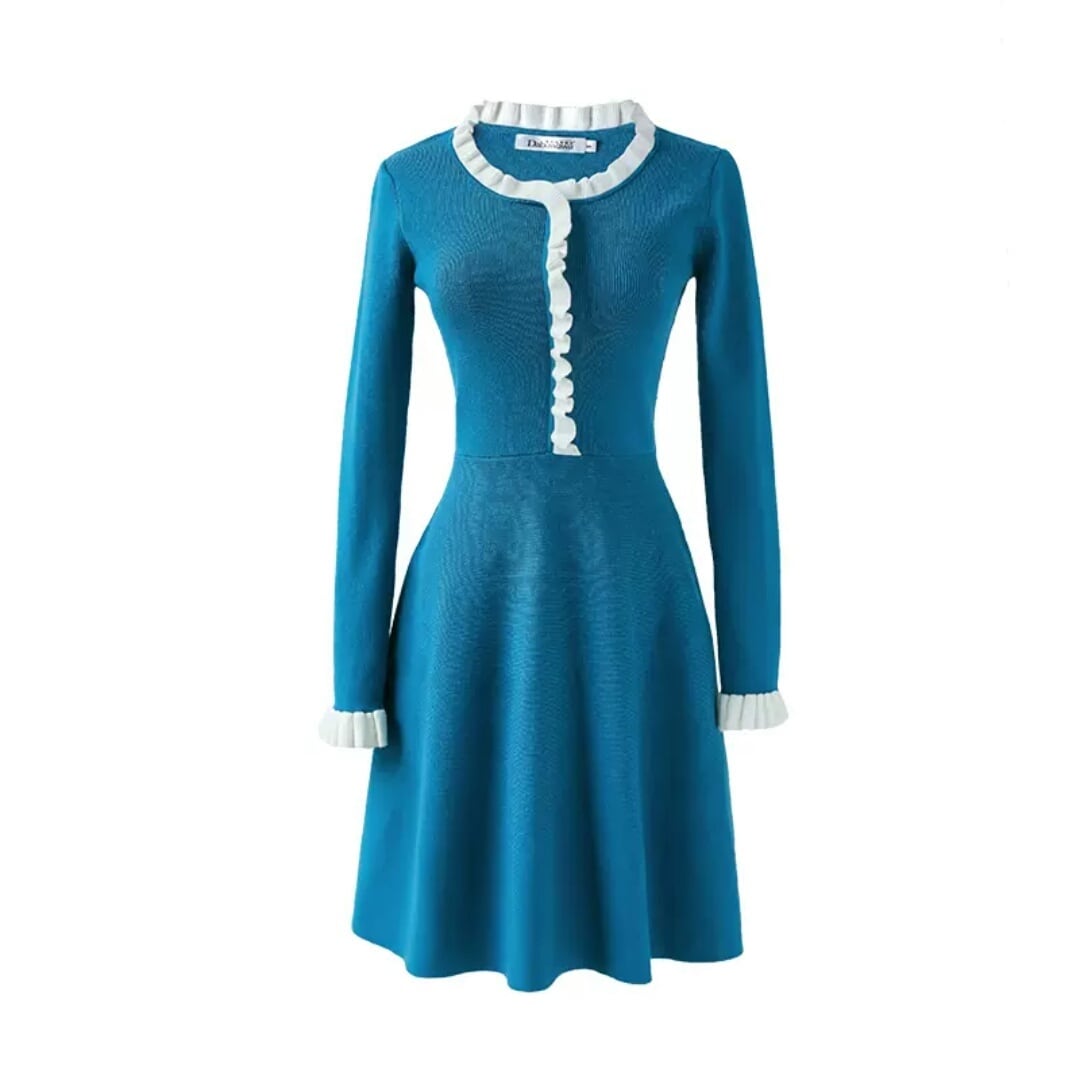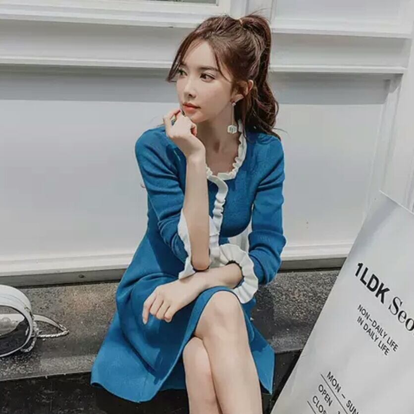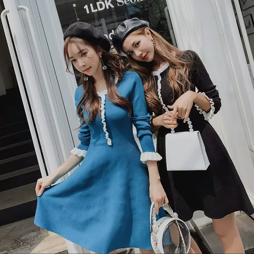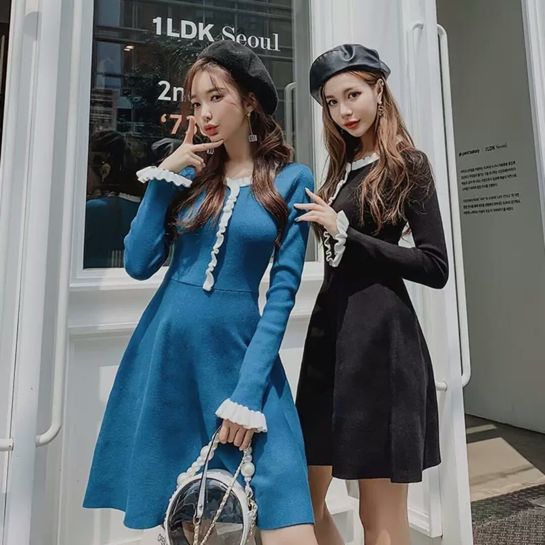 全2色 ラウンドネック ニット フリル ワンピース ドレス Aライン ハイウエスト ショート丈 大人 可愛い カジュアル キレイめ お出かけ お買い物 デート 女子会 春 秋 通学 学生 通勤 韓国ファッション