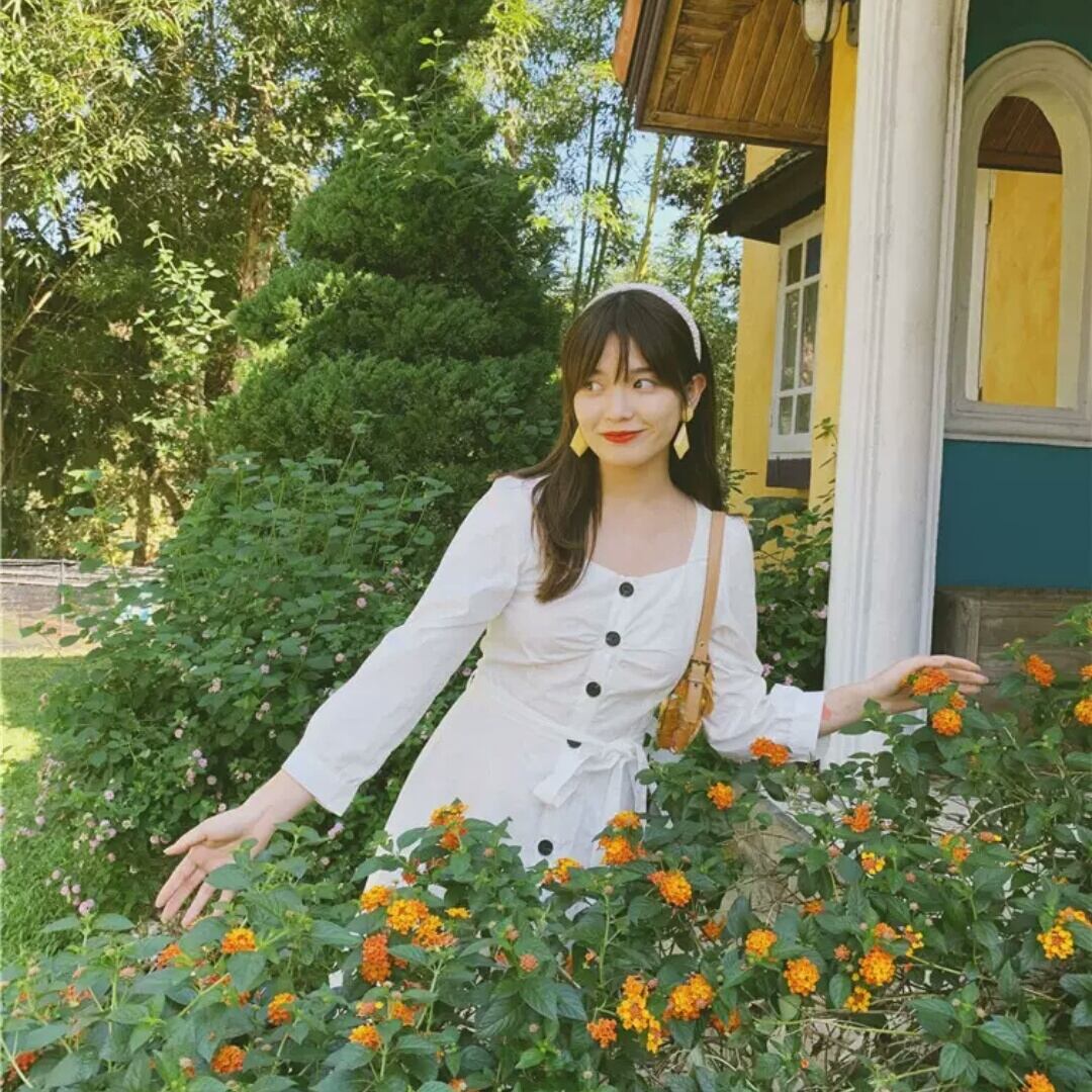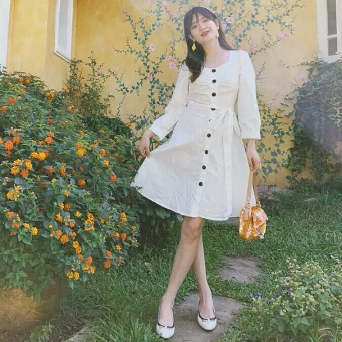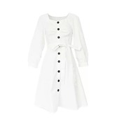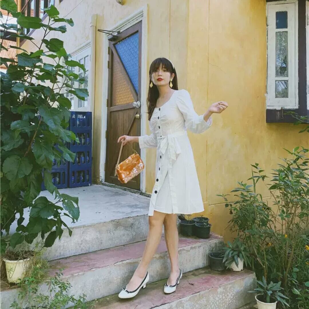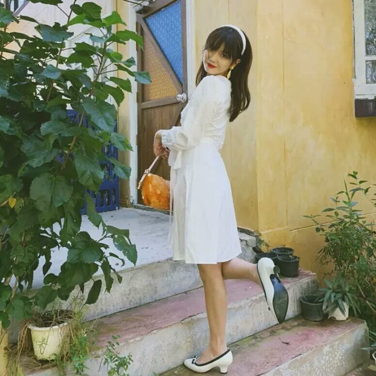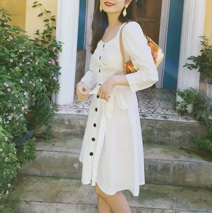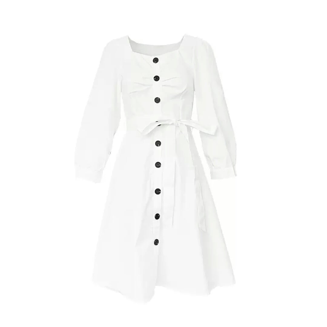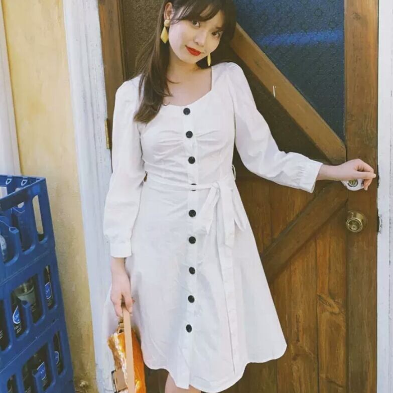 長袖 コットン ワンピース ひざ丈 ベルト リボン ボタン 白 ホワイト 大人 カジュアル 可愛い キレイめ お出かけ お買い物 デート 女子会 春 夏 通学 学生 通勤 韓国ファッション