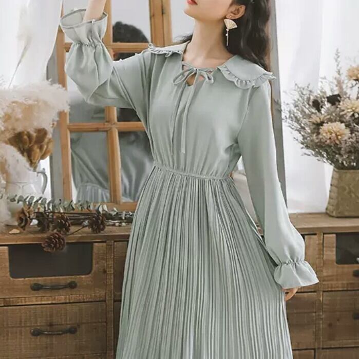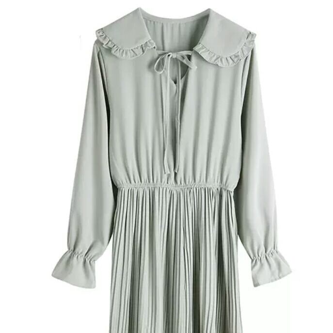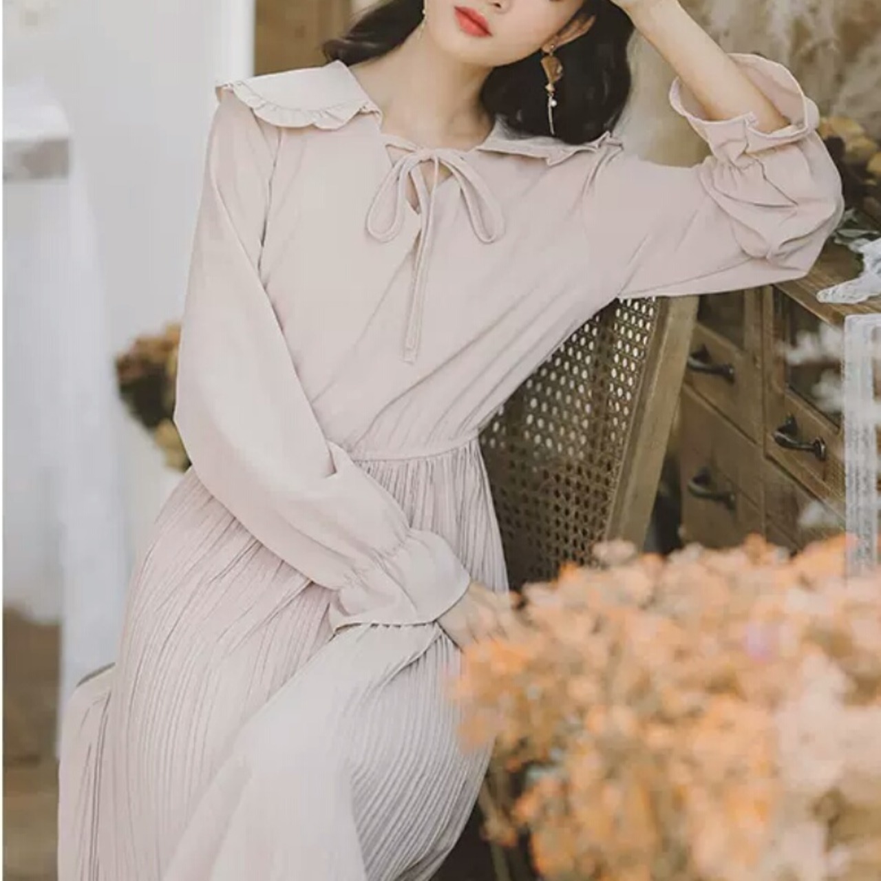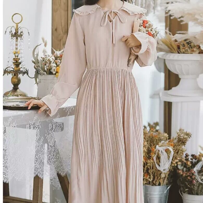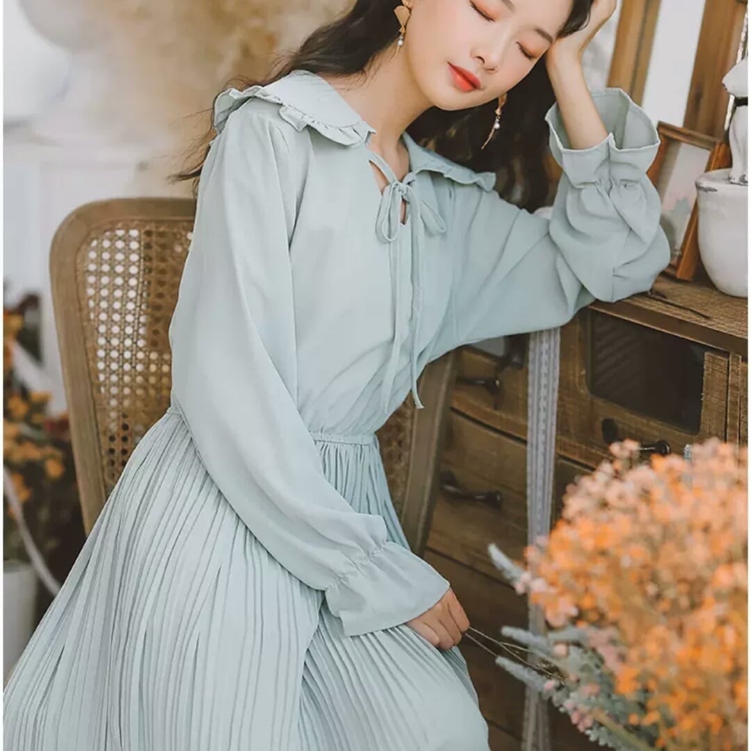 全2色 襟つき リボン プリーツ ロング丈 ワンピース ドレス 無地 シンプル 大人 カジュアル キレイめ 可愛い エレガント 上品 お出かけ お買い物 デート 女子会 春 秋 夏 通学 学生 通勤 韓国ファッション