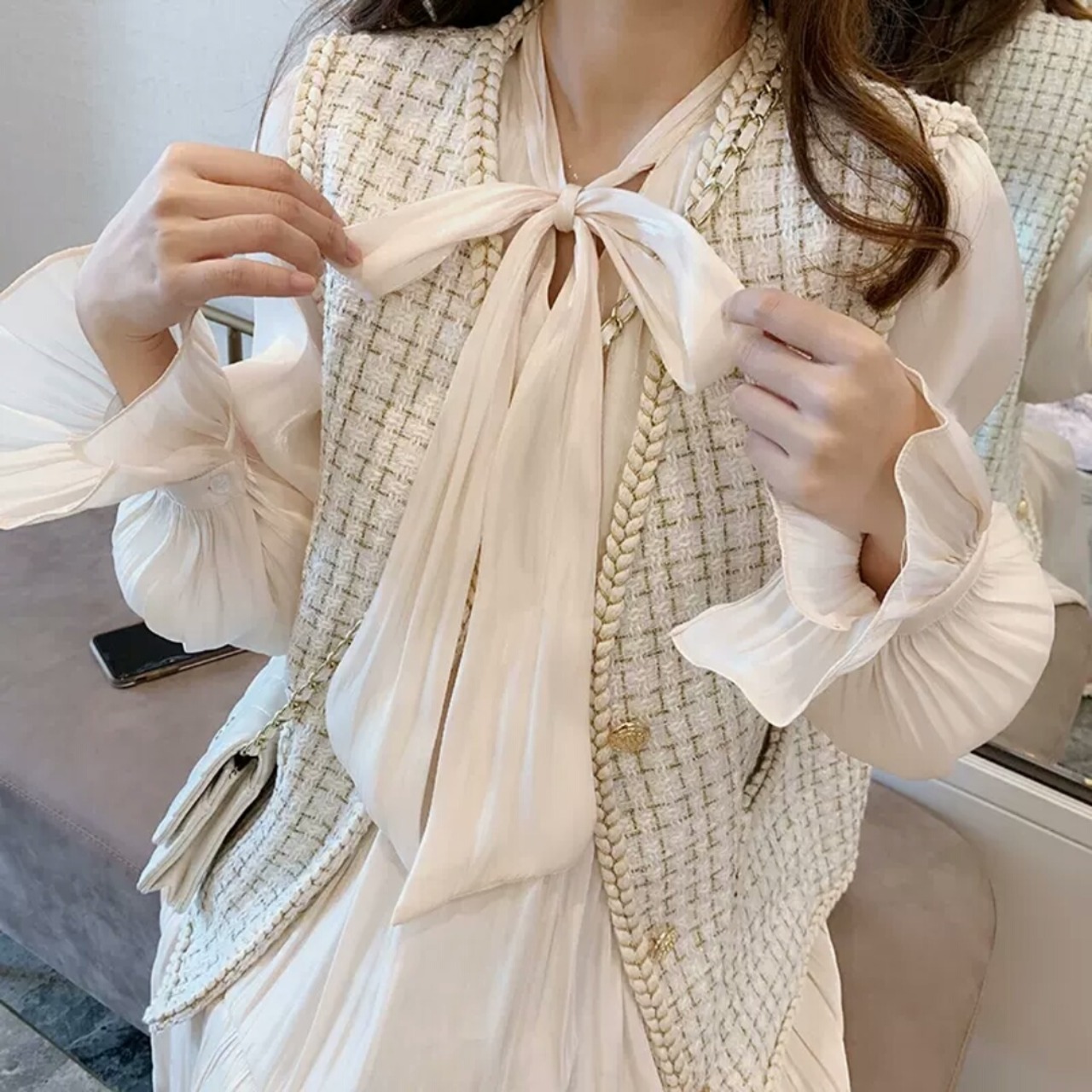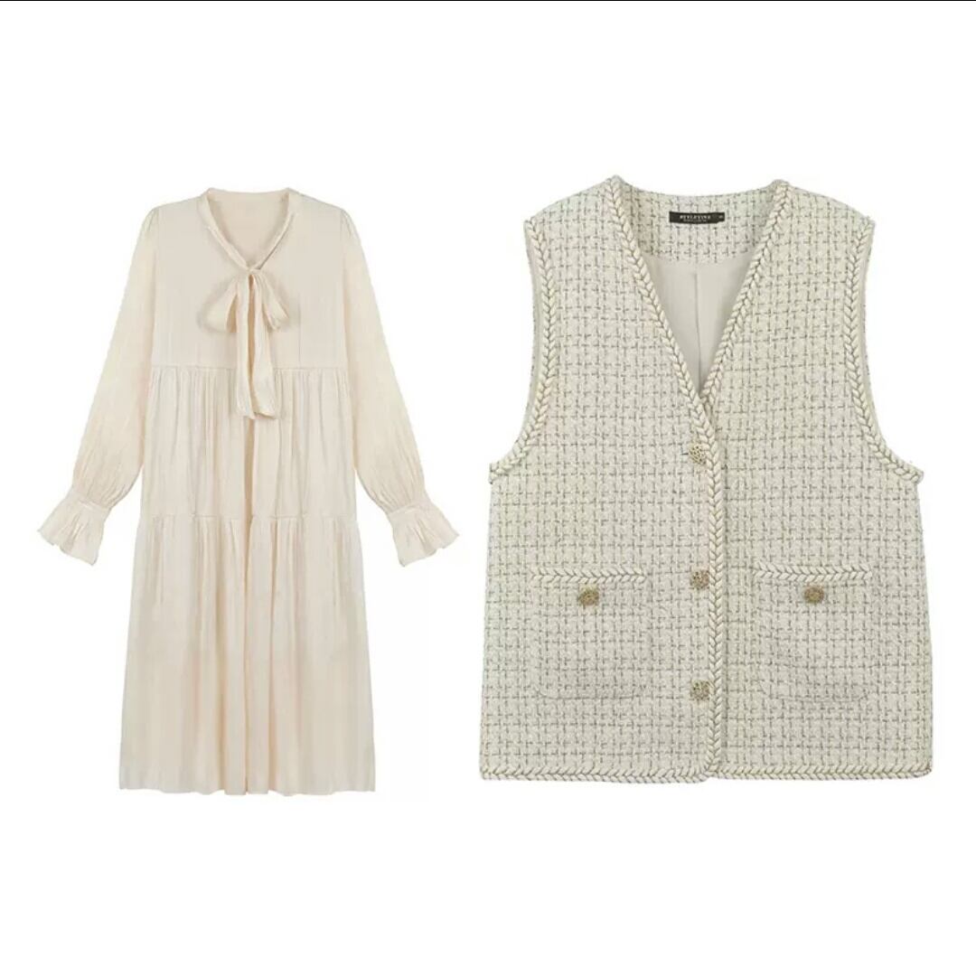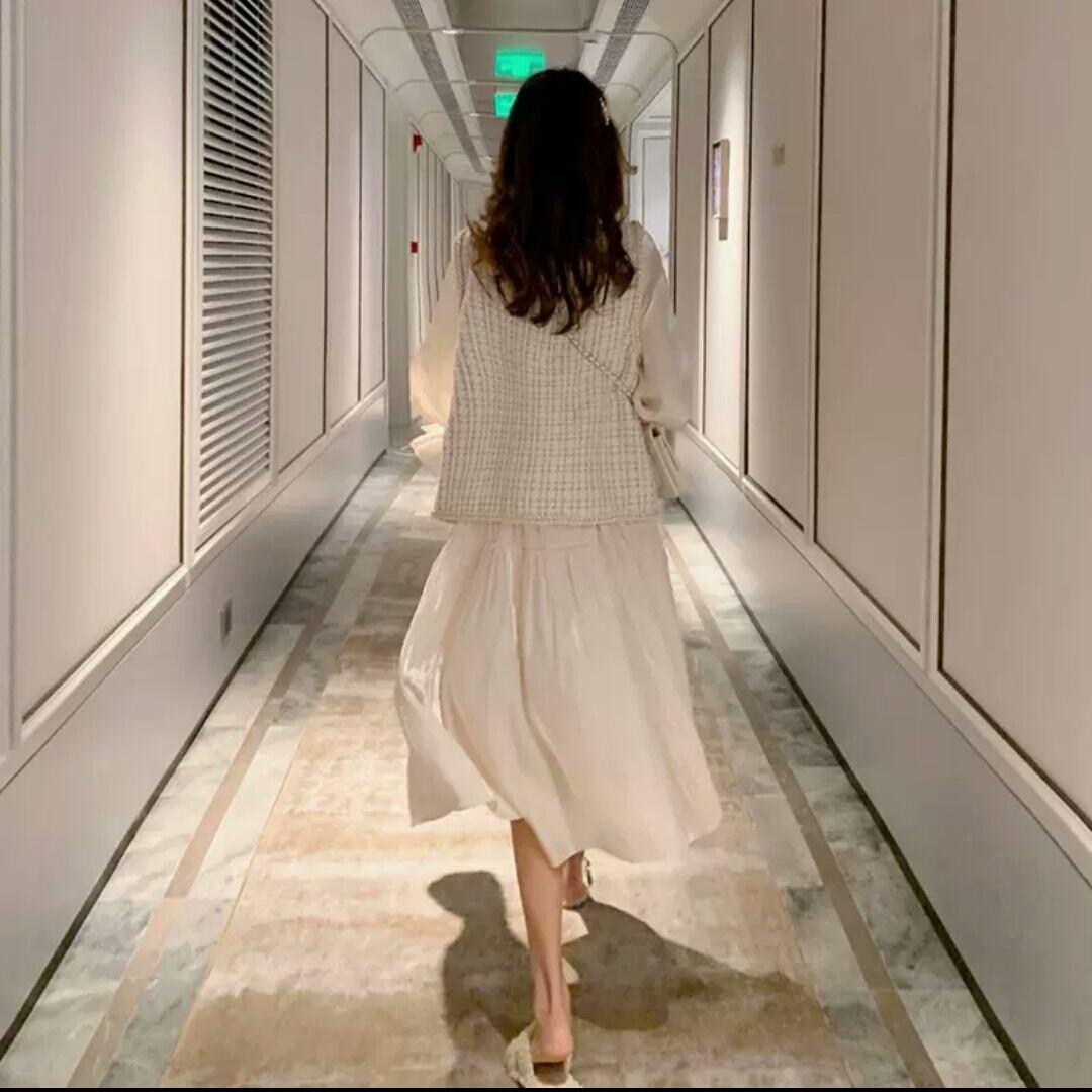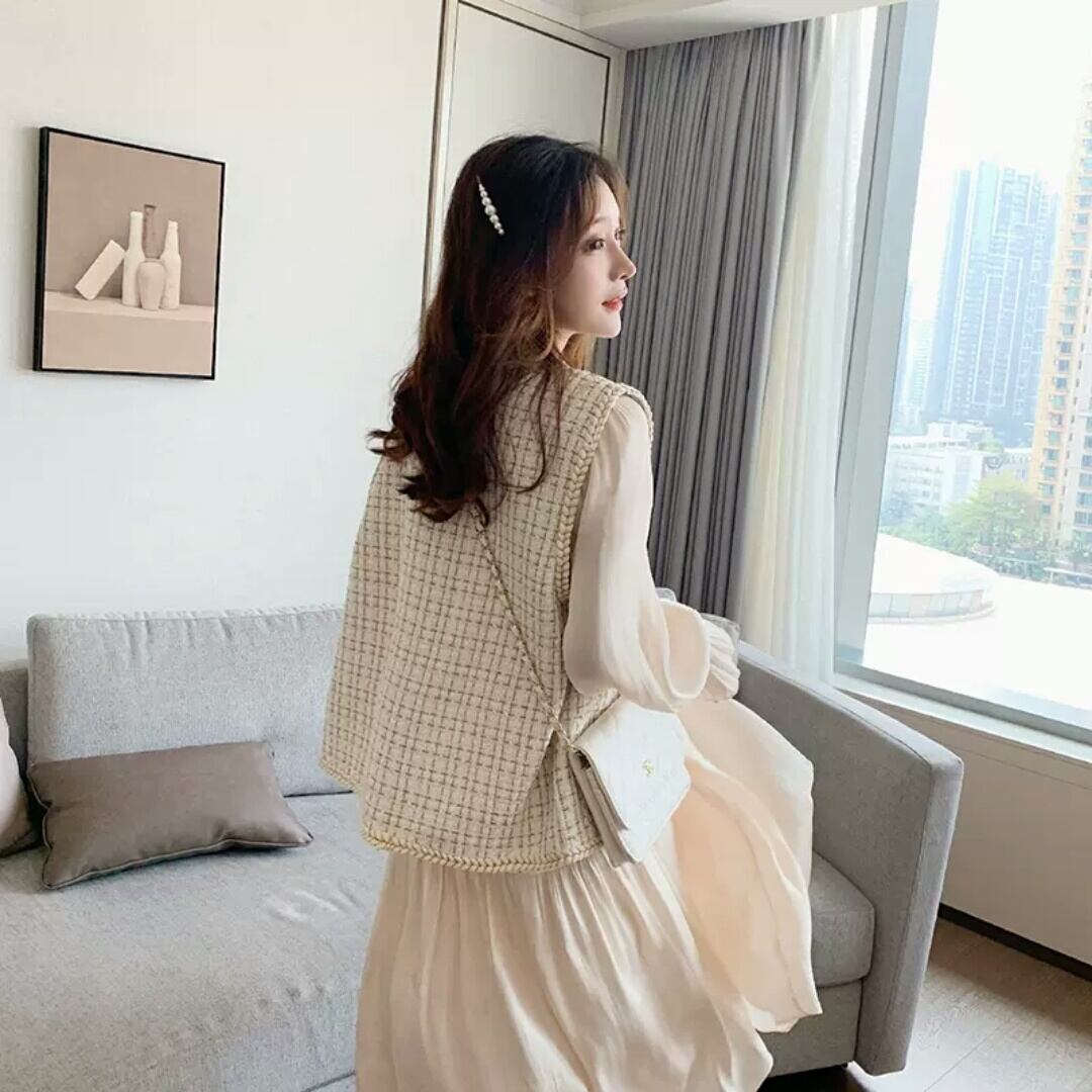 全2種 シフォンワンピース ベスト ツーピース セットアップ ロング丈 ツイード 大人 可愛い カジュアル キレイめ 上品 お出かけ お買い物 デート 女子会 春 秋 通学 学生 通勤 韓国ファッション