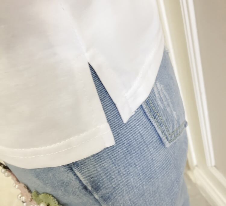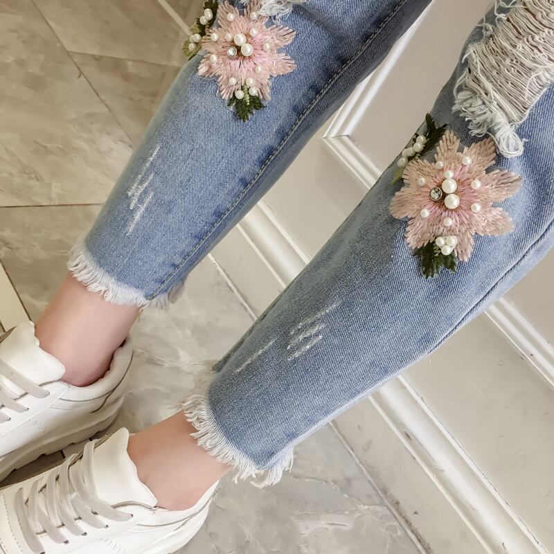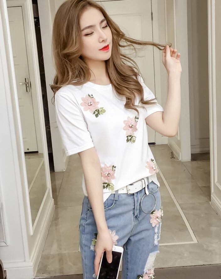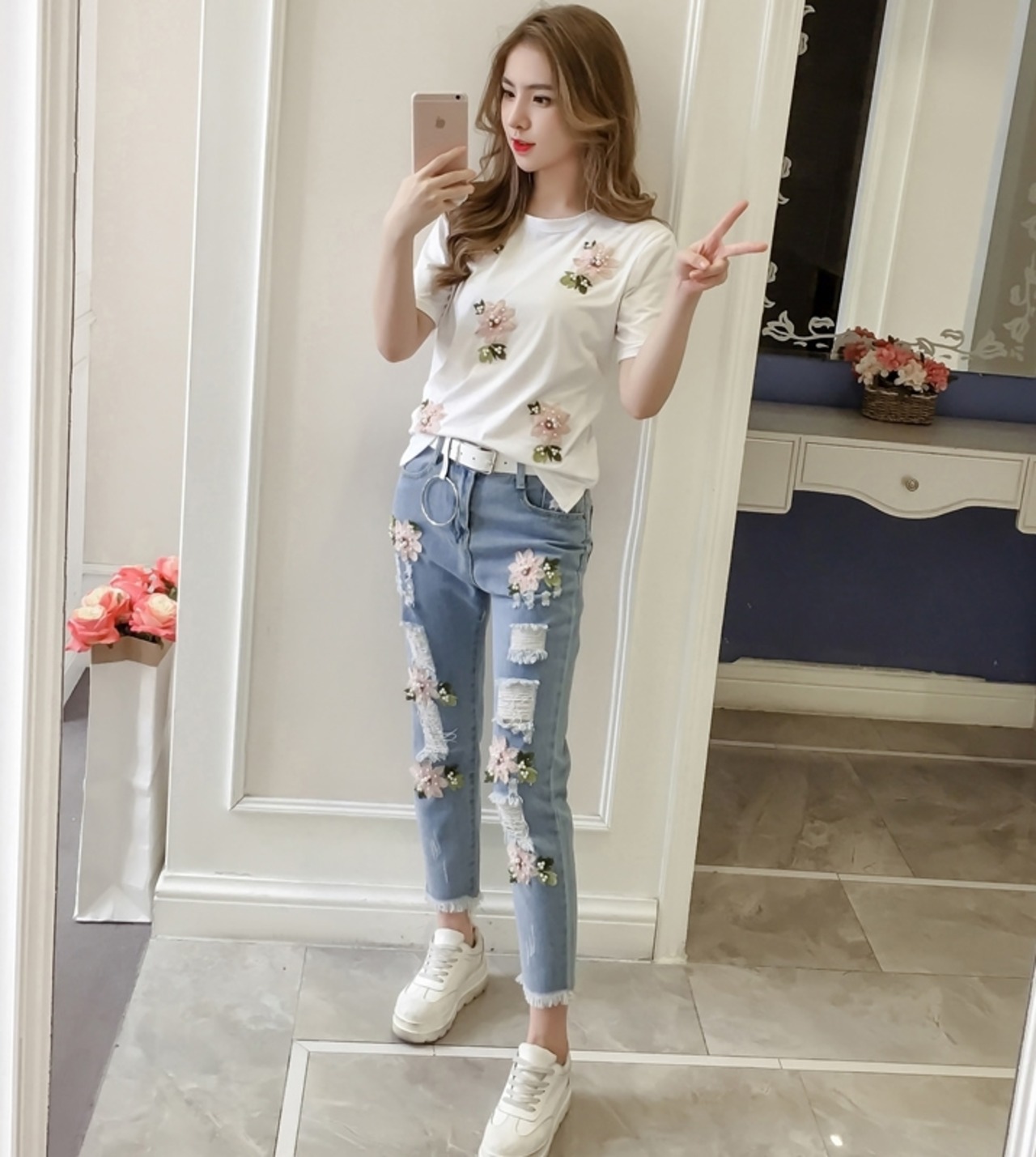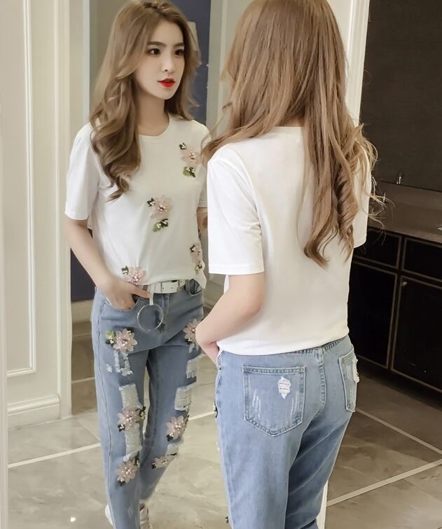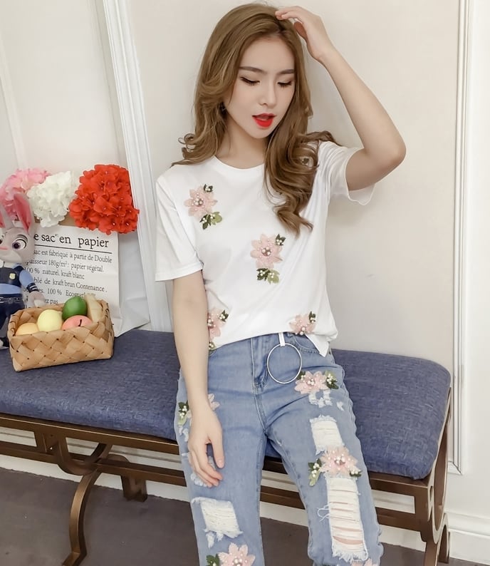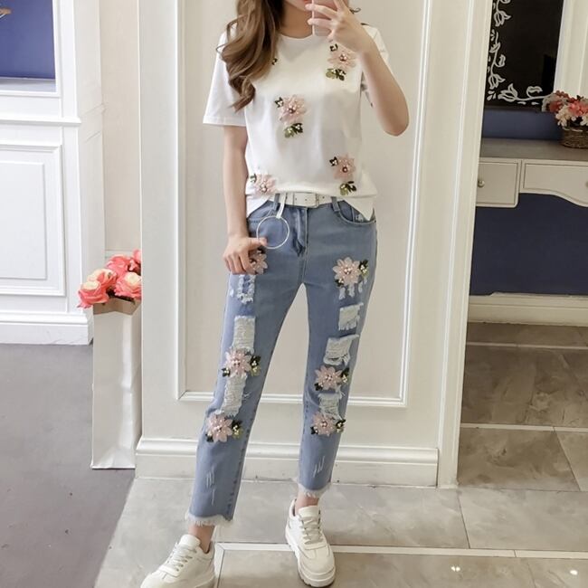 セットアップ ツーピース 刺繍 花柄 Tシャツ パンツ トップス ベルト ダメージジーンズ デニムパンツ 9分丈 ジーンズ 半袖 パール カジュアル 上品 韓国ファッション ガーリー 大人可愛い ゆったりめ 春 夏