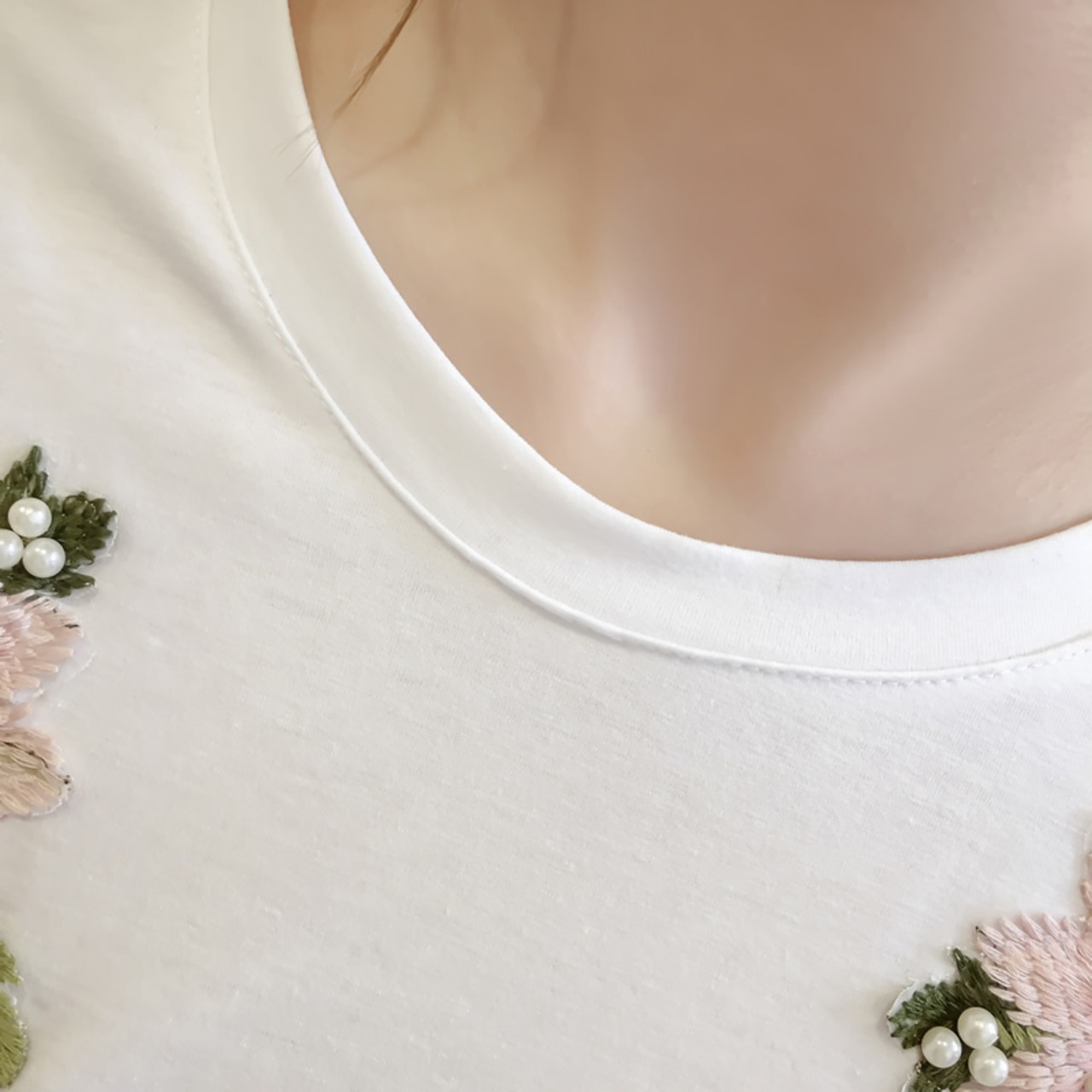 お花の刺繍がフェミニンなTシャツとデニムパンツの2点セットです。