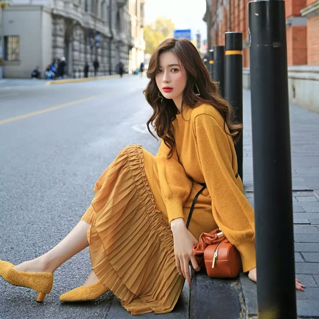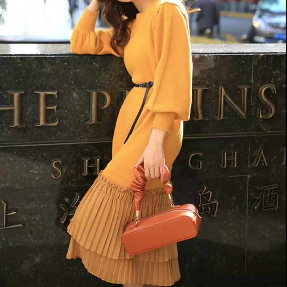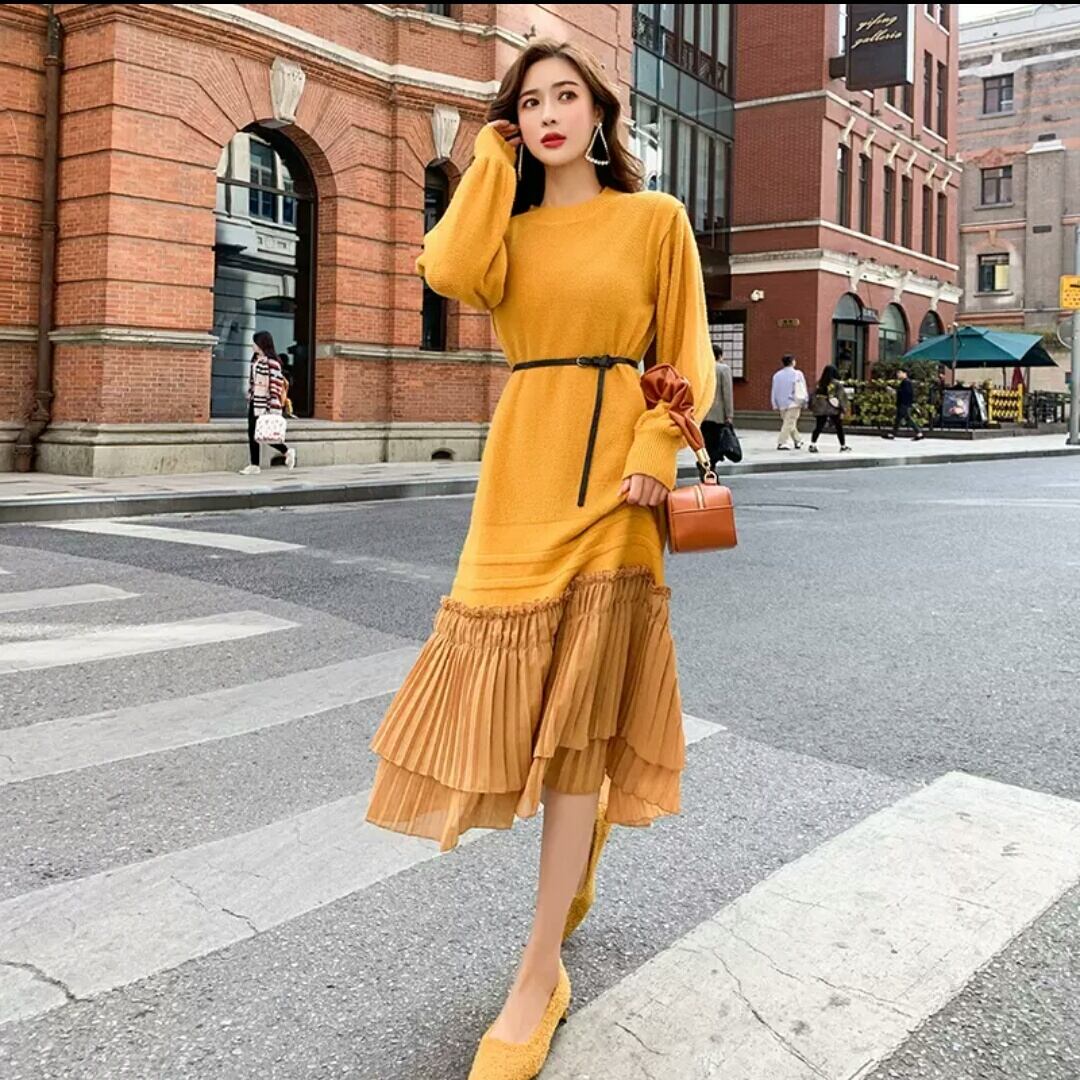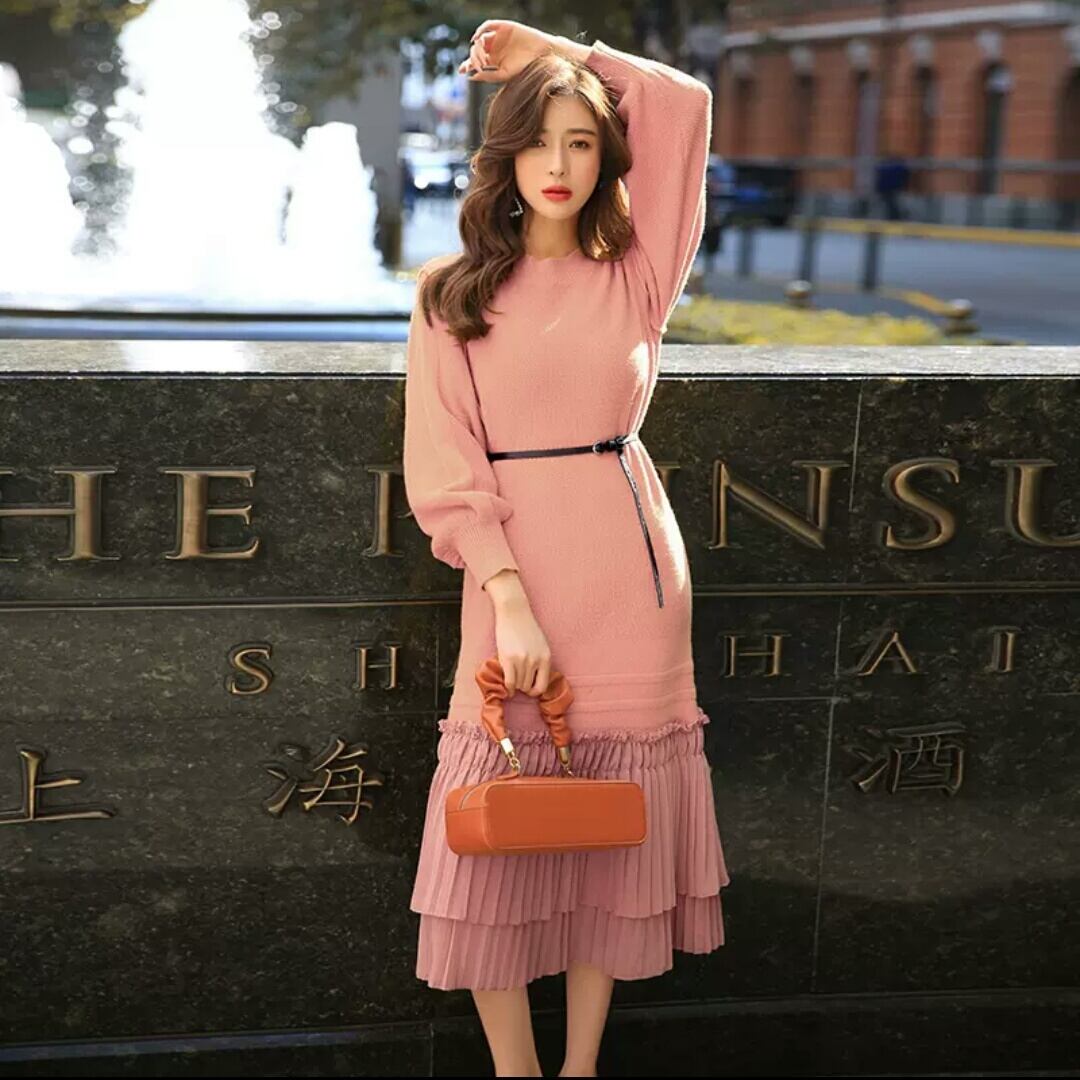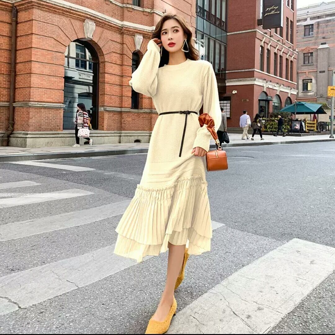 全3色 ロング丈 ニット フリル ワンピース シフォン 長袖 大人 可愛い カジュアル キレイめ 上品 エレガント お出かけ お買い物 デート 女子会 春 秋 通学 学生 通勤 韓国ファッション