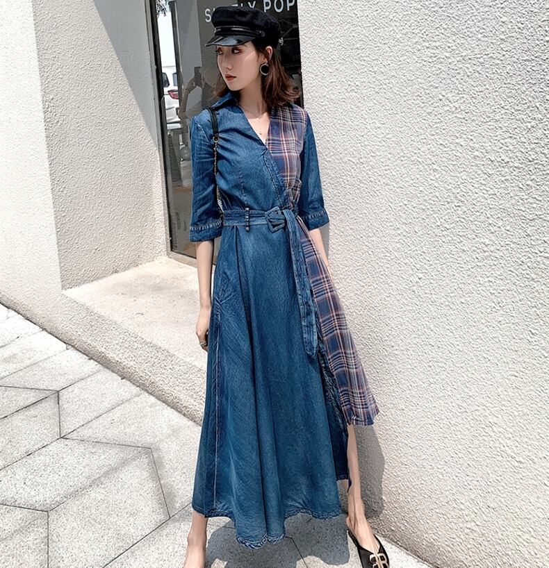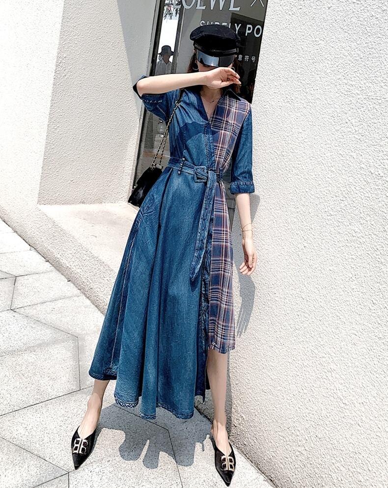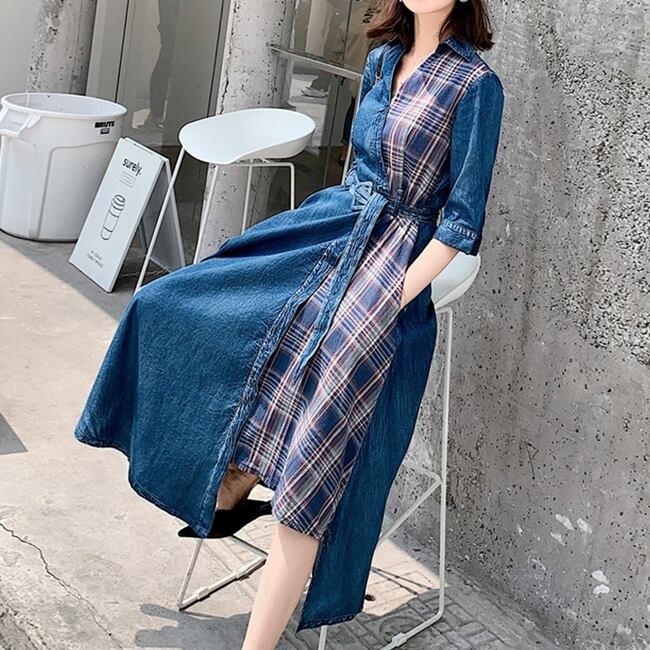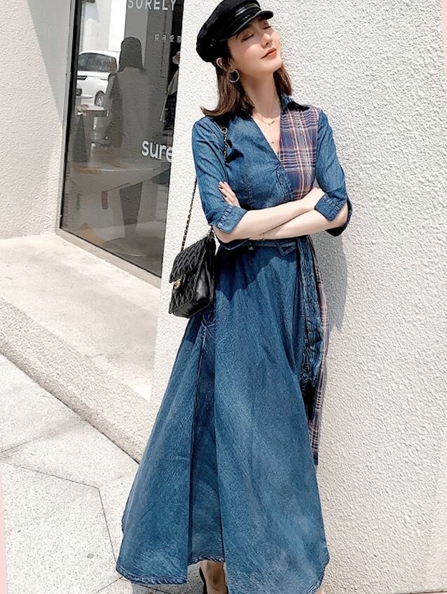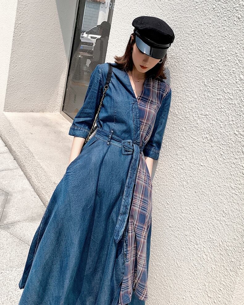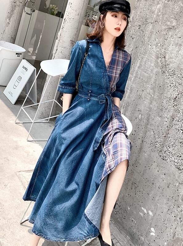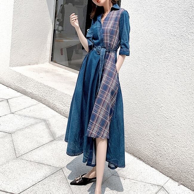 ワンピース ロング丈 チェック柄 デニムワンピース Vネック 7分袖 Aライン ウエストベルト ユニーク ハイウエストフロントボタン フレア アシンメトリー 上品 ジーンズ カジュアル 大人 夏 春