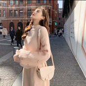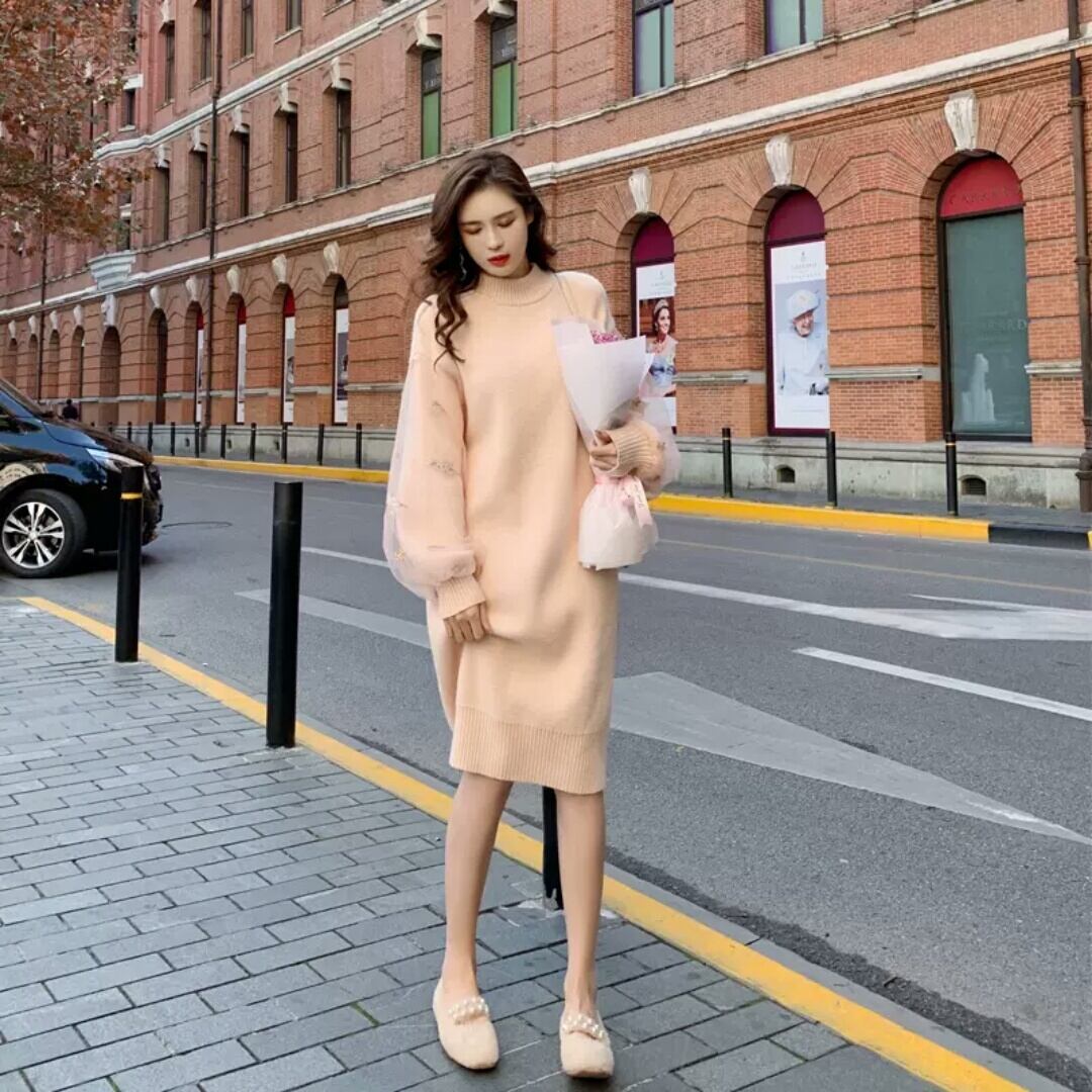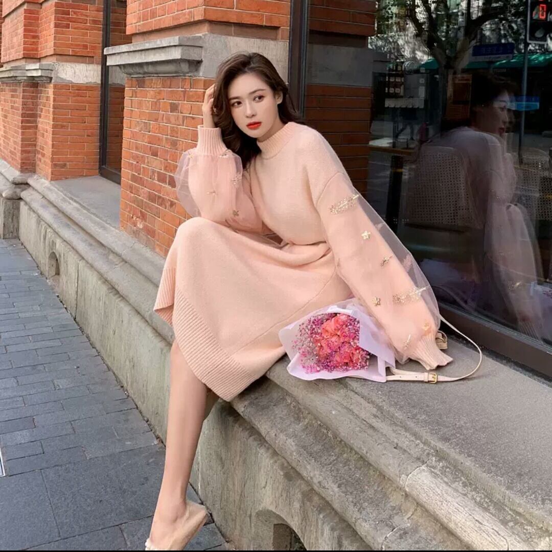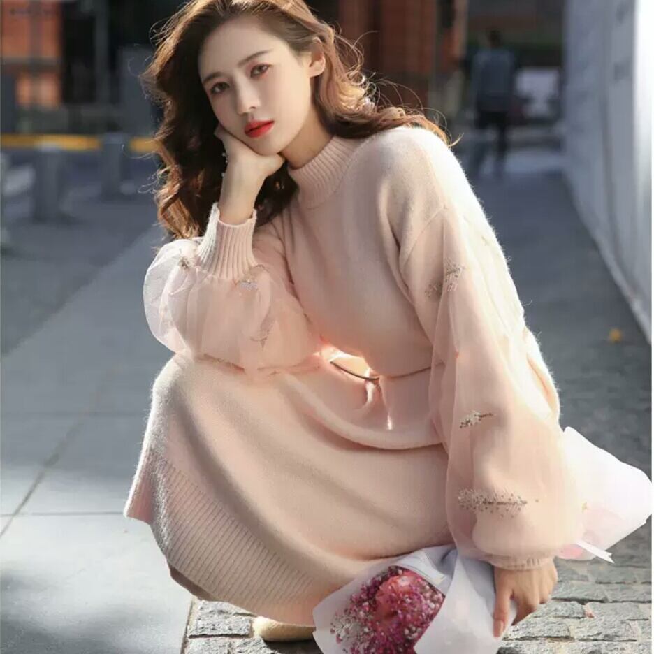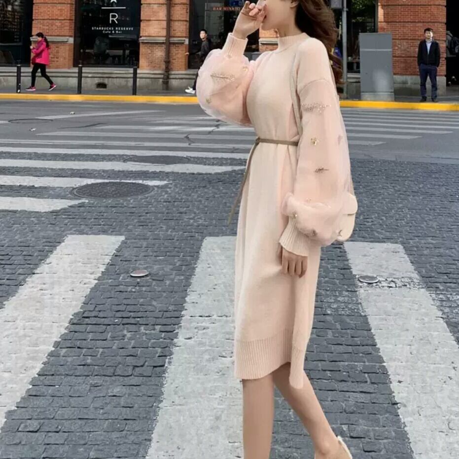 ランタンスリーブ 長袖 ニット ワンピース ラウンドネック 大人 可愛い カジュアル キレイめ 上品 エレガント お出かけ お買い物 デート 女子会 春 秋 通学 学生 通勤 韓国ファッション