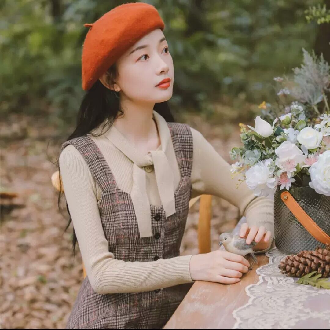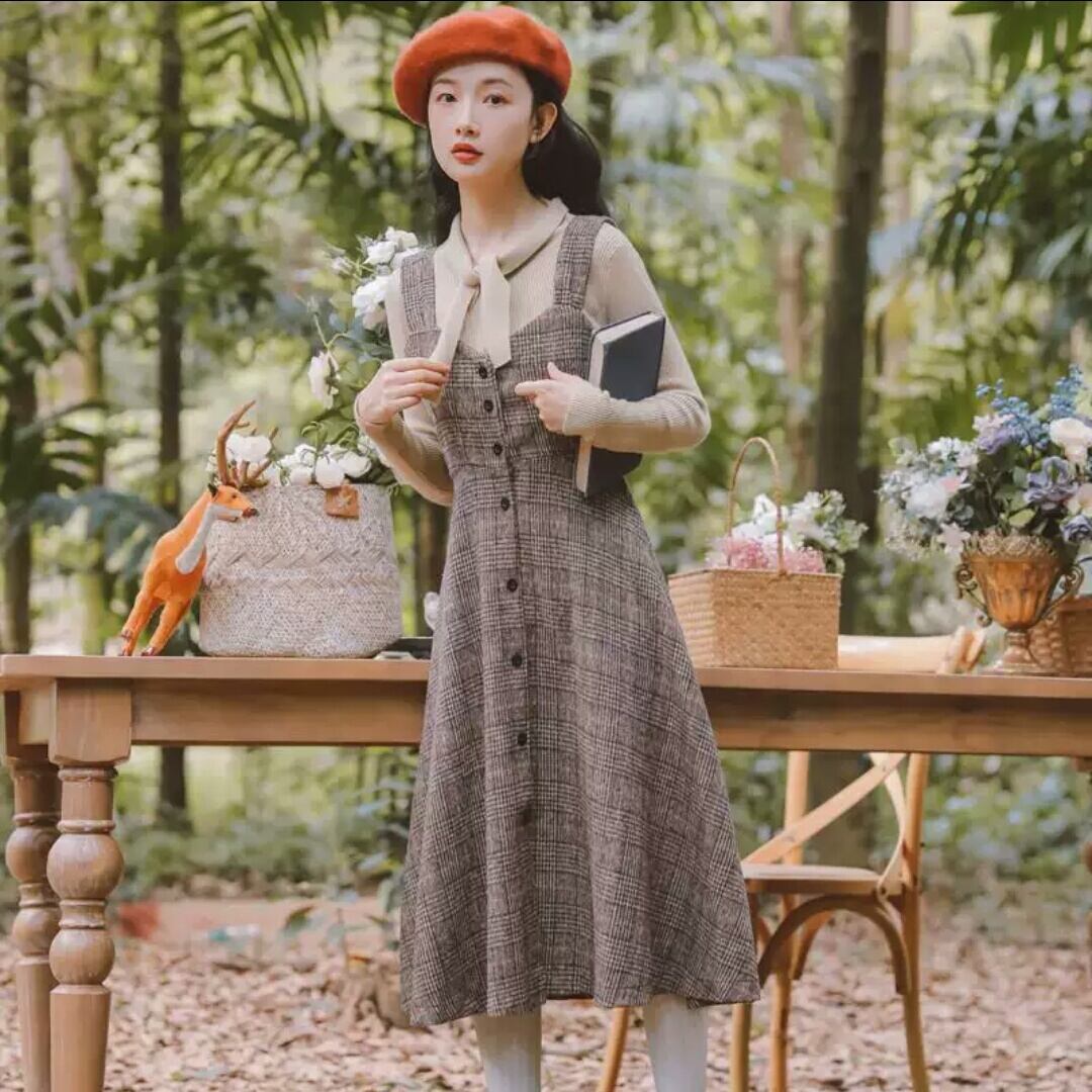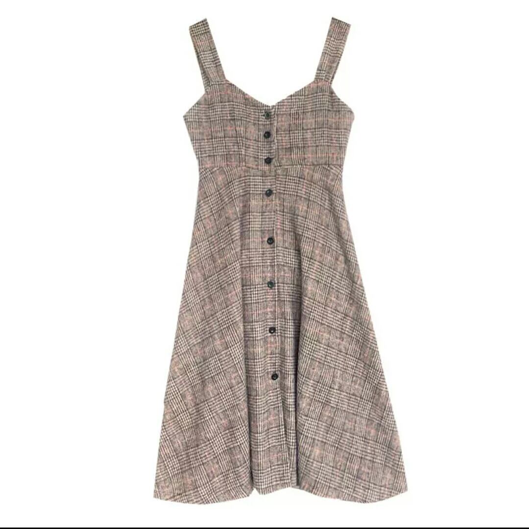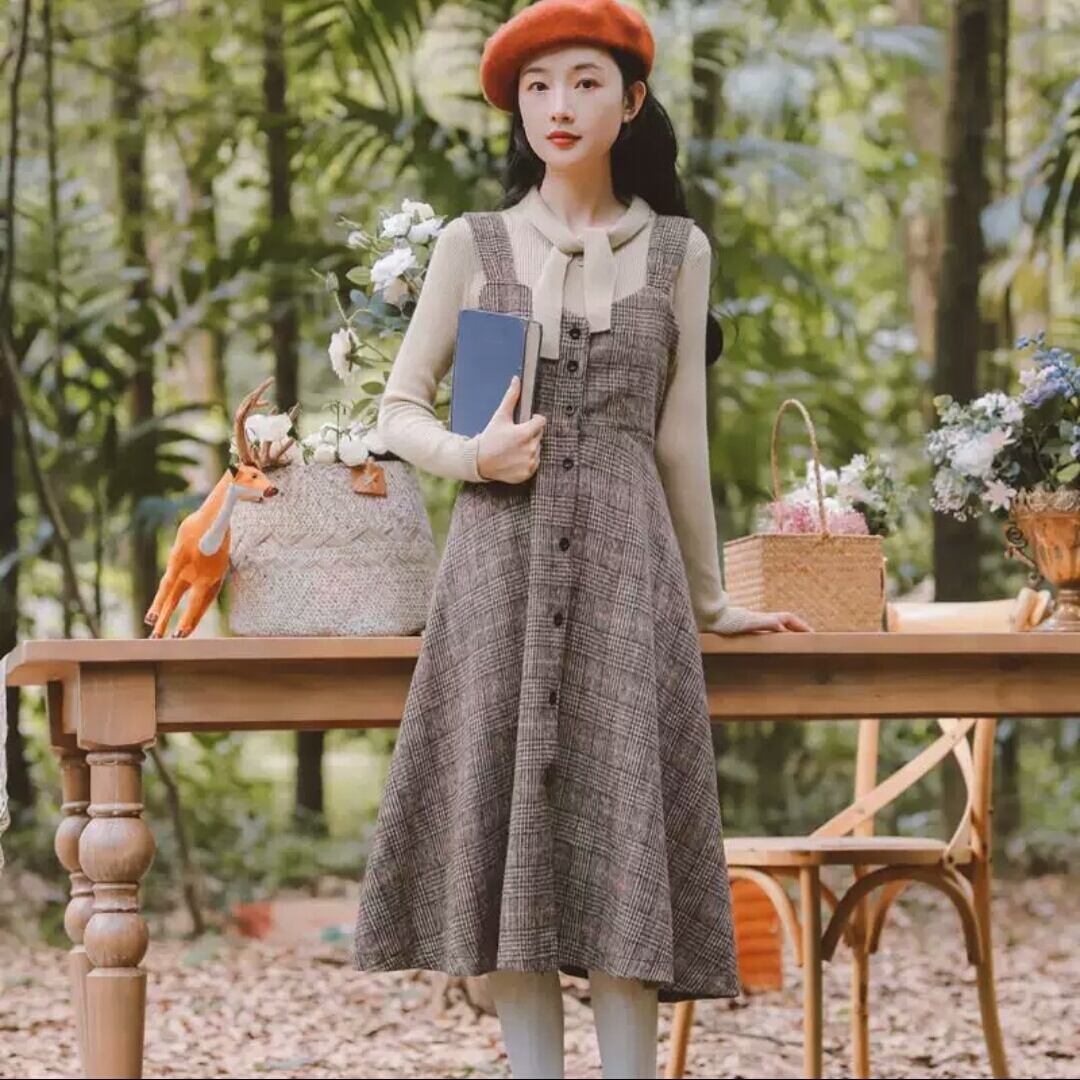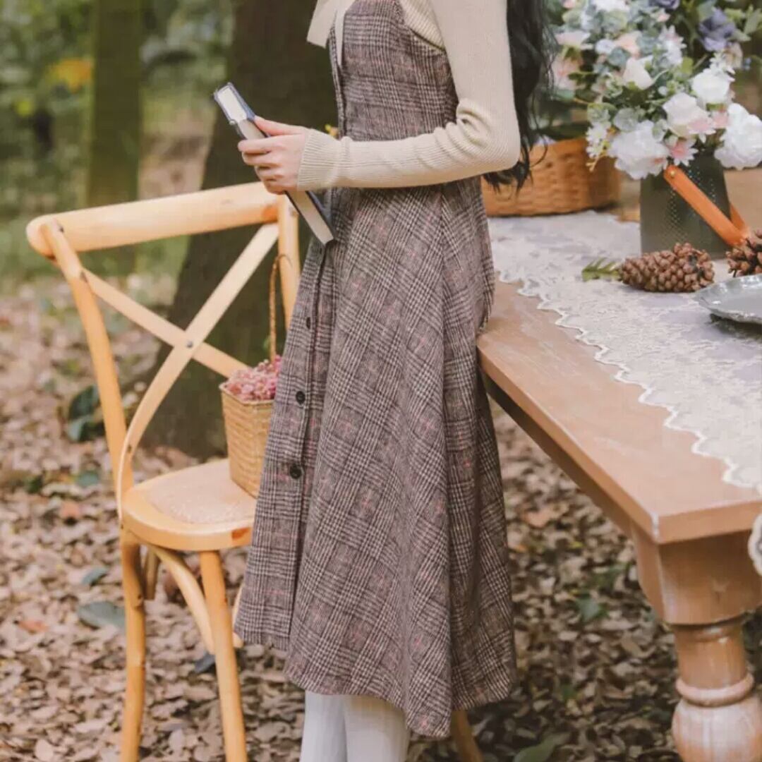 チェック柄 ストラップ ワンピース ロング丈 大人 可愛い キレイめ カジュアル お出かけ お買い物 デート 女子会 春 秋 通学 学生 通勤 韓国ファッション