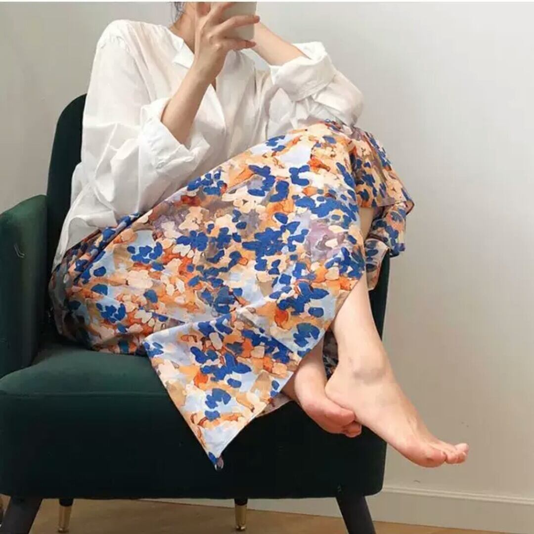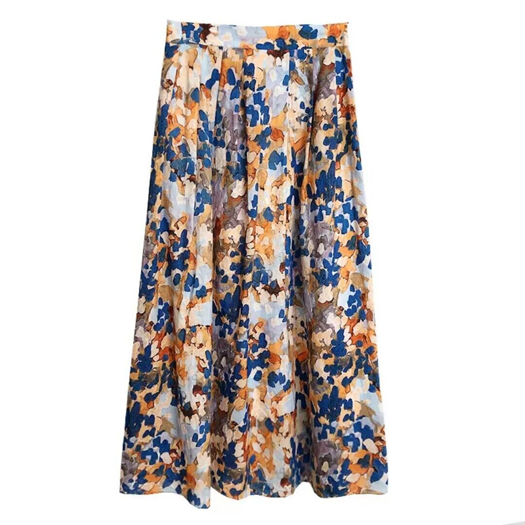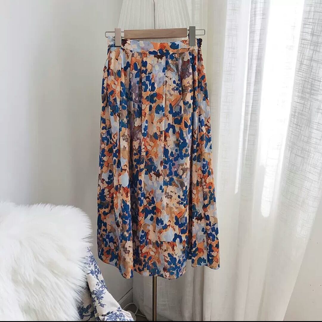 ハイウエスト 水彩画風 リネン スカート リゾート お出かけ お買い物 デート 女子会 春 夏 大人 カジュアル 可愛い キレイめ 通学 学生 通勤 韓国ファッション