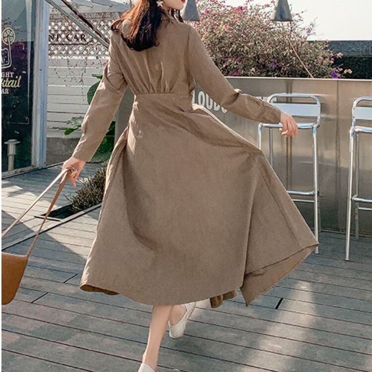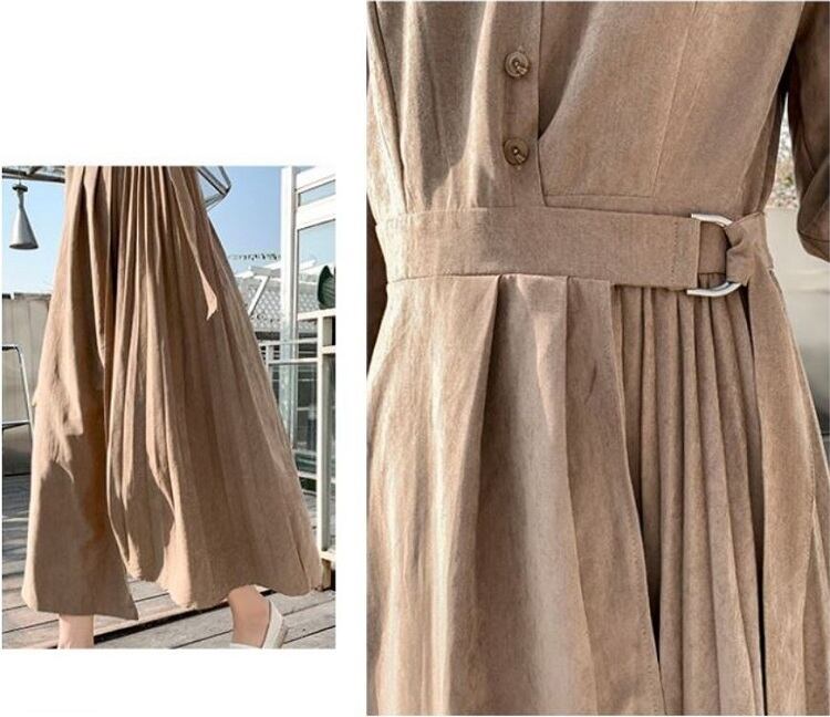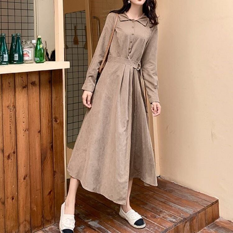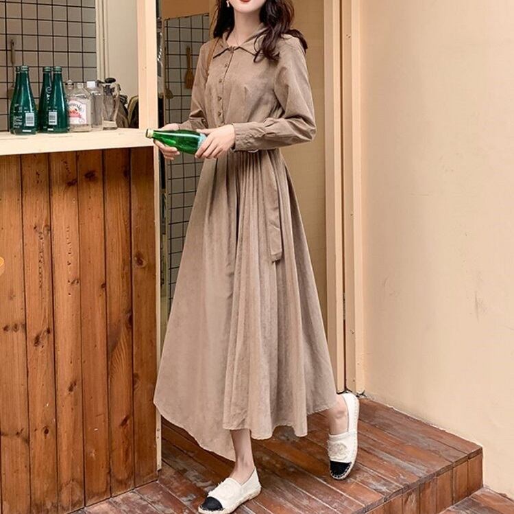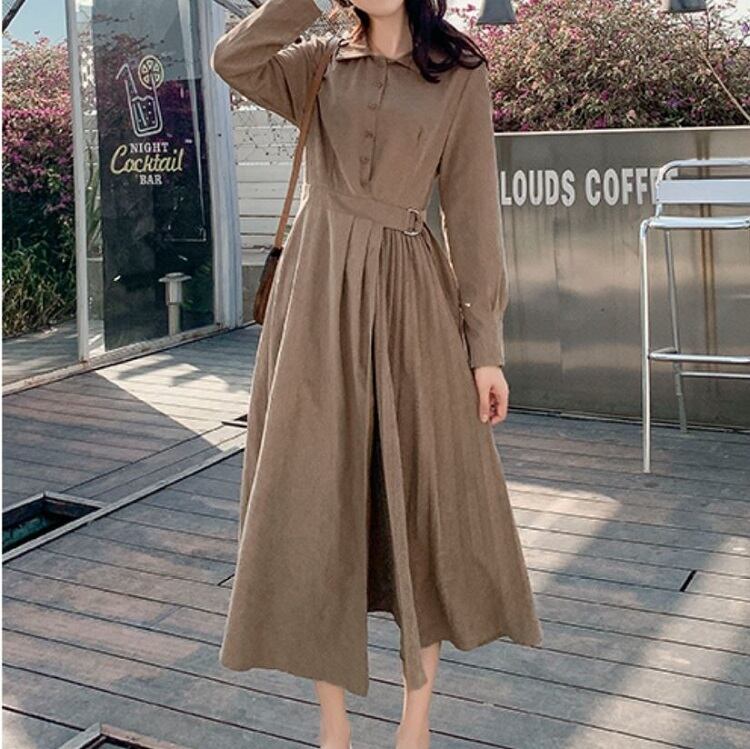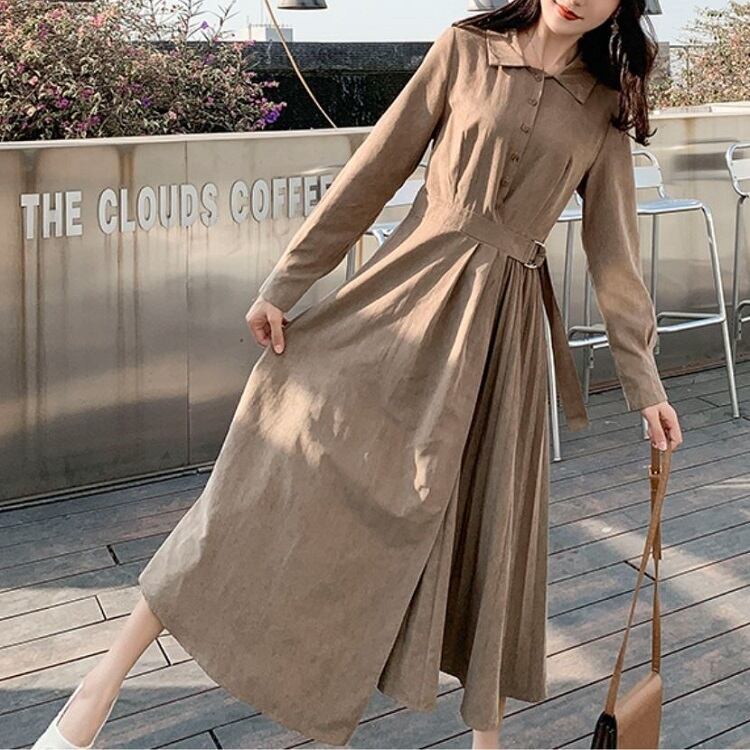 大きいサイズ ロングワンピース シャツワンピース プリーツスカート 長袖 ウエストリボン レトロ カジュアル お出かけ お呼ばれ デート 春