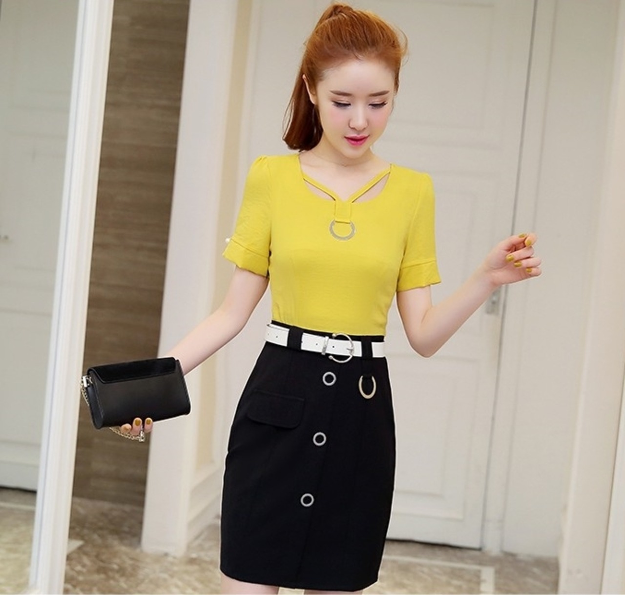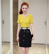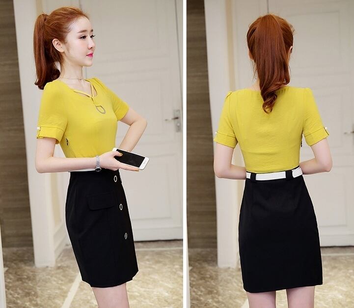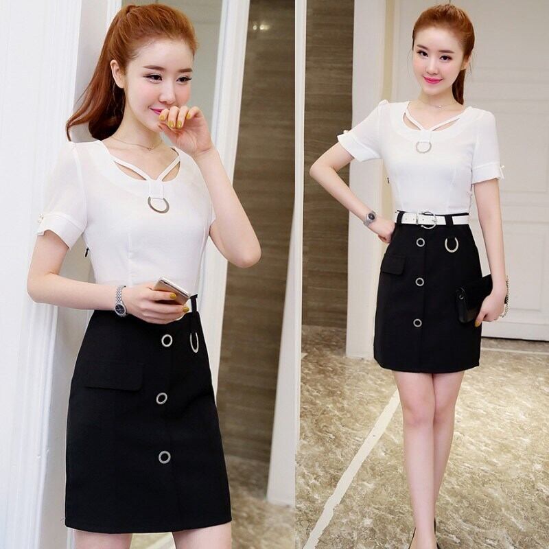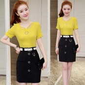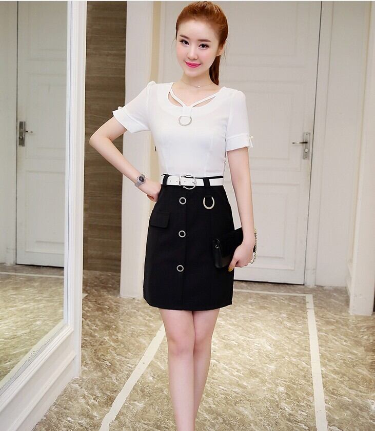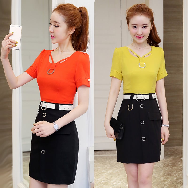 全3色 セットアップ ツーピース Tシャツ ブラウス スカート ミニ丈 Vネック 半袖ウエストベルト ボタン 上品 スリム ガーリー 大人可愛い デート 女子会 カジュアル 春 夏