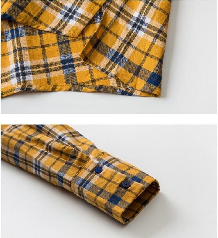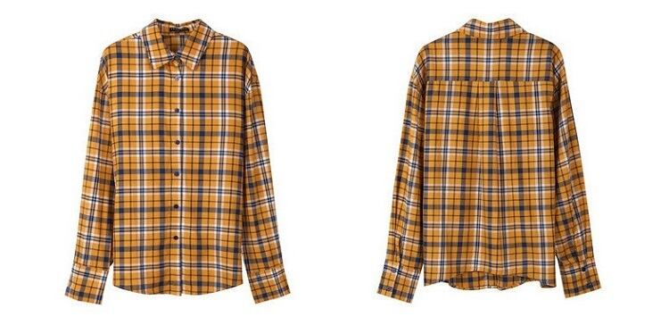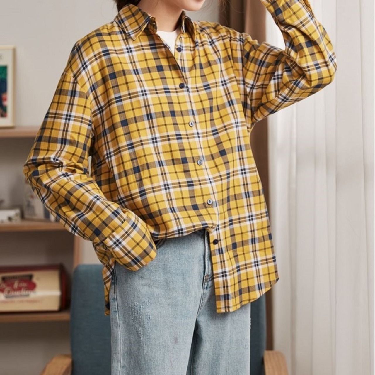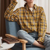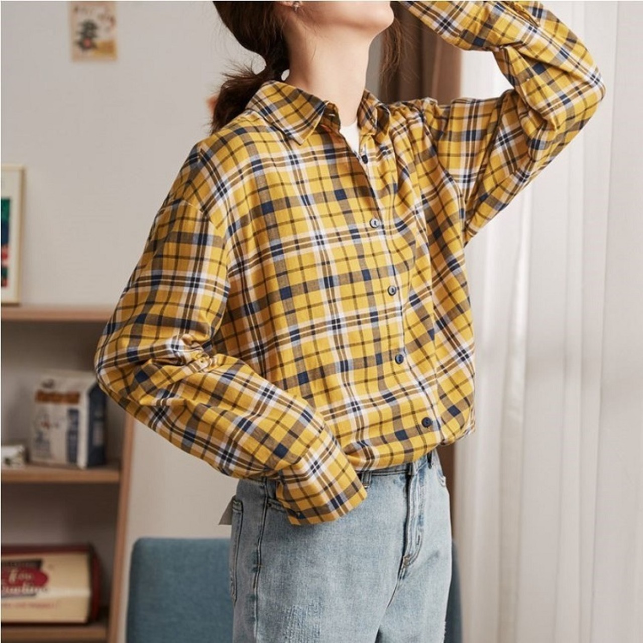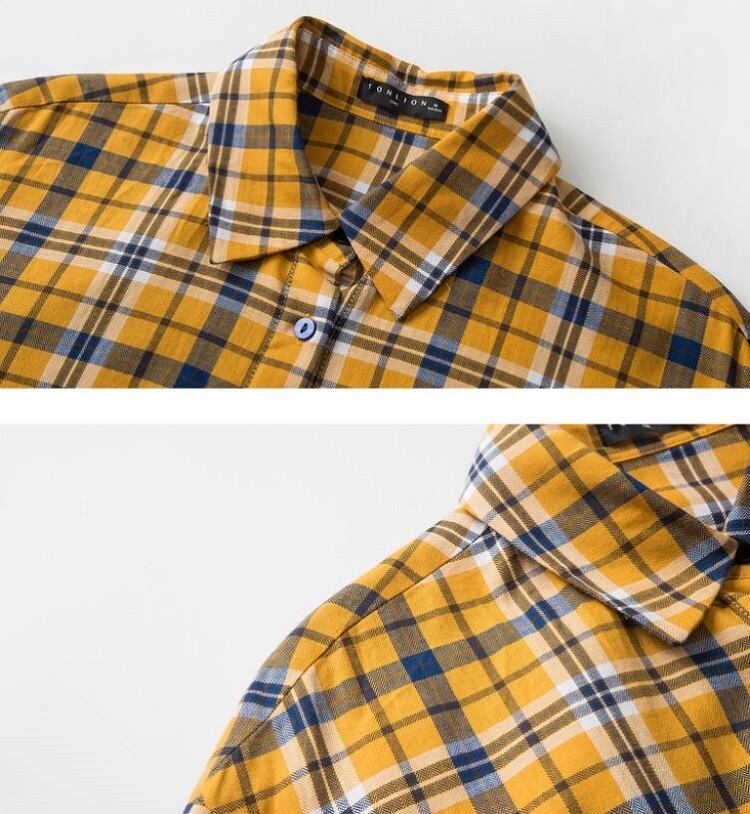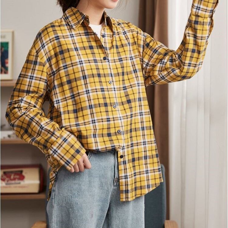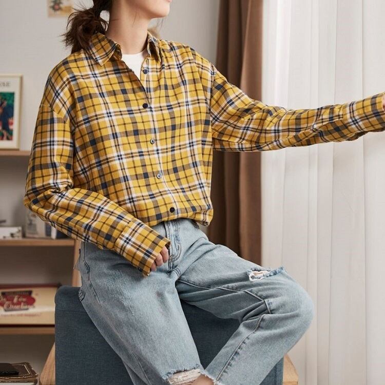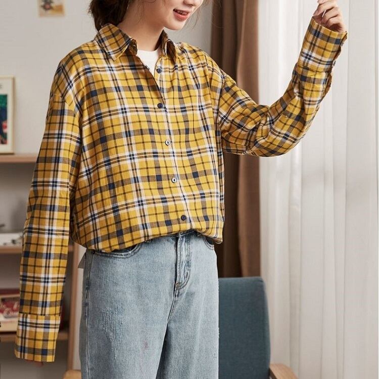 チェックシャツ 長袖 コットンシャツ ルーズ ゆったり カジュアル お出かけ 通学 デイリー 普段着 イエロー 春
