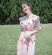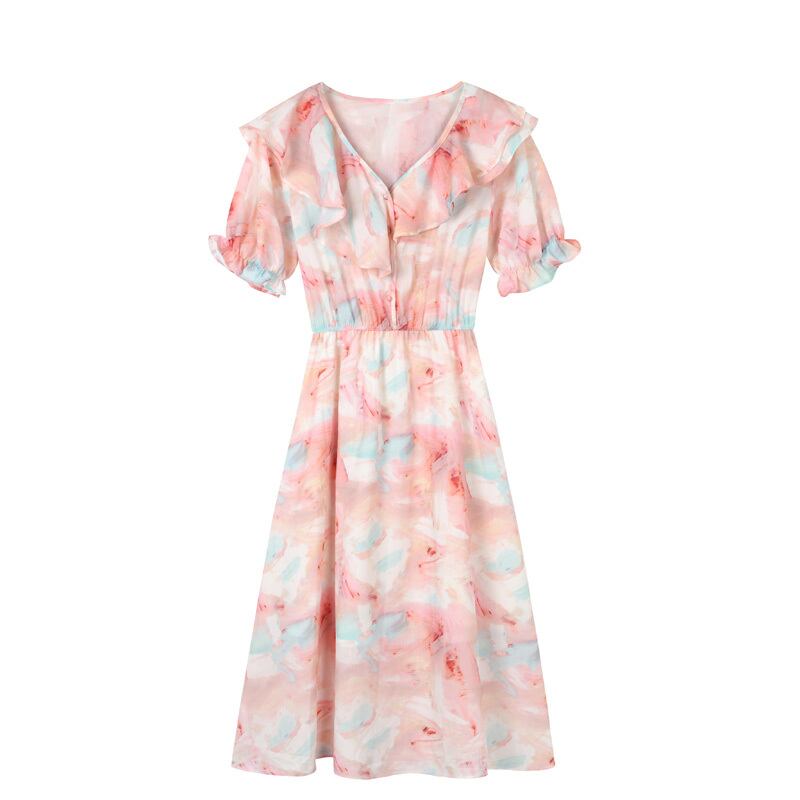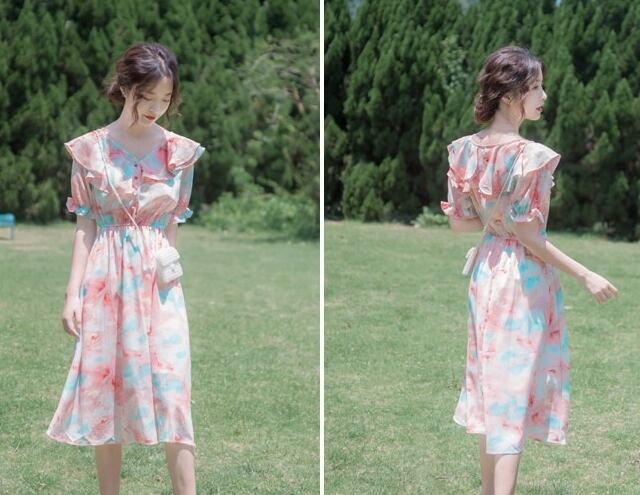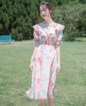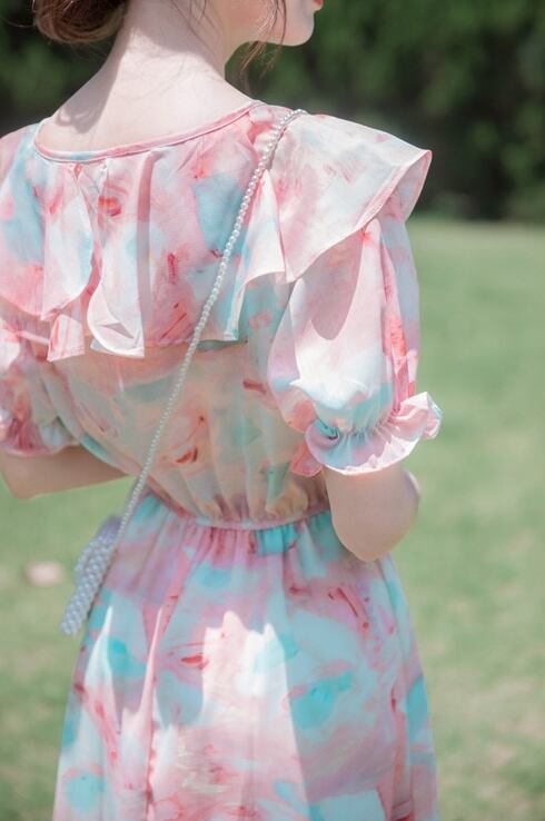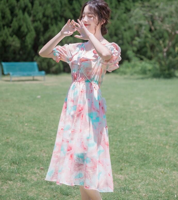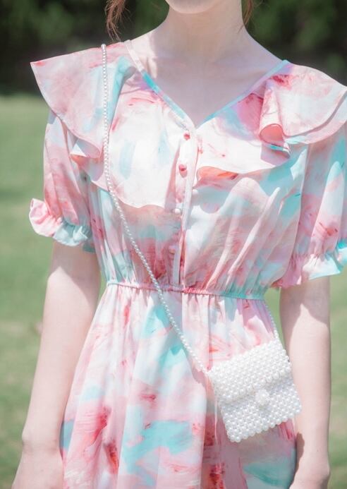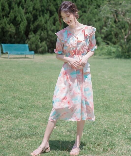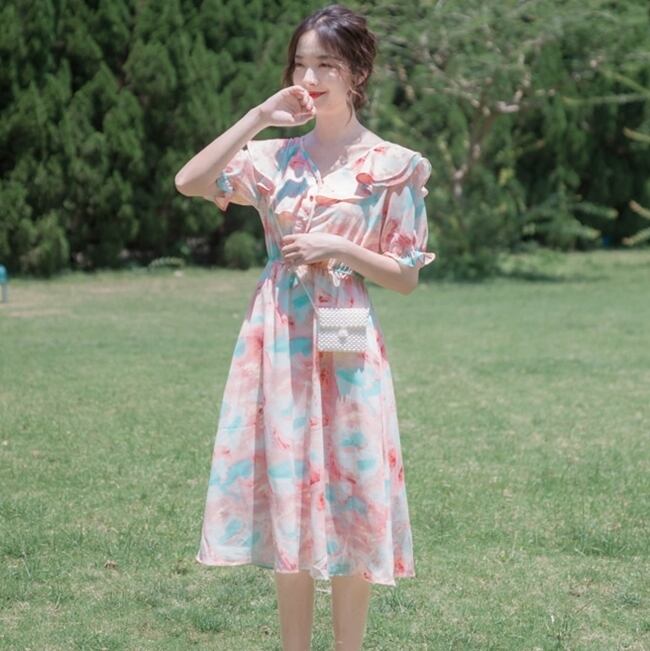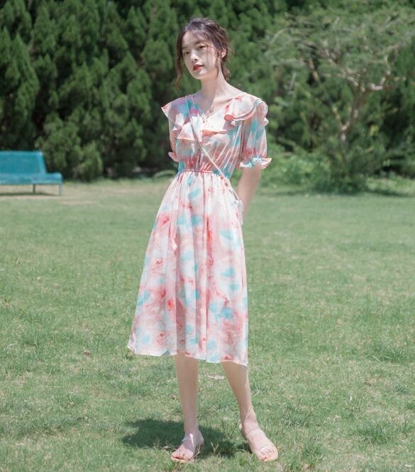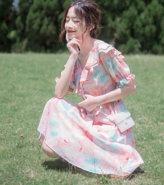 ワンピース ミモレ丈 花柄 ボタン フリル Vネック 5分袖 ウエストマーク ガーリー 大人可愛い デート 女子会 カジュアル 可愛い Vネック フレアスリーブ 春 夏