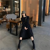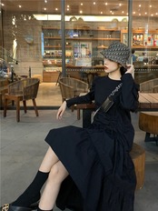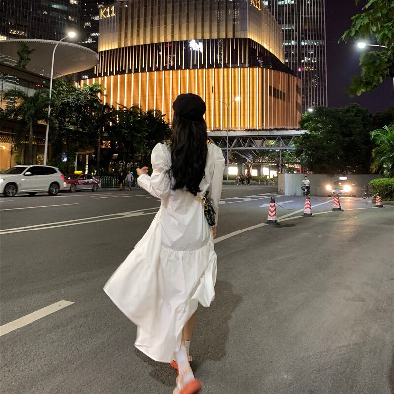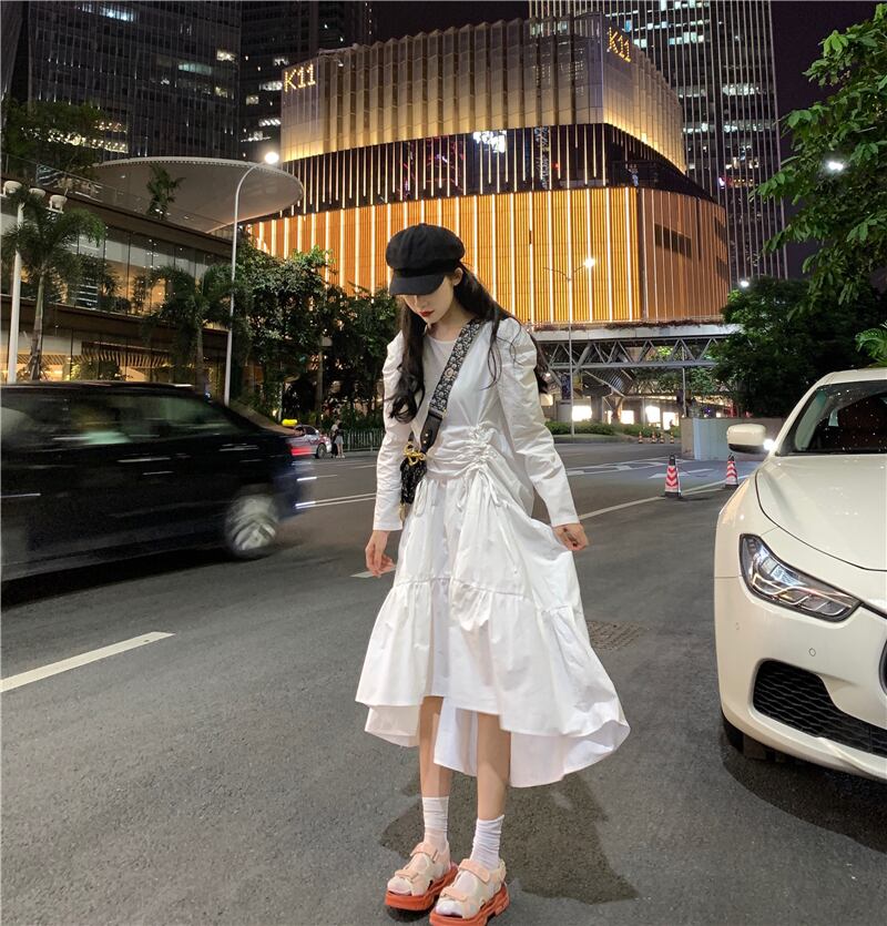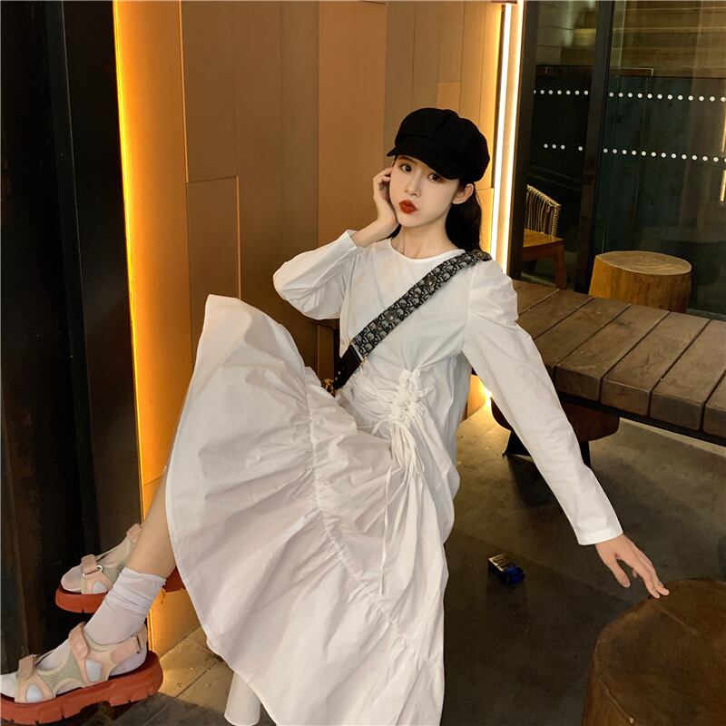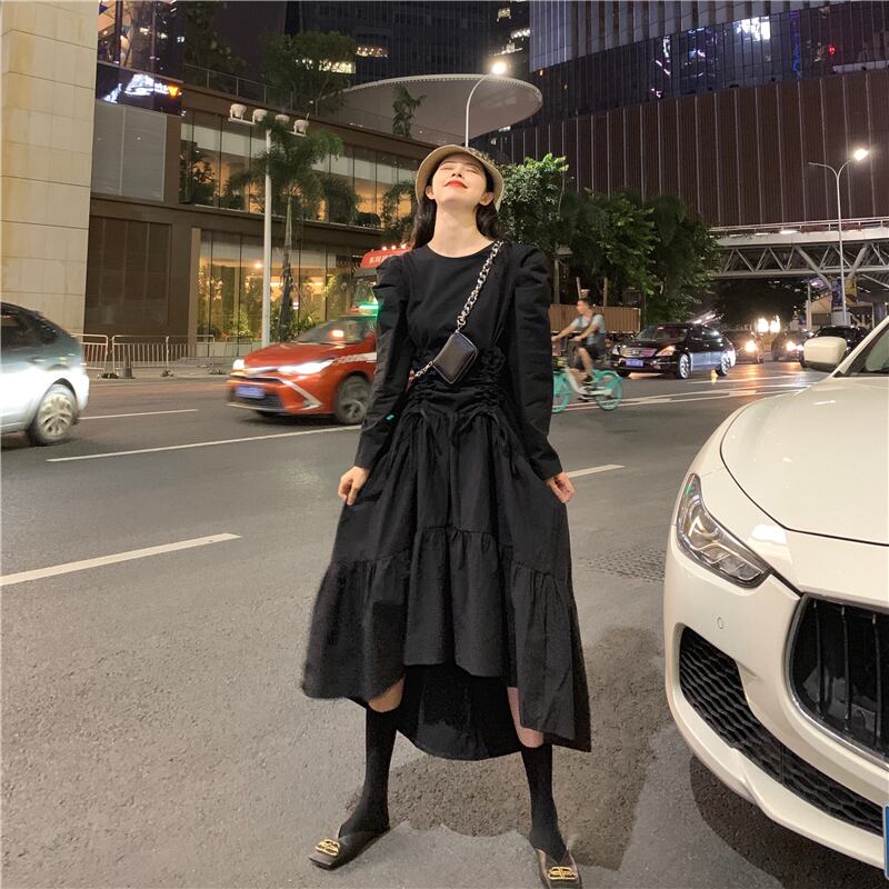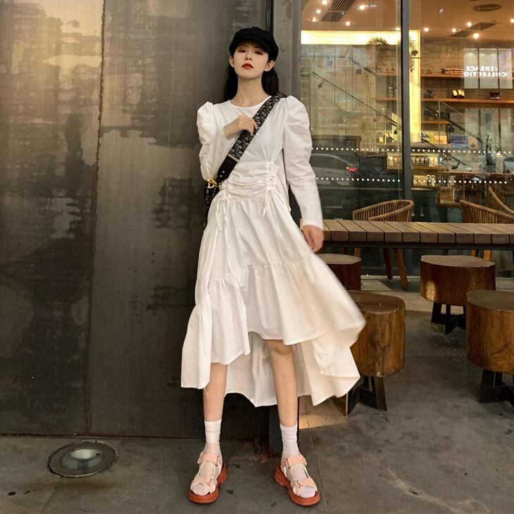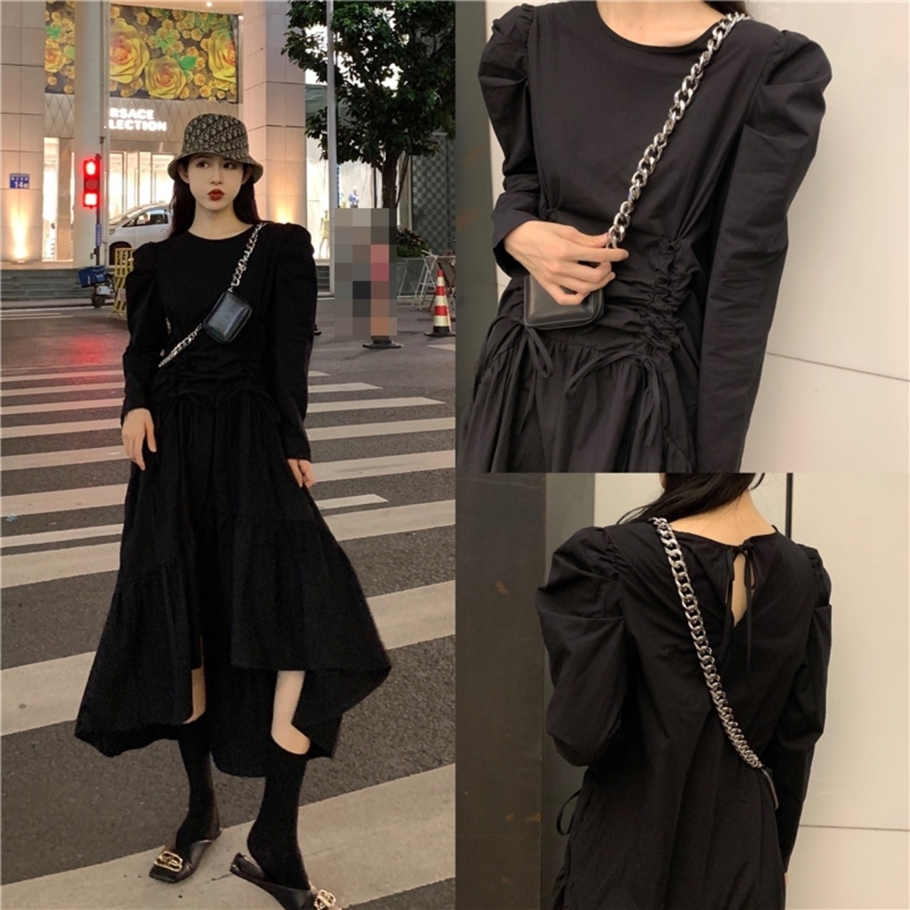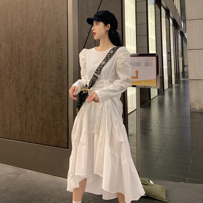 全2色 ワンピース ドレス ミモレ丈 フィッシュテール フロントシャーリング リボン フレア Aライン ラウンドネック 長袖 バルーンスリーブ ティアード ユニーク ガーリー カジュアル きれいめ 個性的 無地 春 夏