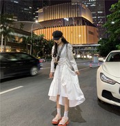 フロントシャーリングもフェミニンで、広がるフレアなシルエットが上品な仕上がり、歩くたびに動きのある表情を演出します。