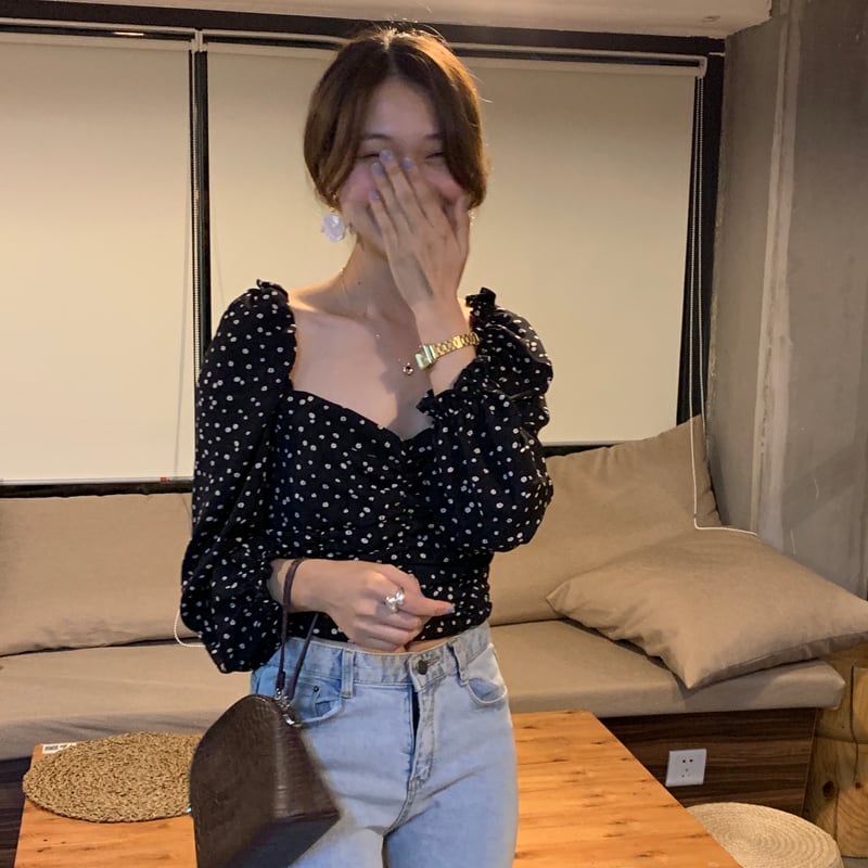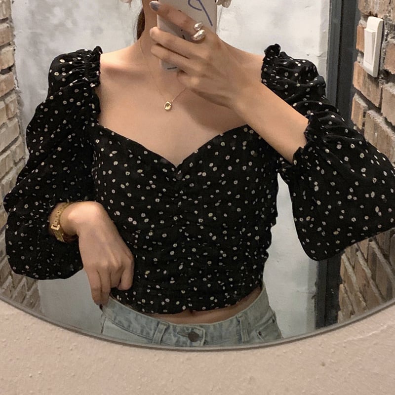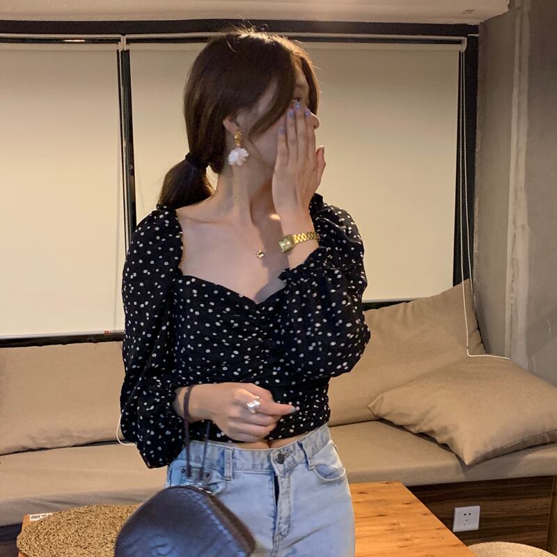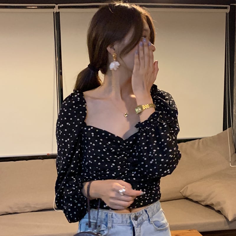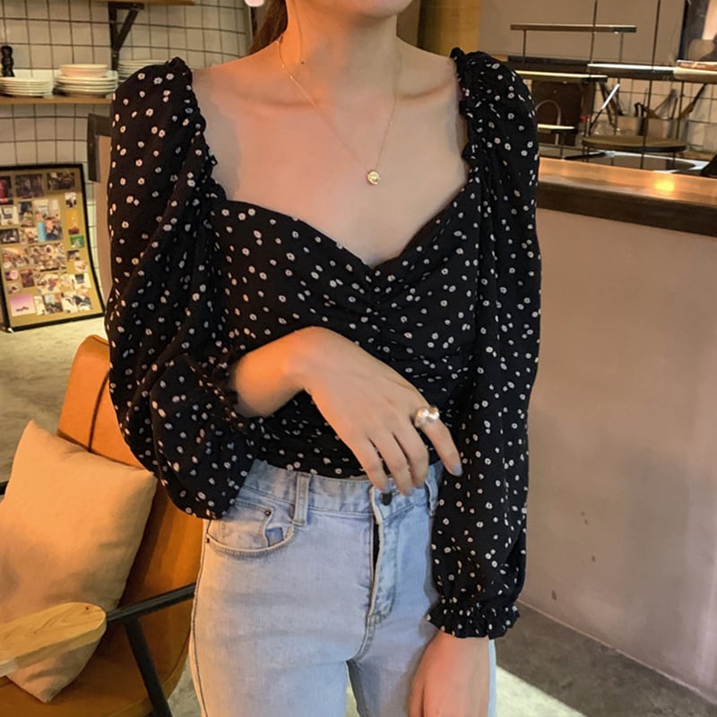 トップス ブラウス ドット柄 花柄 スクエアネック 上品 水玉 ガーリー ショート バルーンスリーブ 長袖 デコルテ カジュアル デート 女子会 韓国ファッション 春 夏