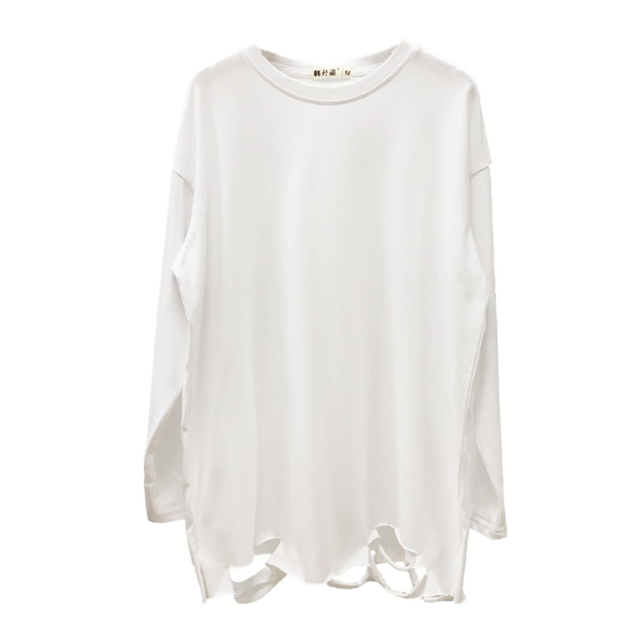 全4色 トップス Tシャツ ダメージ 無地 長袖 クール オーバーサイズ ロングTシャツ ゆったり サイドスリット シンプル カジュアル デイリー ラフ トレンド 韓国ファッション 体型カバー 春 夏