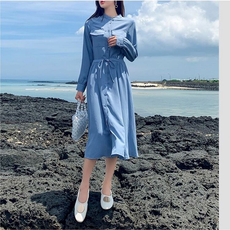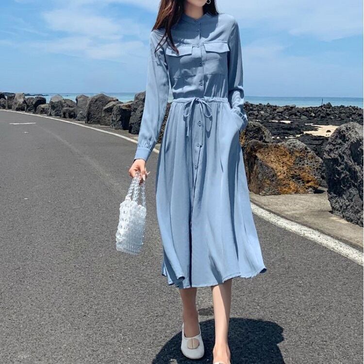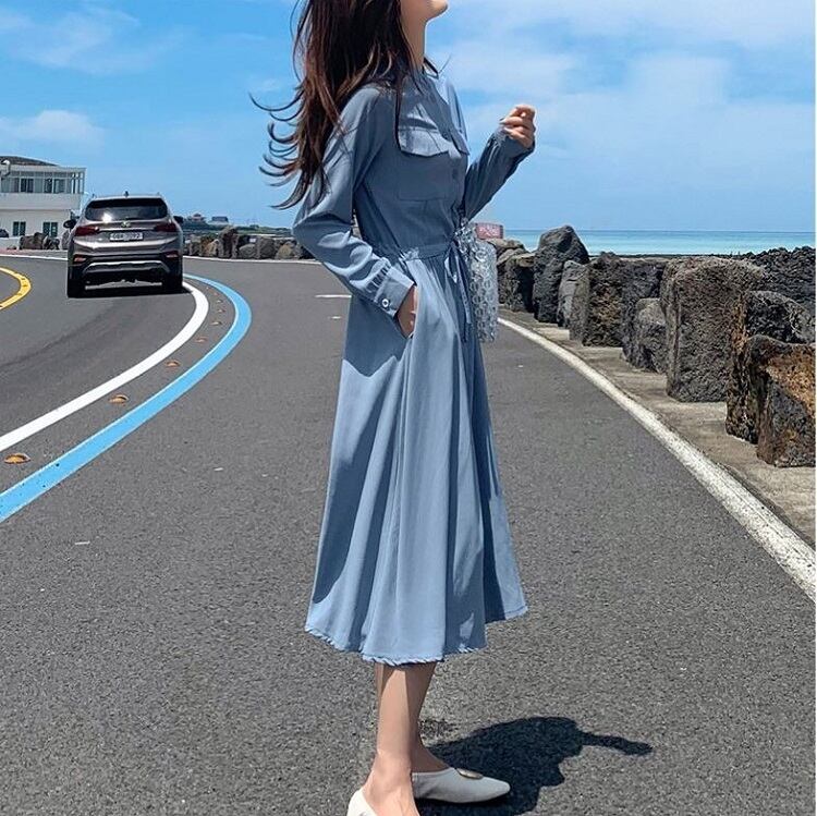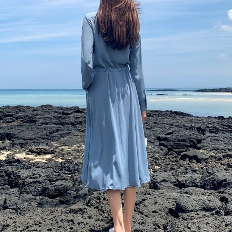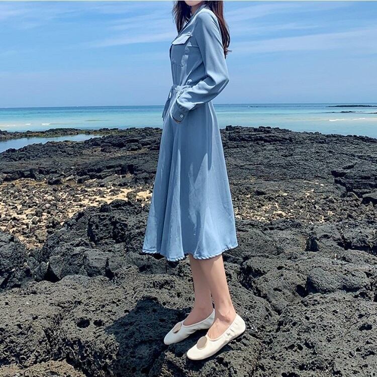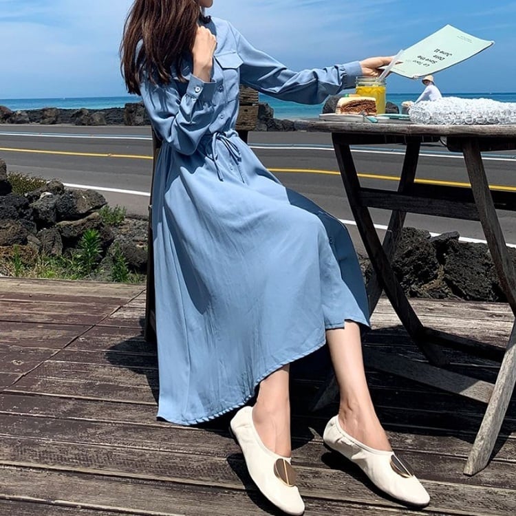 ワンピース シャツワンピース ロング丈 ミモレ丈 ウエストリボン フロントボタン 長袖 フレアスカート きれいめ かわいい カジュアル お出かけ デート ブルー
