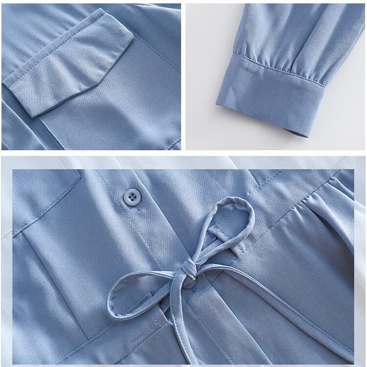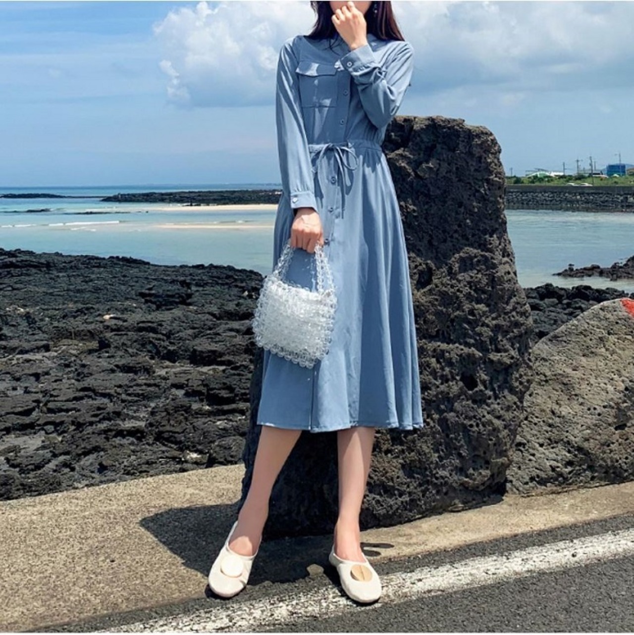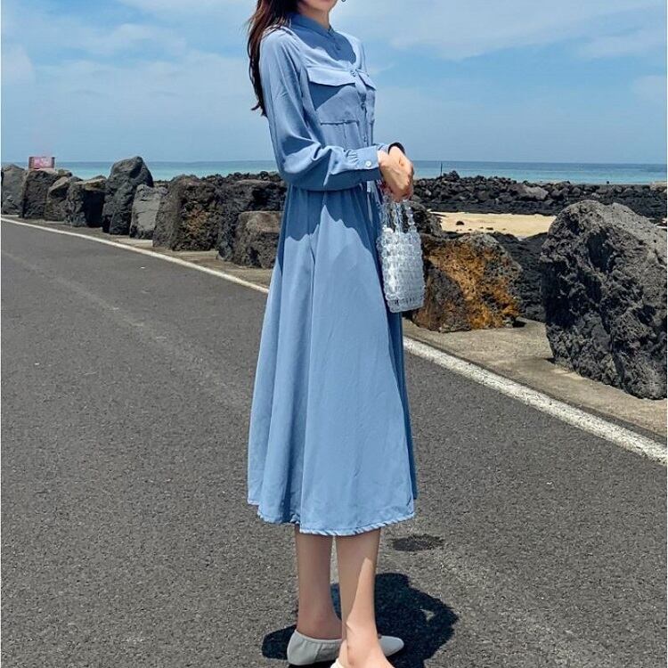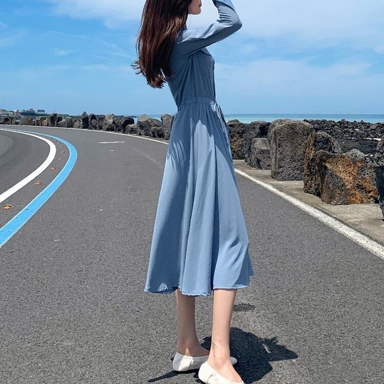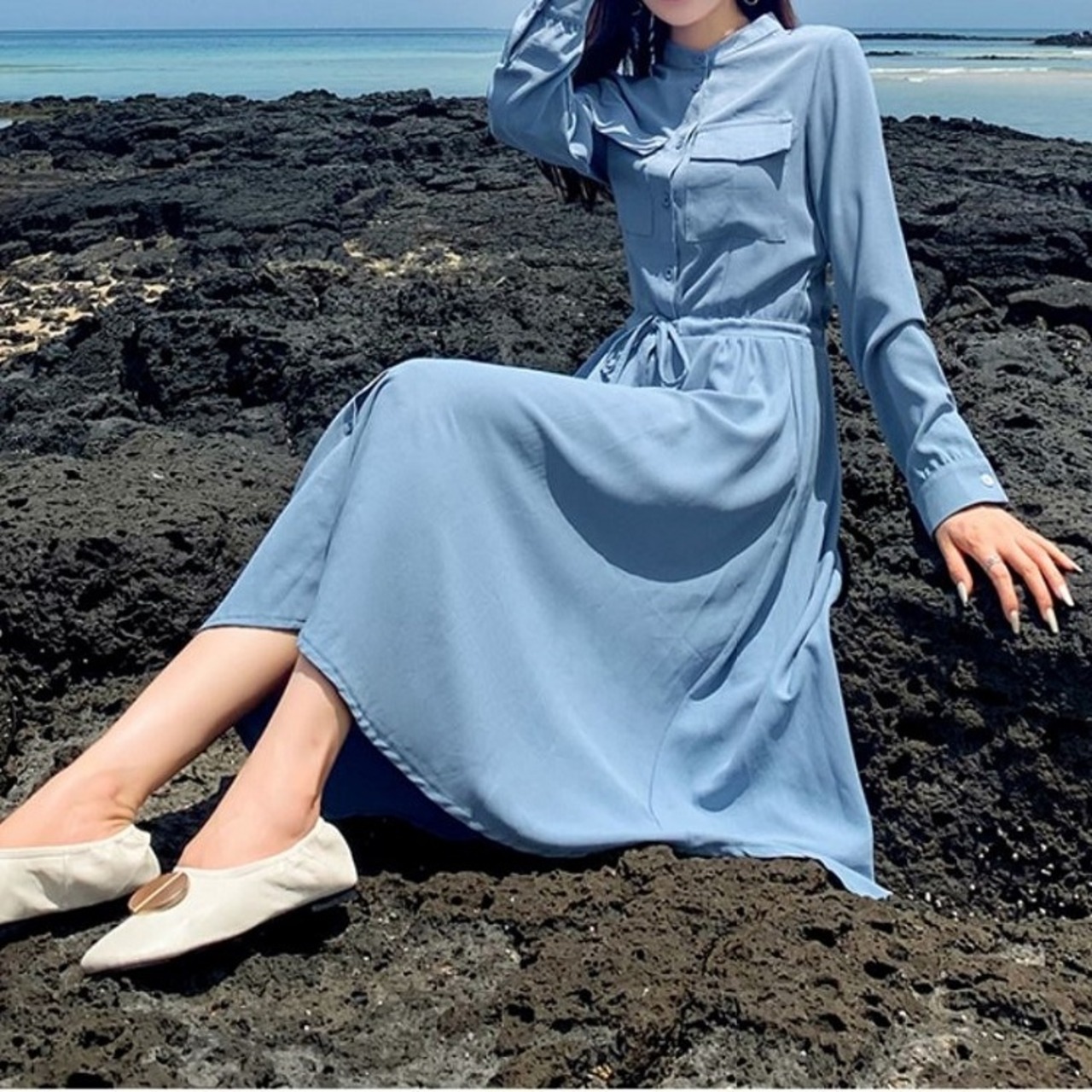 ワンピース シャツワンピース ロング丈 ミモレ丈 ウエストリボン フロントボタン 長袖 フレアスカート きれいめ かわいい カジュアル お出かけ デート ブルー