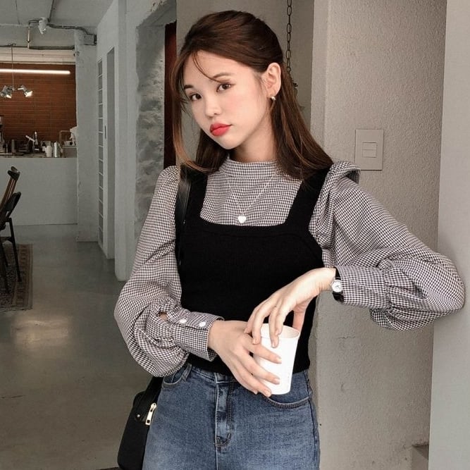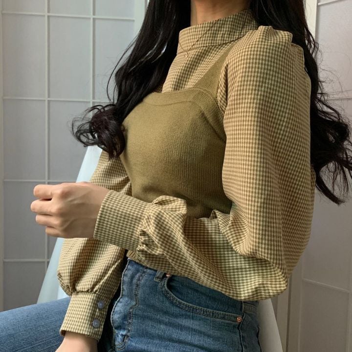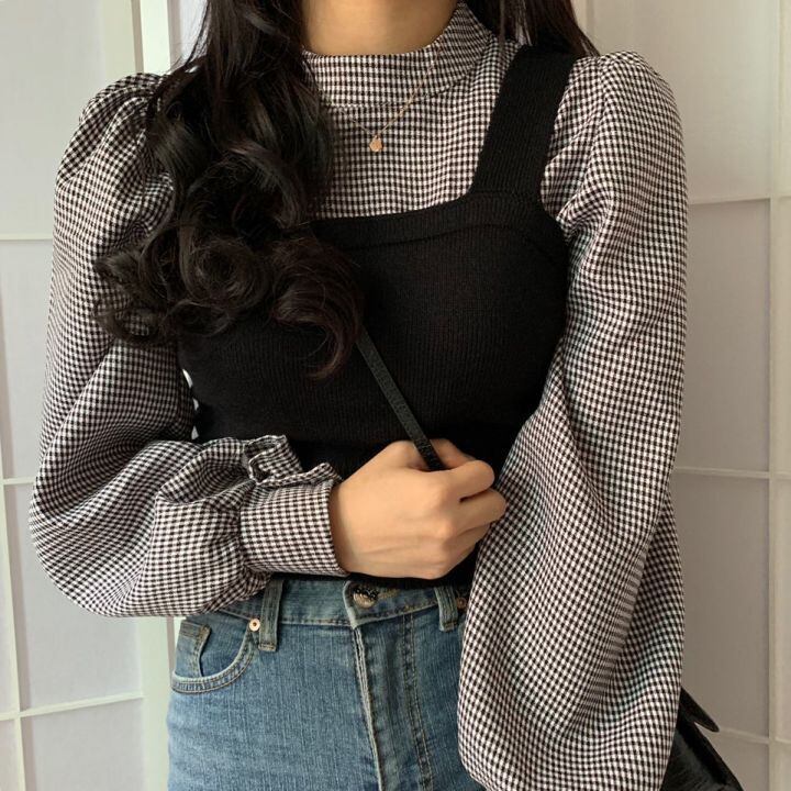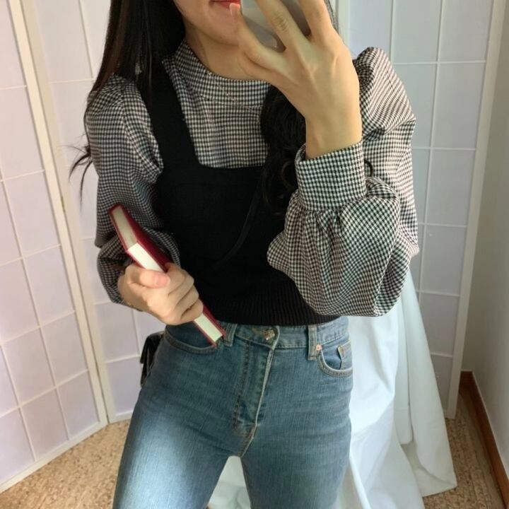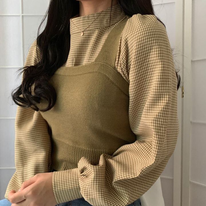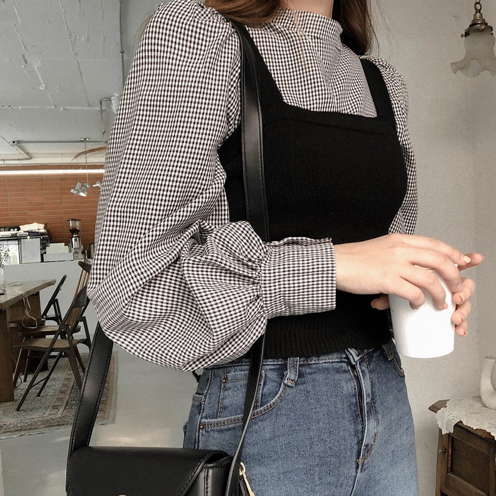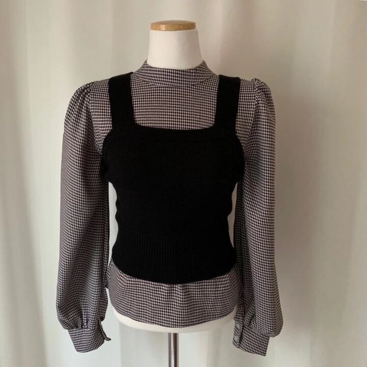 全2色 ツーピース ブラウス チェック柄 トップス ベスト セーター ニット ビスチェ ハイネック 長袖 スリム パフスリーブ ランタンスリーブ ガーリー 可愛い カジュアル 韓国ファッション きれいめ 上品 デート 女子会 春 冬