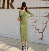 全4色2種 ワンピース タイト ロング丈 スリム ネックボタン スクエアネック ノースリーブ 長袖 サイドスリット 大人可愛い スタイルアップ カジュアル デイリー シンプル 無地 春 夏