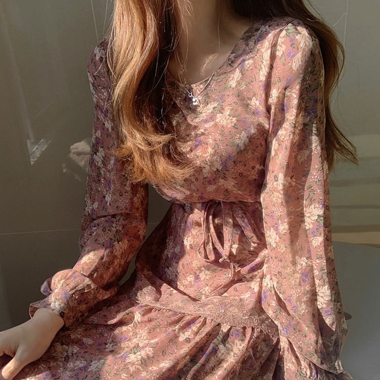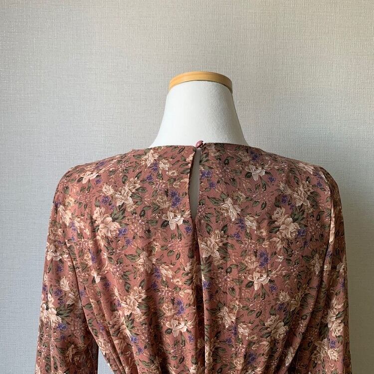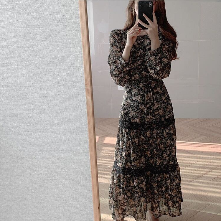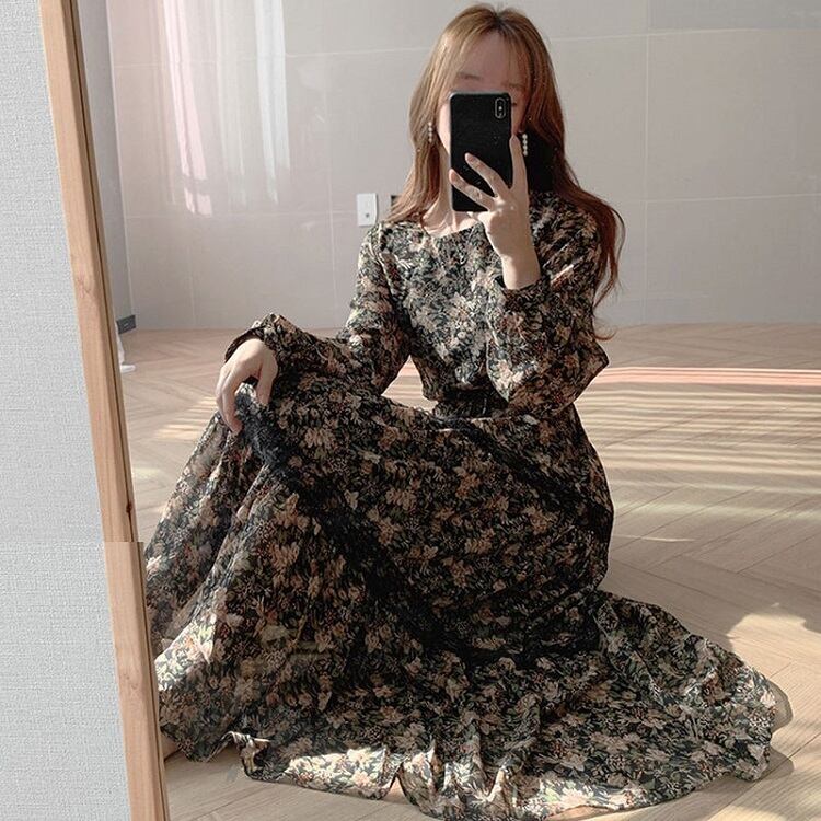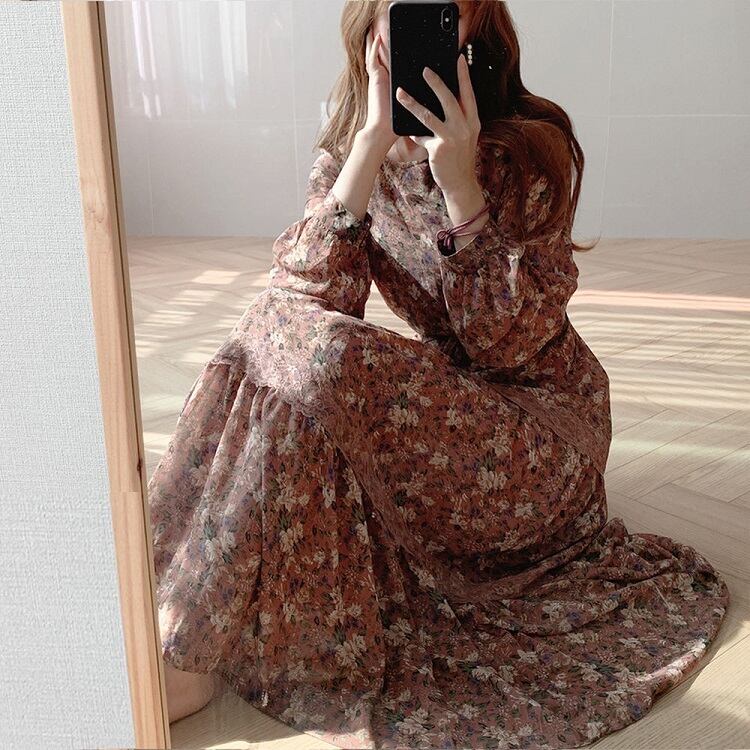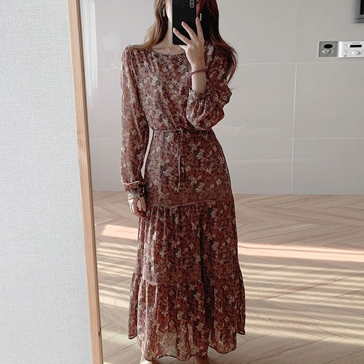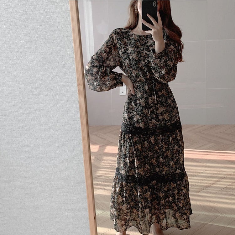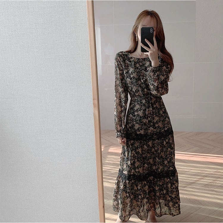 全2色 ロングワンピース 花柄 ラウンドネック 長袖 3段ギャザー フリル レトロ エレガント カジュアル お出かけ デート デイリー ブラック オレンジ