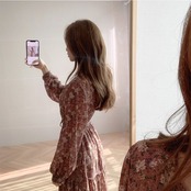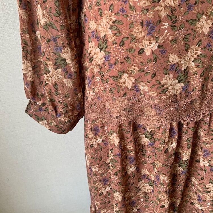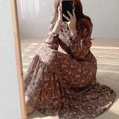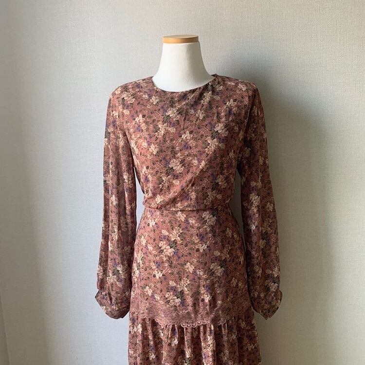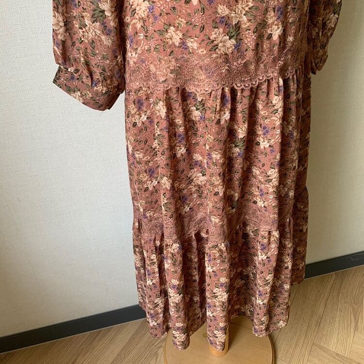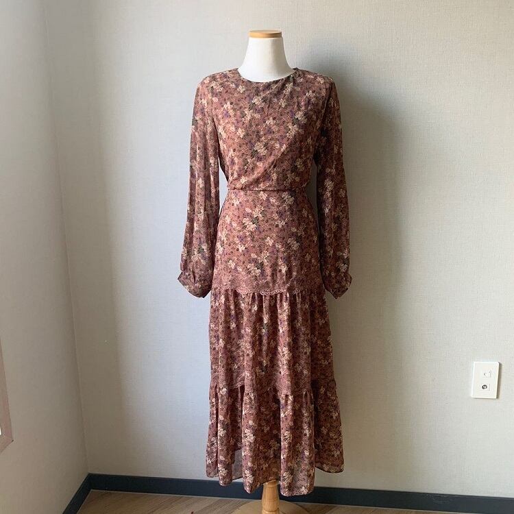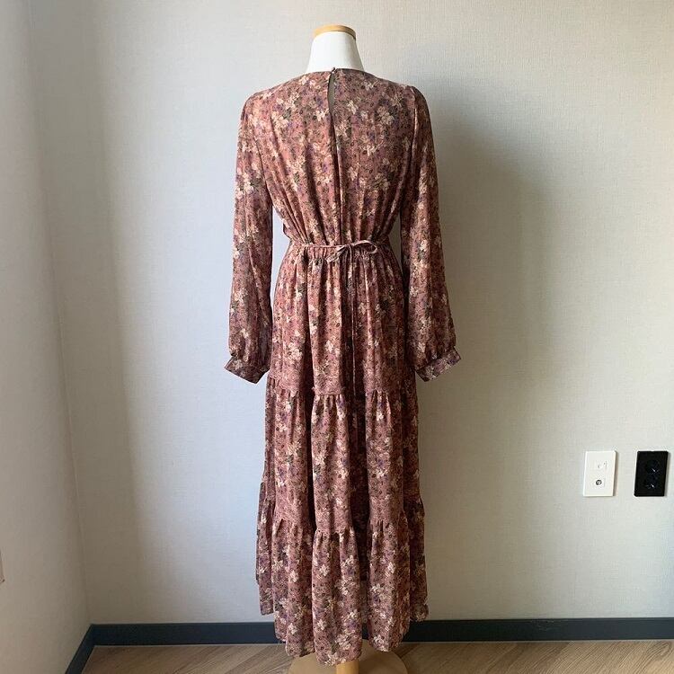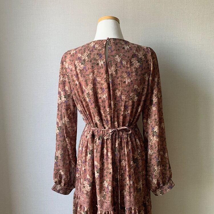 3段ギャザーが可愛らしい花柄シフォンのワンピース。