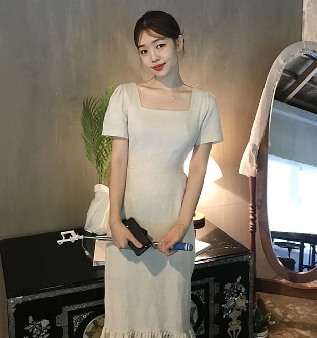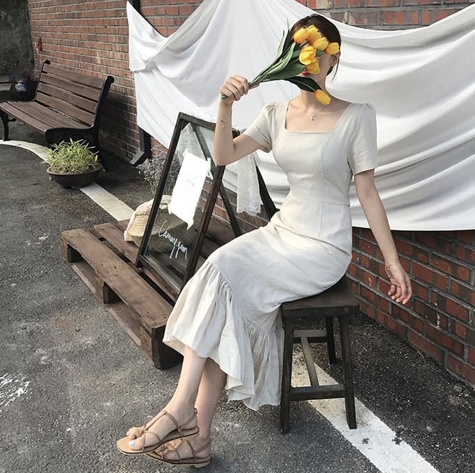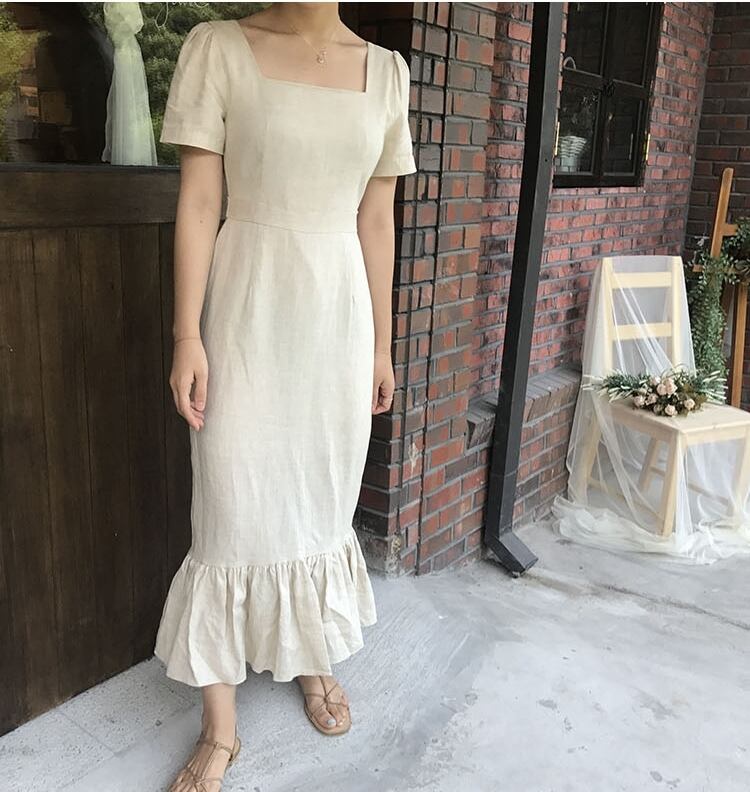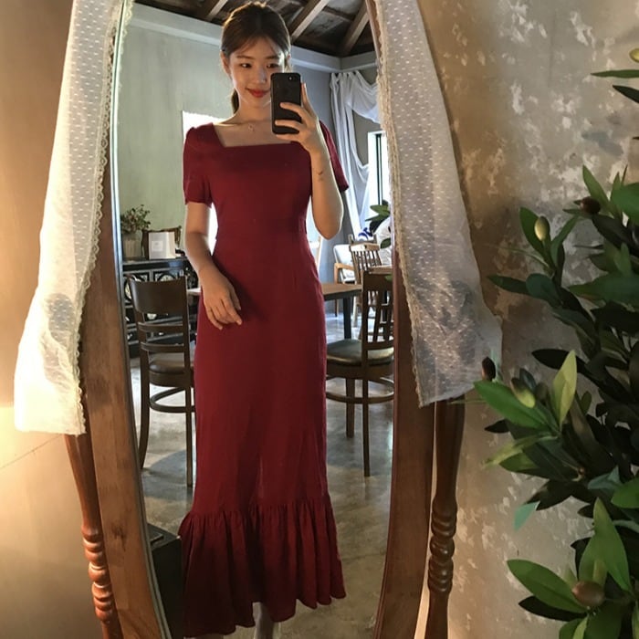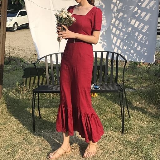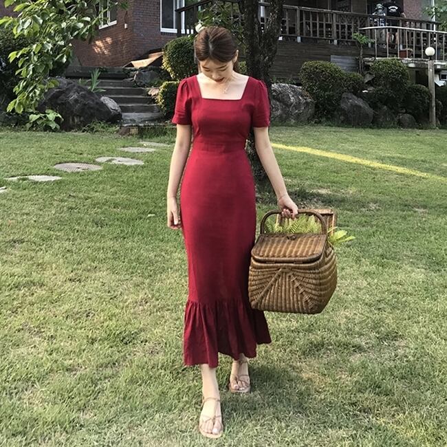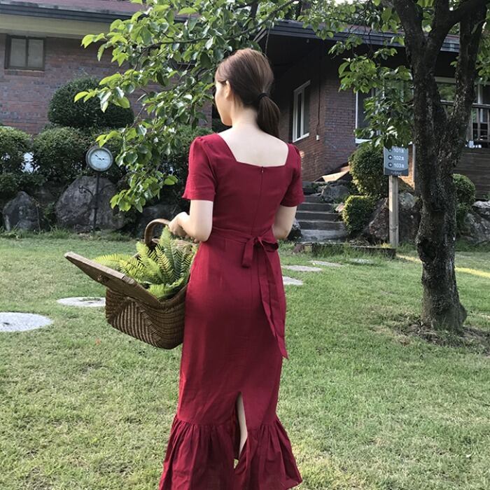 全2色 ワンピース ドレス マーメイド ロング丈 タイト スリム フリル 半袖 スクエアネック 上品 バックリボン バックスリット 韓国ファッション きれいめ パーティー エレガント お呼ばれ 夏 春
