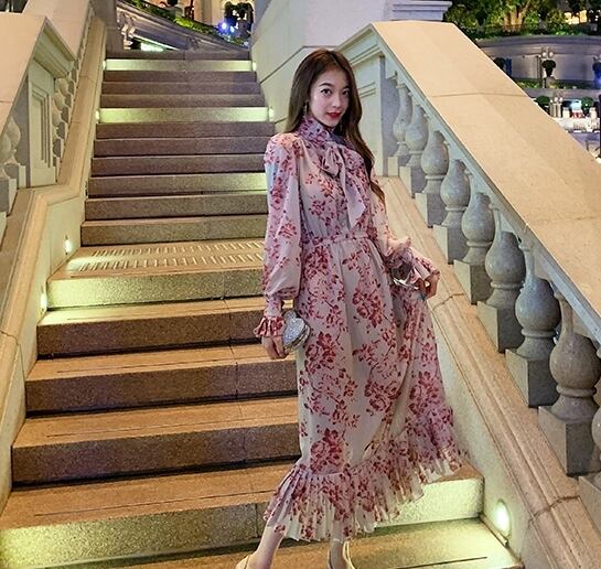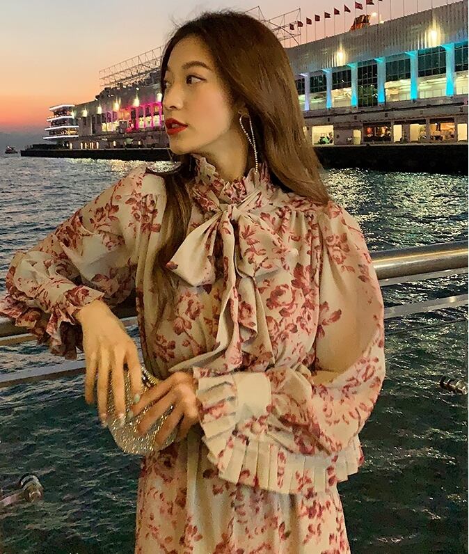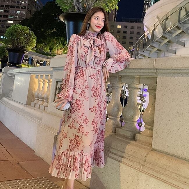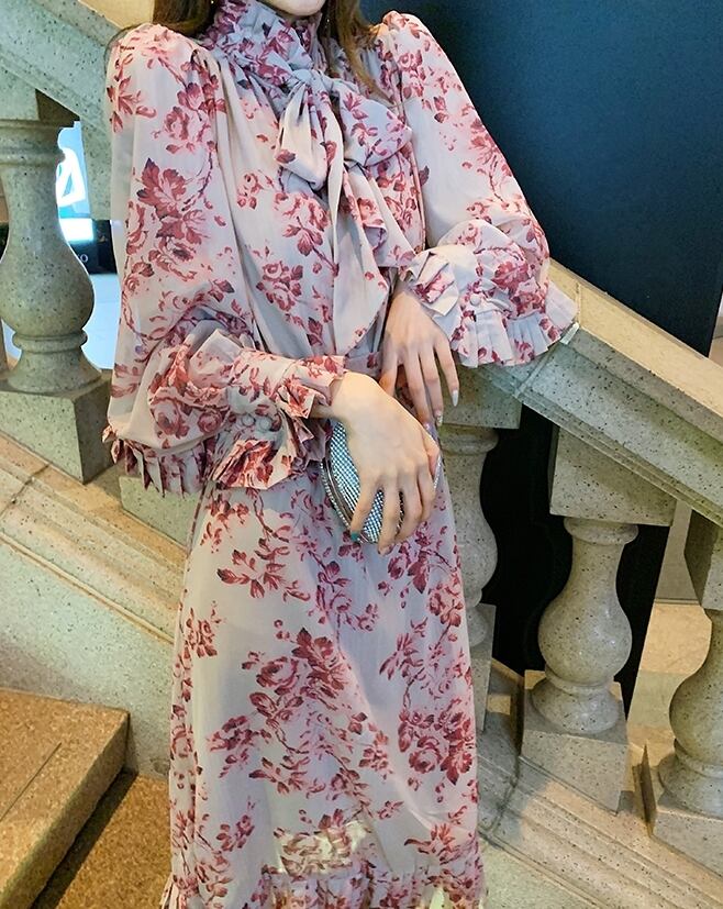 ワンピース ドレス 花柄 マーメイド プリーツ フリル ボウタイネック ロング丈 長袖 フレアスリーブ 袖コンシャス ウエストマーク 上品 大人可愛い カジュアル きれいめ お呼ばれ 春 夏