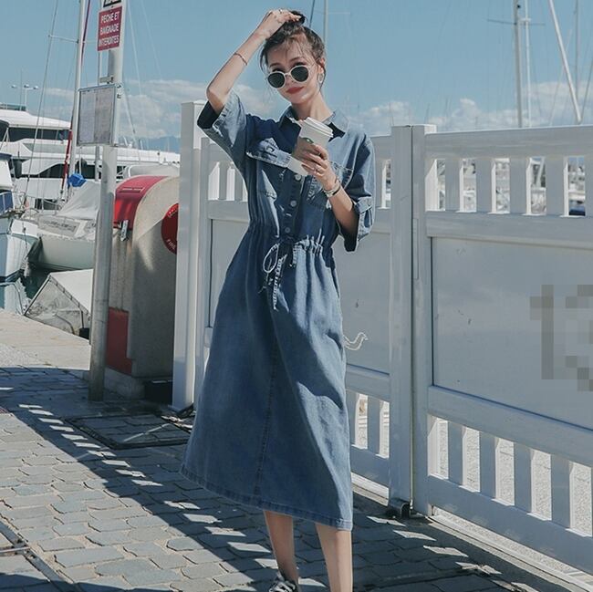 ワンピース ミモレ丈 デニムワンピース ウエストリボン フロントボタン シンプル ベーシック 7分袖 カジュアル デイリー 大人 ポケット お出掛け 春 夏