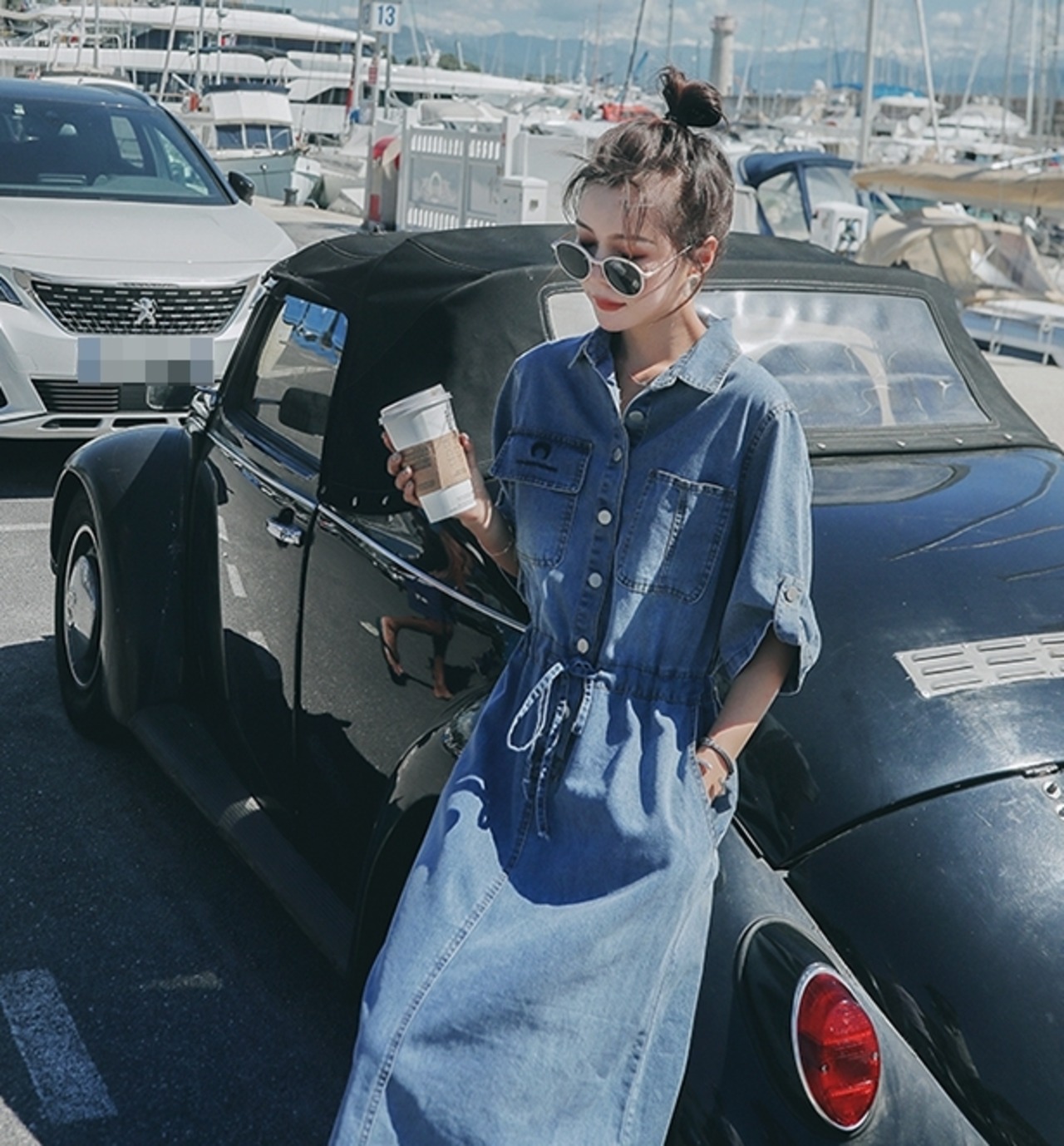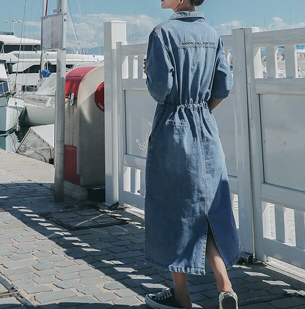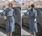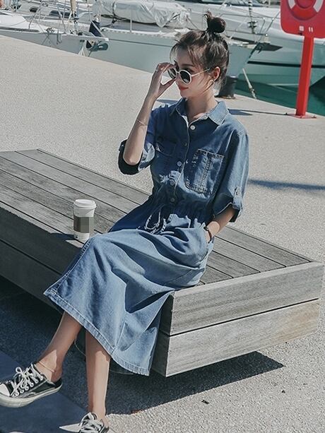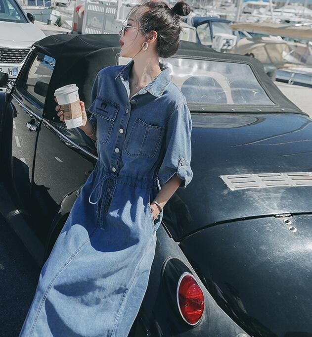 シンプルながらもおしゃれに決まるミモレ丈のデニムワンピースです。
