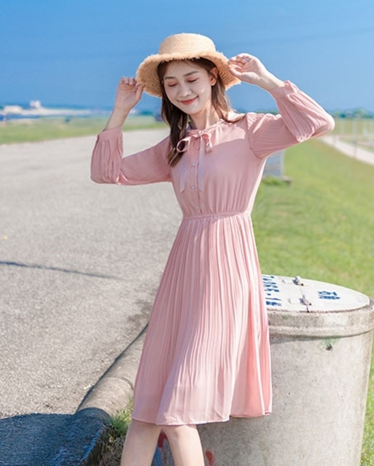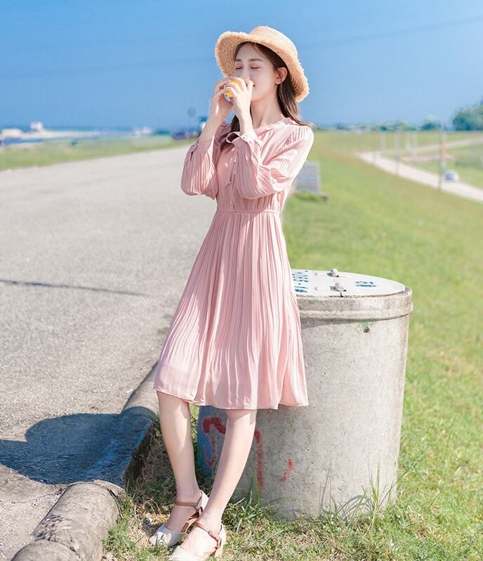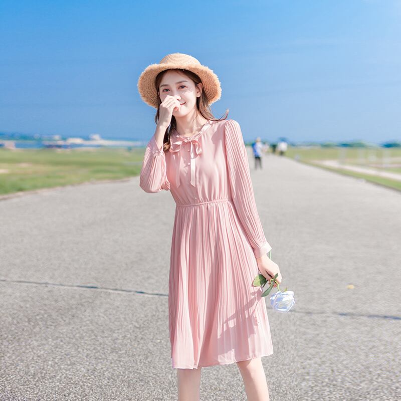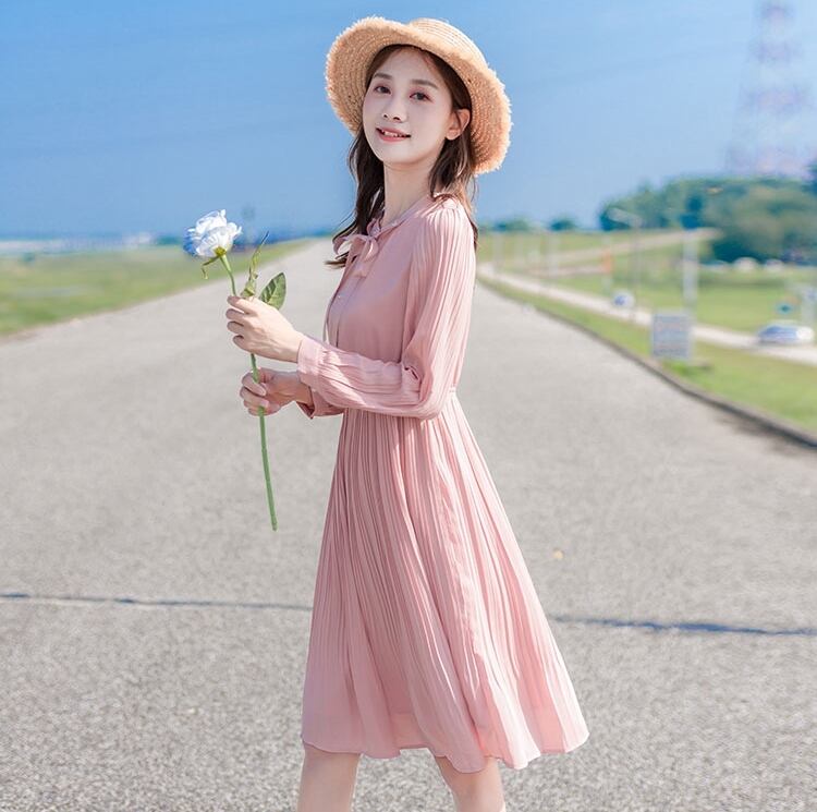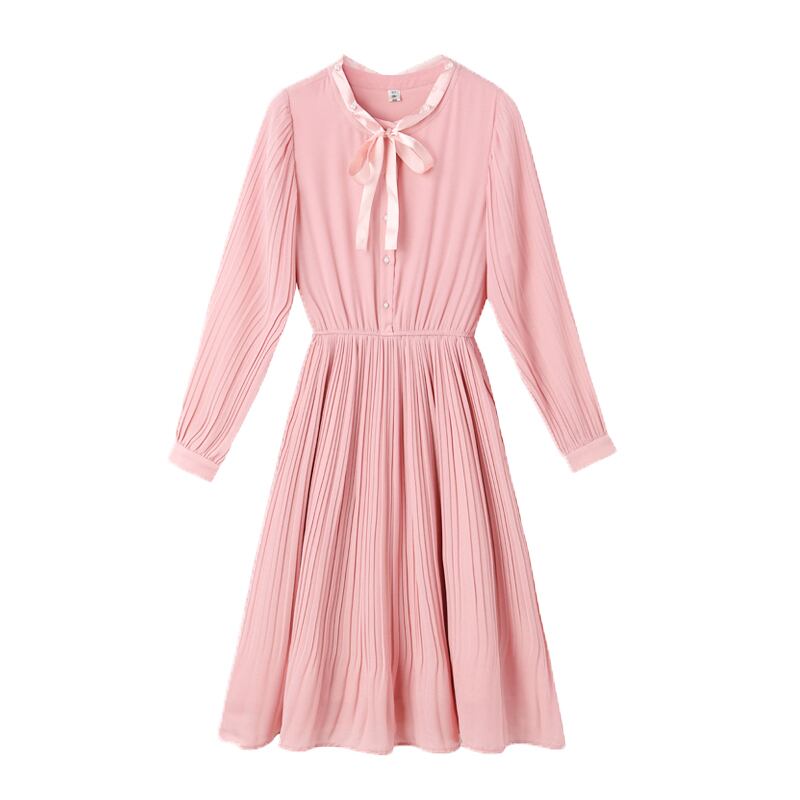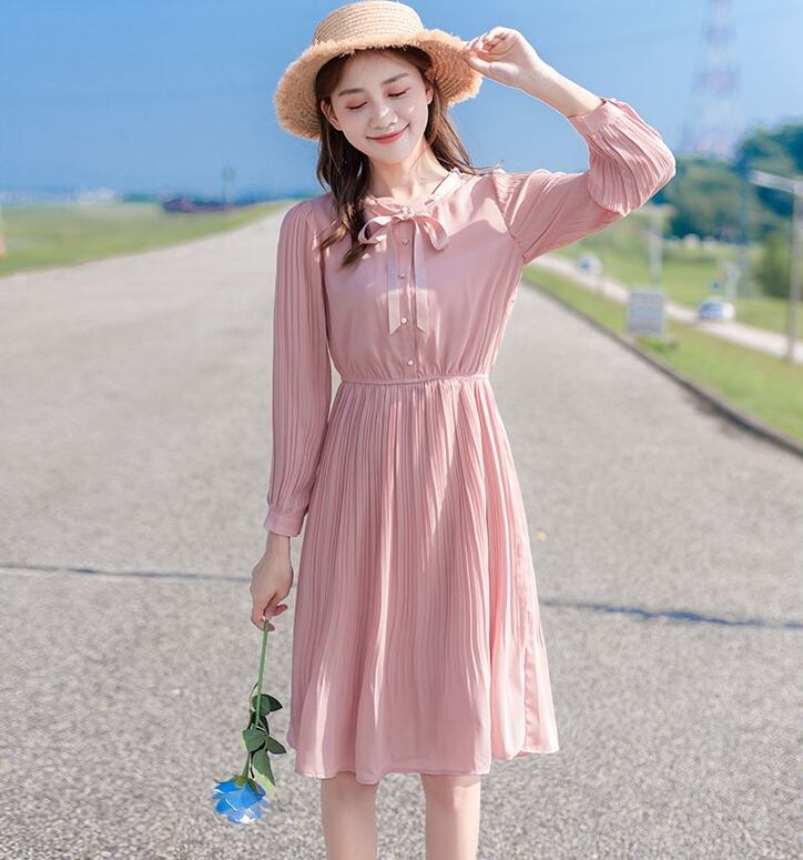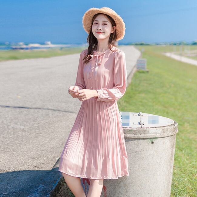 ワンピース ひざ丈 フレア プリーツ ボタン ハイウエスト ボウタイネック ウエストマーク リボン パフスリーブ 長袖 上品 カジュアル きれいめ 大人可愛い ガーリー 春 冬