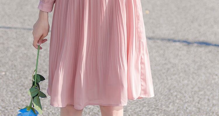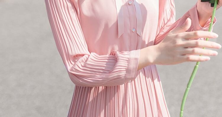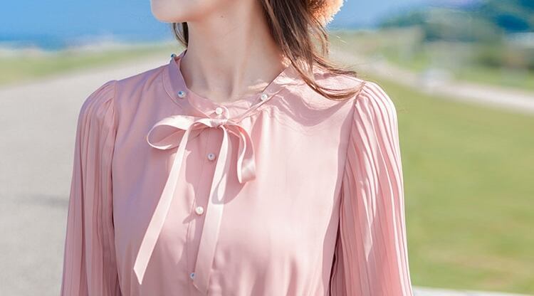 ボウタイネックがフェミニンで、プリーツ加工が縦ラインを強調しすっきりとしたラインに仕上げます。