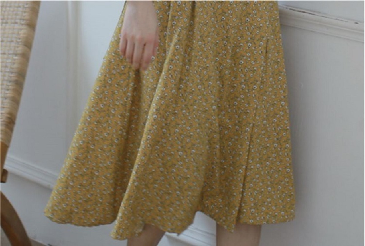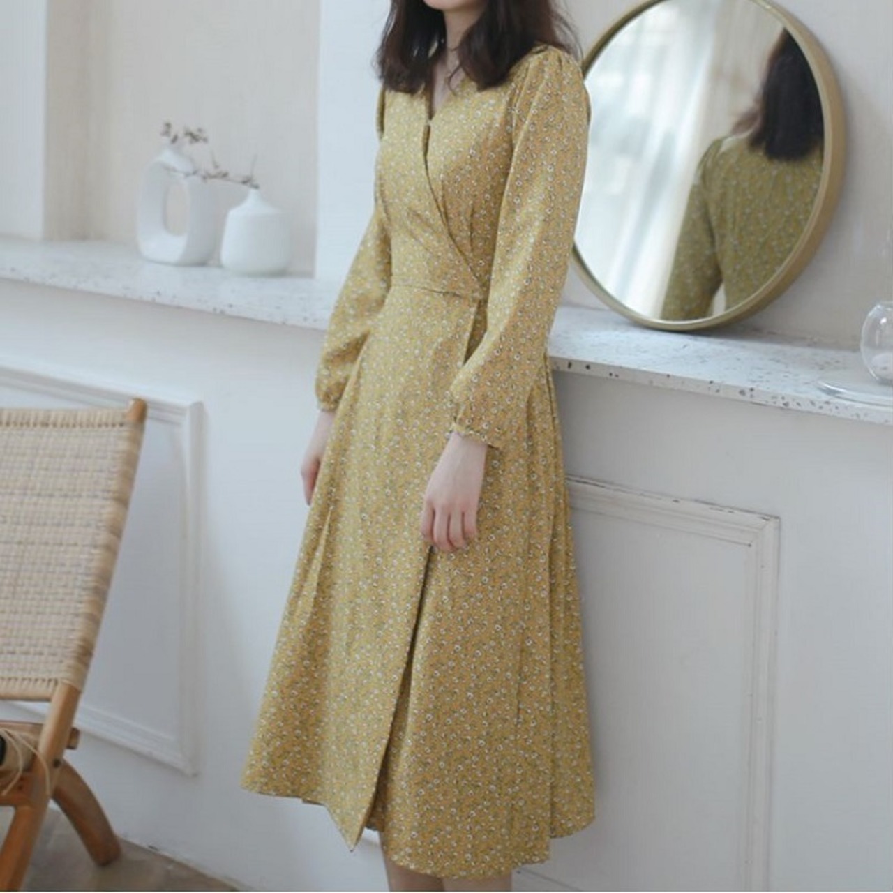 花柄ワンピース Vネック 長袖 ひざ丈 ウエストリボン フレアスカート カジュアル お出かけ お呼ばれ デート イエロー