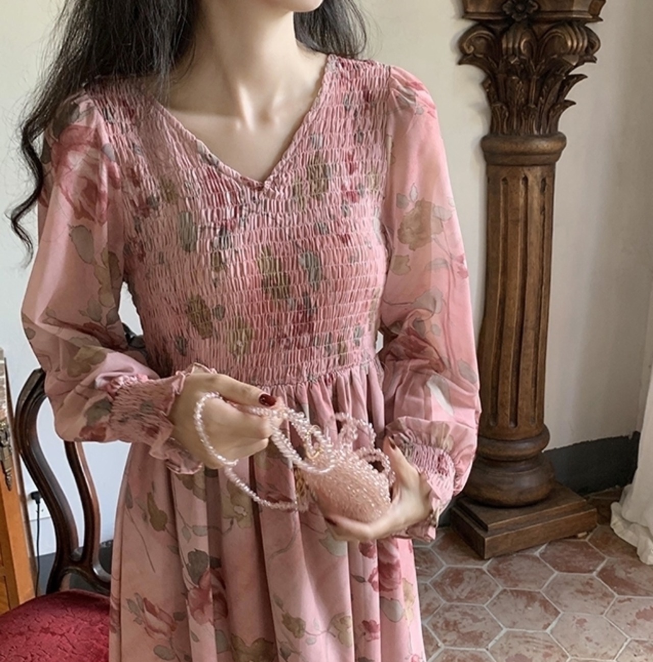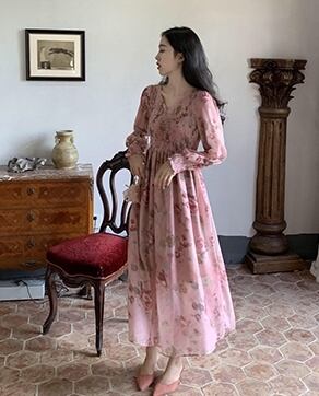 花柄が上品で大人可愛い印象のロング丈ワンピースです。