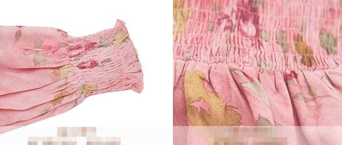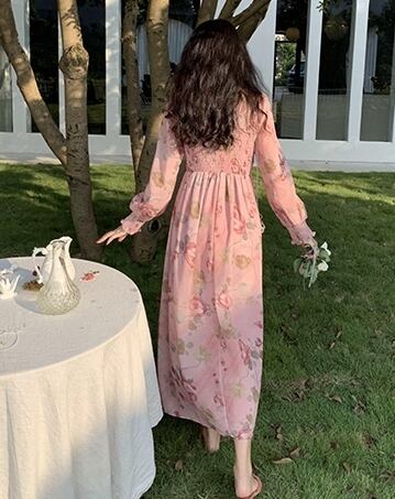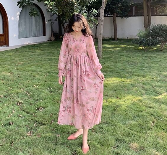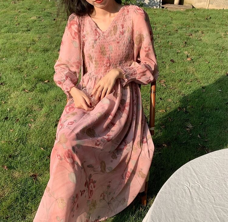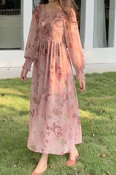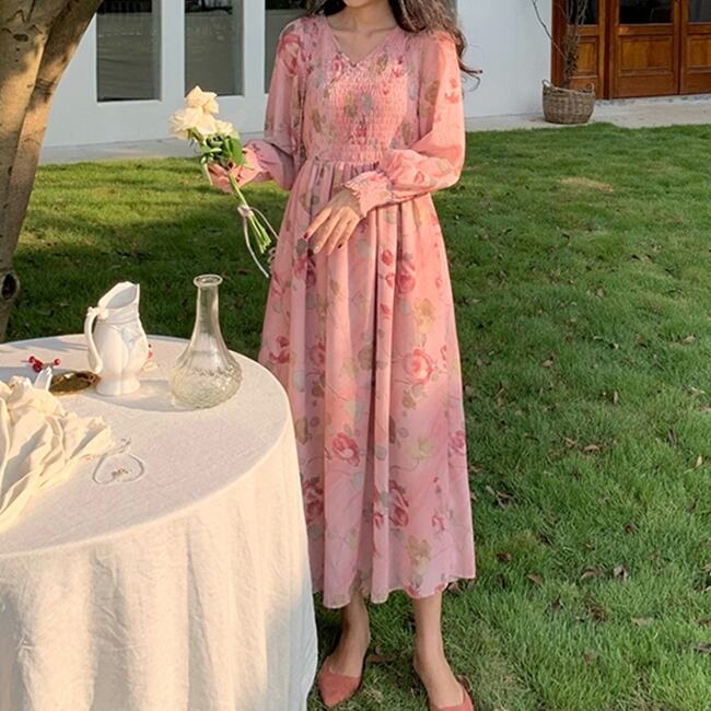 ワンピース ロング丈 花柄 長袖 パフスリーブ Vネック ハイウエスト 上品 可愛い ガーリー シフォン フレア カジュアル リゾート デート きれいめ 春 夏