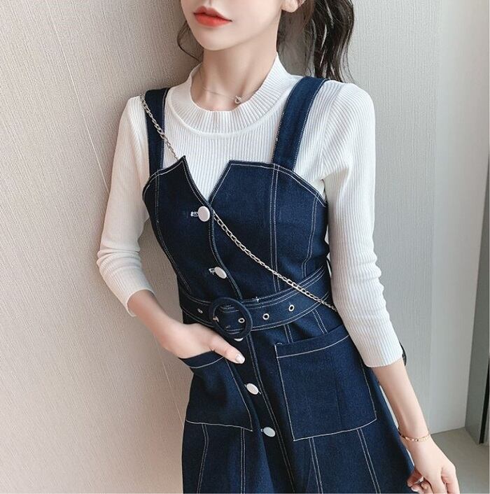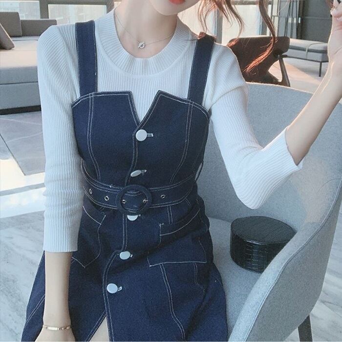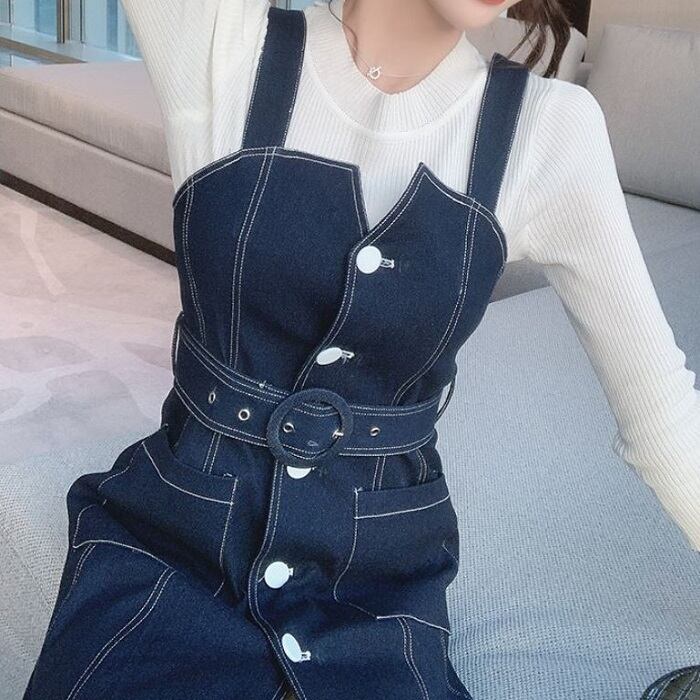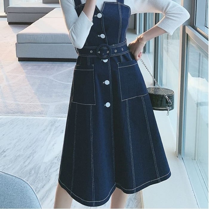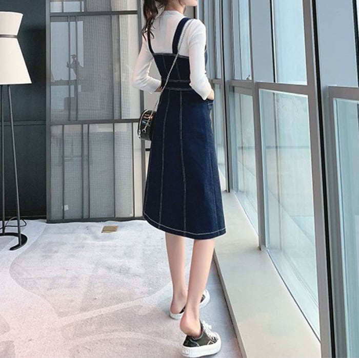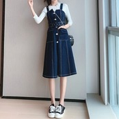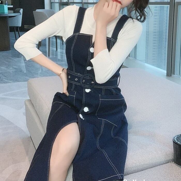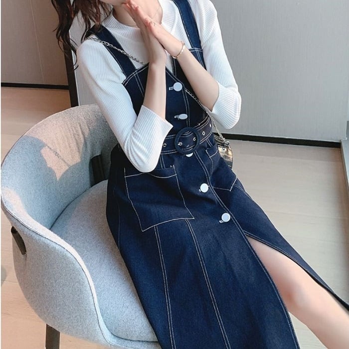 デニムスカート ジャンパースカート ワンピース ひざ丈 フロントボタン スリット カジュアル お出かけ デート レジャー