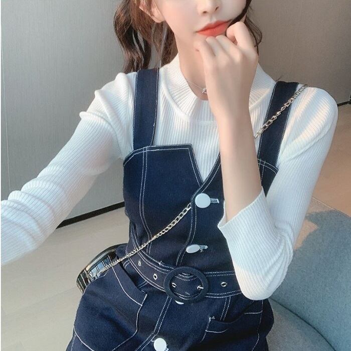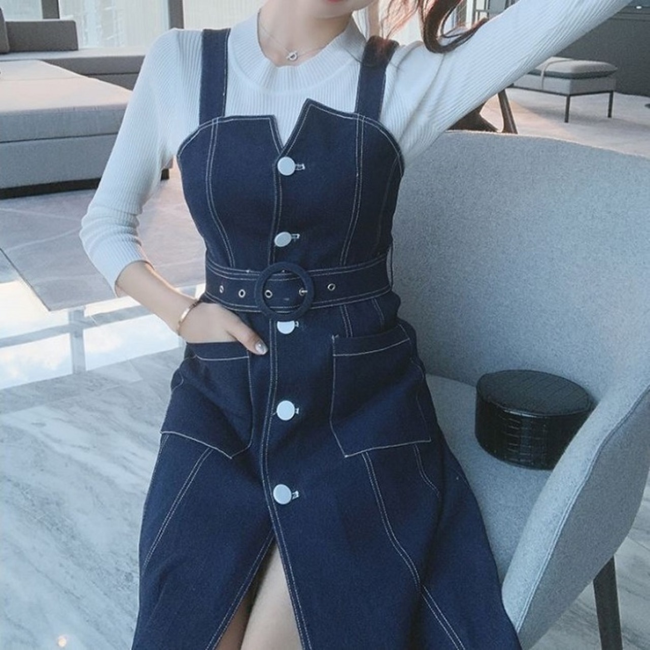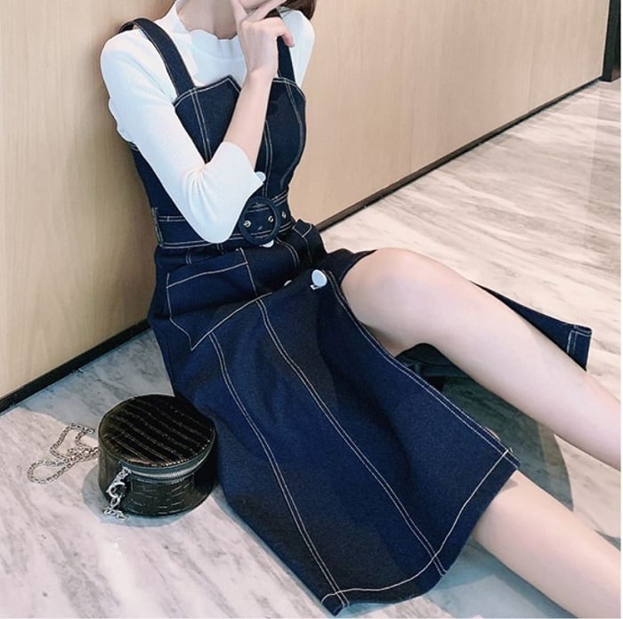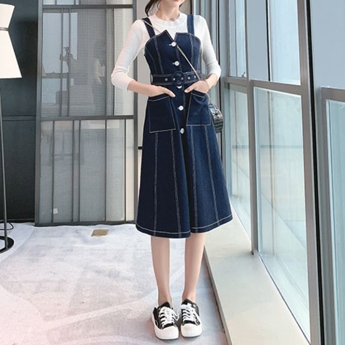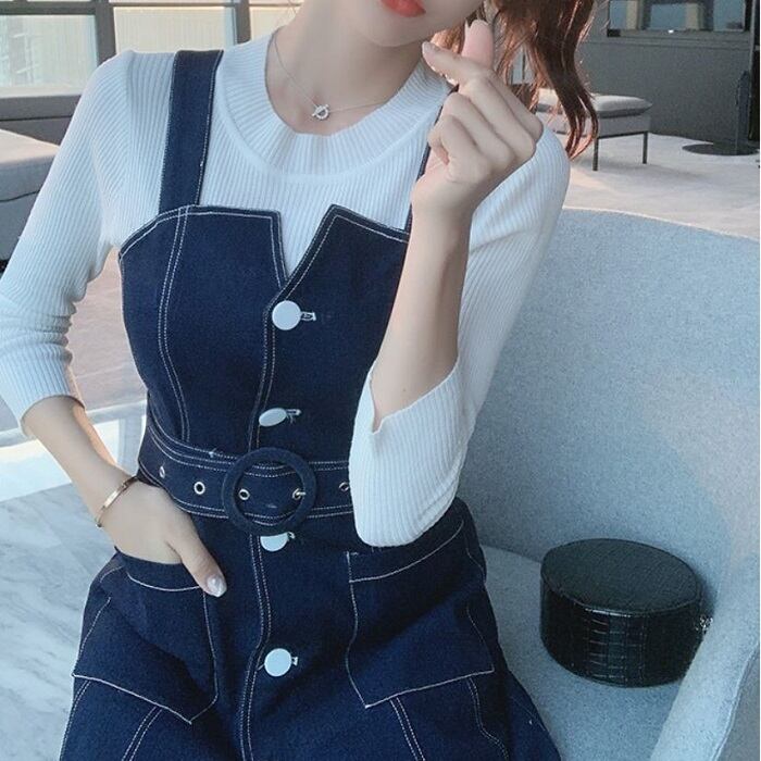 デニムスカート ジャンパースカート ワンピース ひざ丈 フロントボタン スリット カジュアル お出かけ デート レジャー