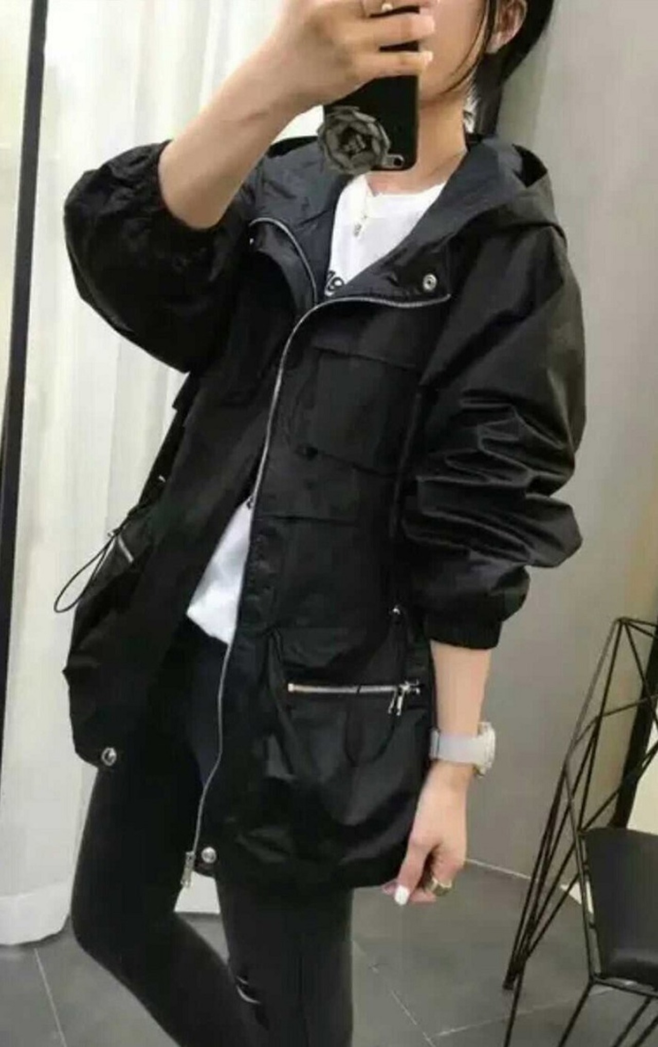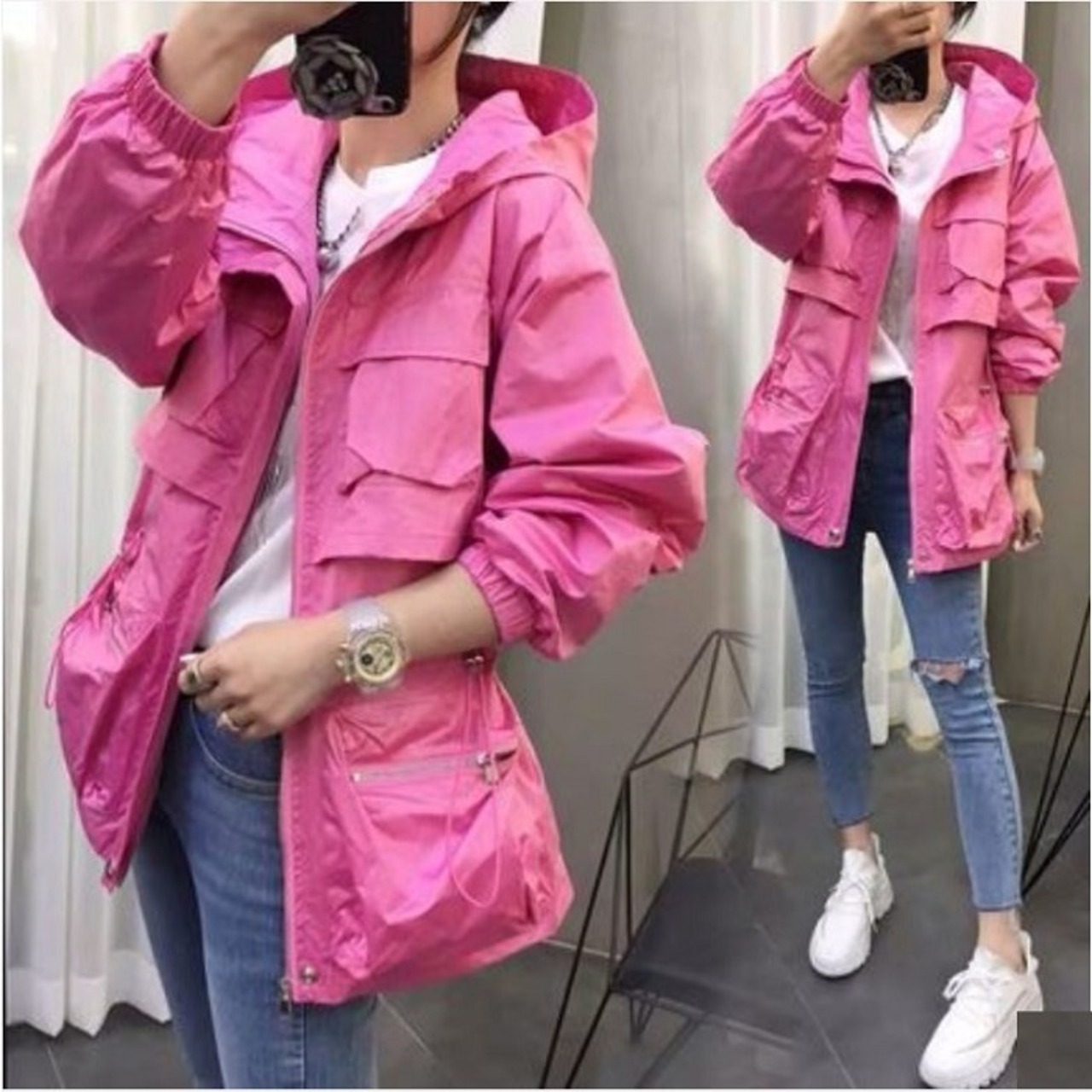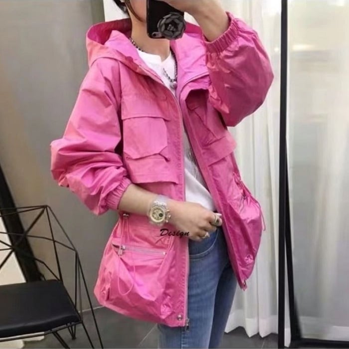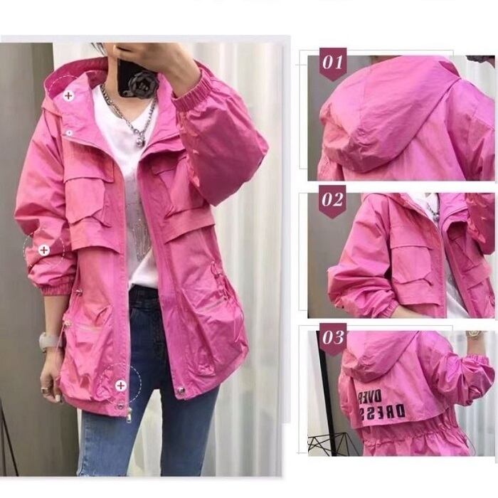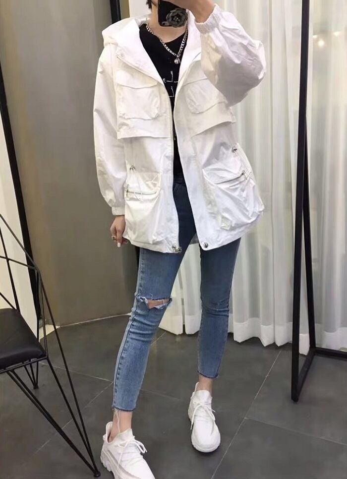 全3色 ウインドブレーカー ジャンパー モッズコート パーカー フード付き 中袖 無地 カジュアル アウトドア お出かけ スポーツ レジャー ピンク ホワイト ブラック