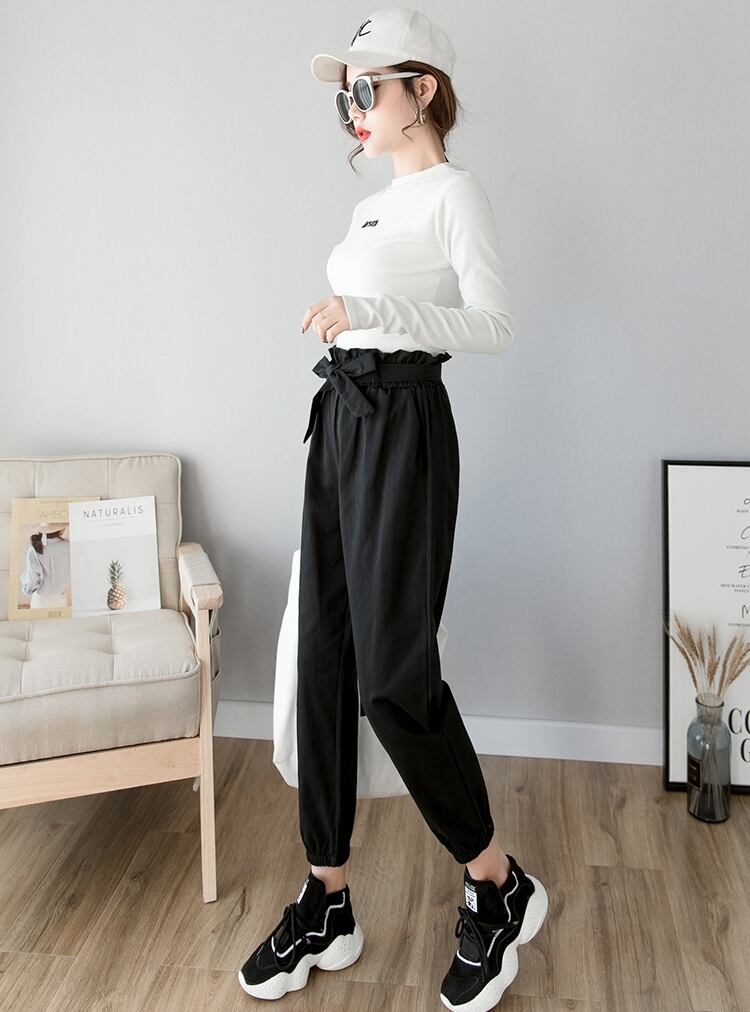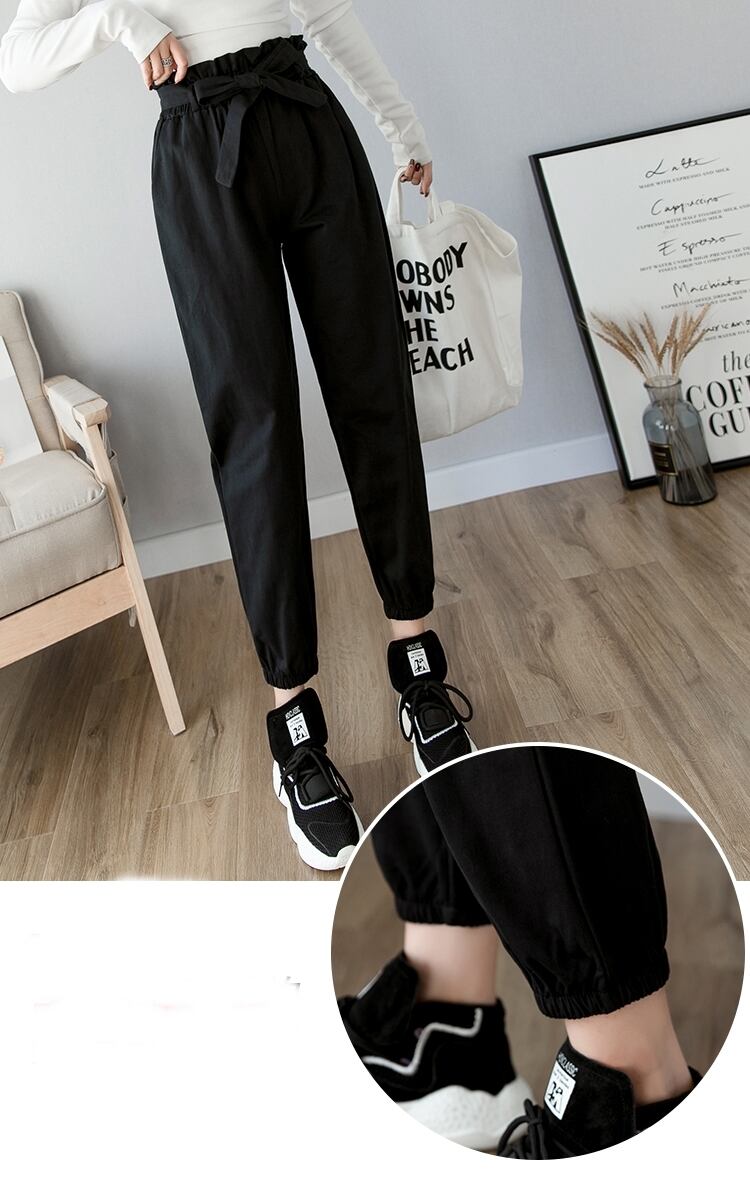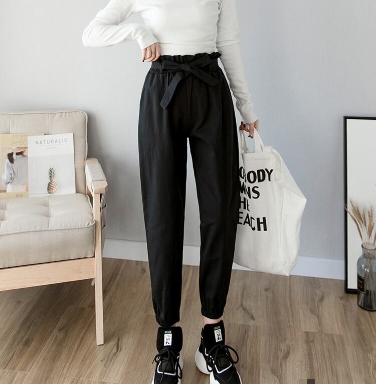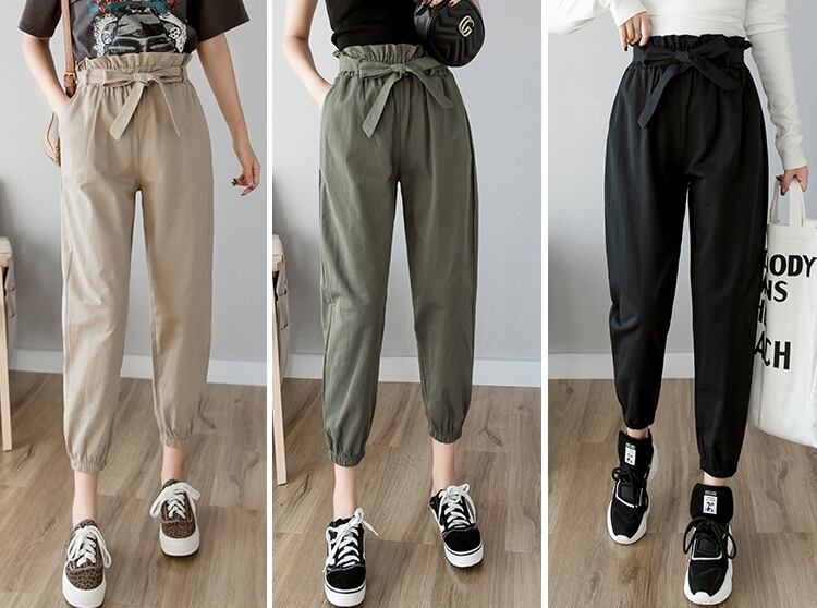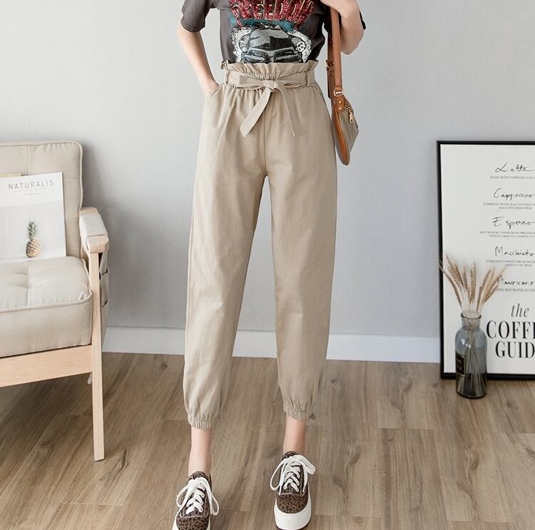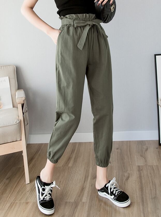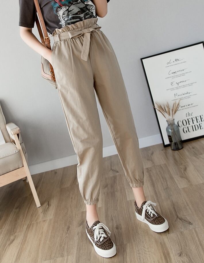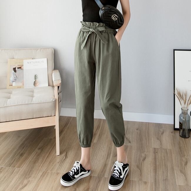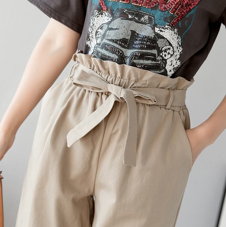 全3色 テーパードパンツ パンツ ボトムス ハイウエスト 9分丈 ウエストリボン ウエストフリル カジュアル 可愛い デイリー お出かけ シンプル 春 夏