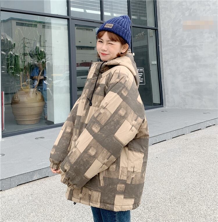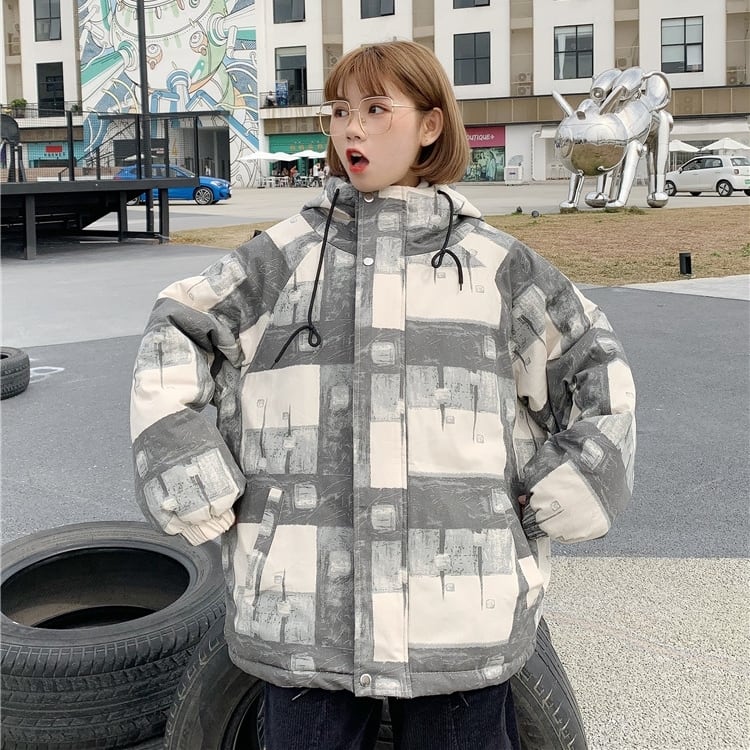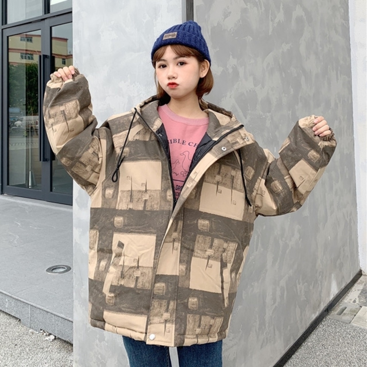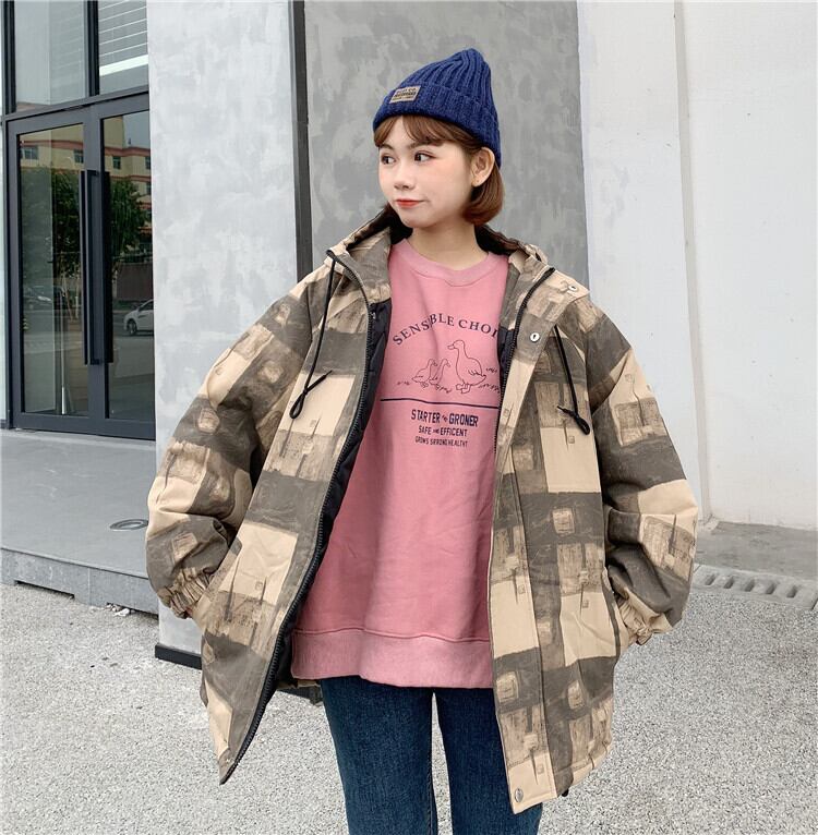 全3色 中綿ジャケット ウインドブレーカー 柄 フード付き カジュアル ジッパー 防寒 クール メンズライク ゆったり オーバーサイズ 韓国ファッション 春 秋 冬