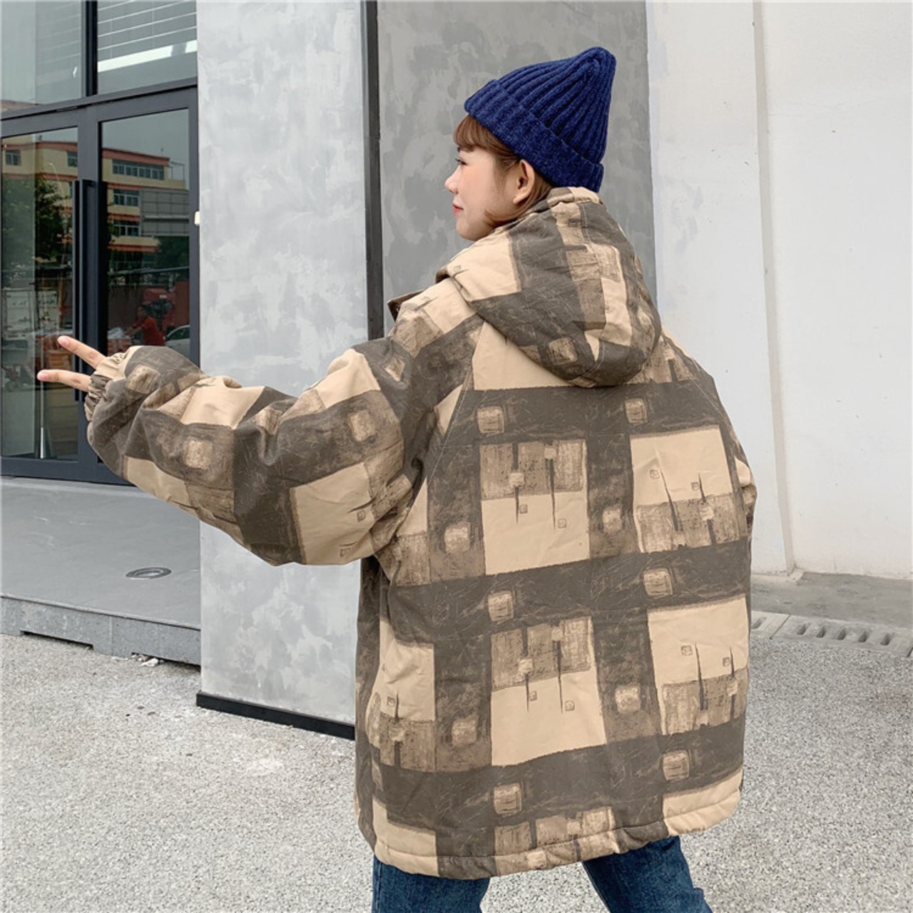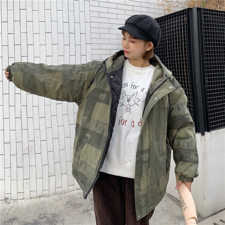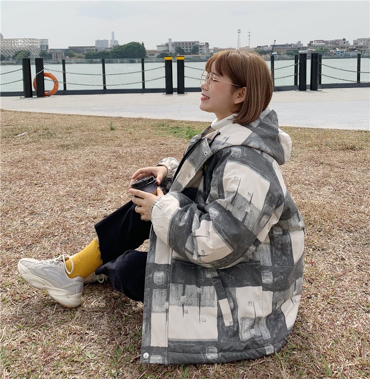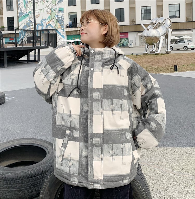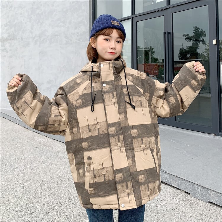 全3色 中綿ジャケット ウインドブレーカー 柄 フード付き カジュアル ジッパー 防寒 クール メンズライク ゆったり オーバーサイズ 韓国ファッション 春 秋 冬