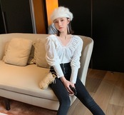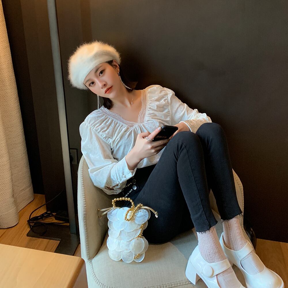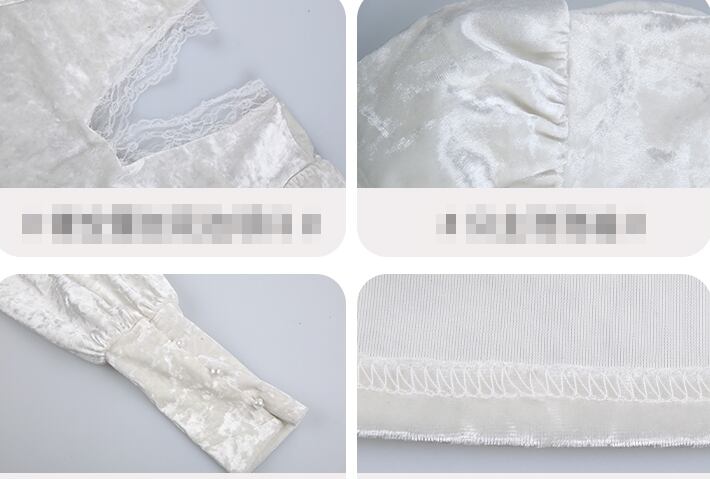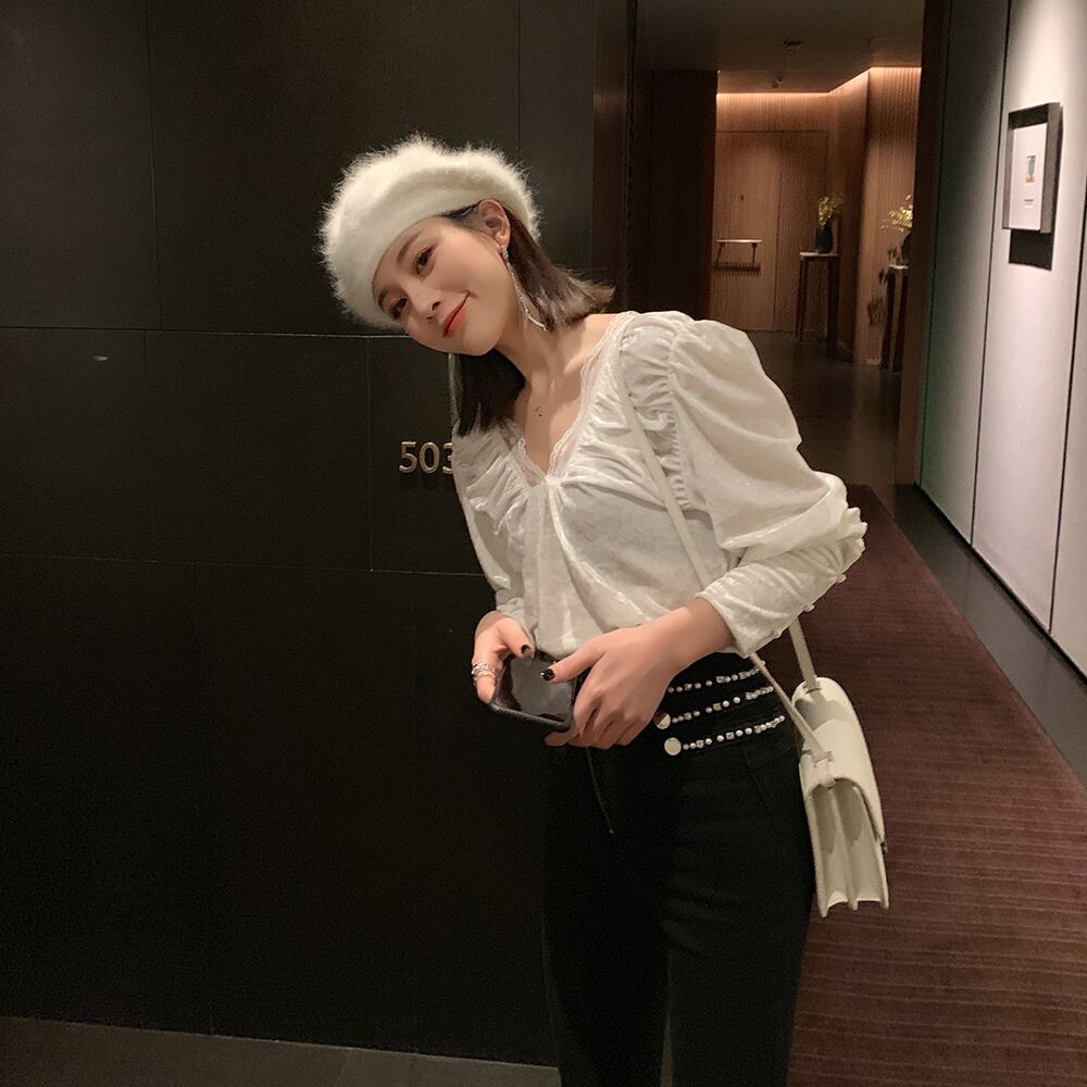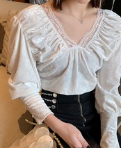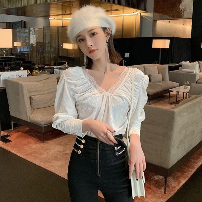 トップス ブラウス ベルベット Vネック レース パフスリーブ 可愛い ガーリー フロントコンシャス スリム 長袖 上品 カジュアル きれいめ デート 女子会 春秋