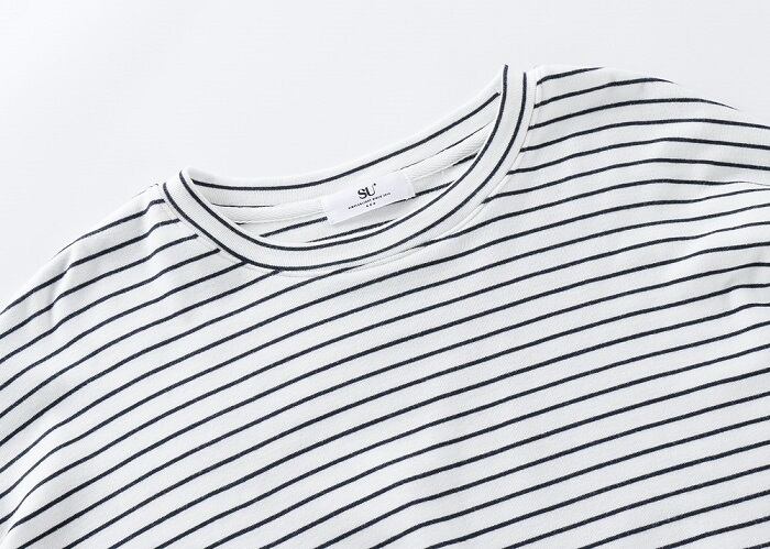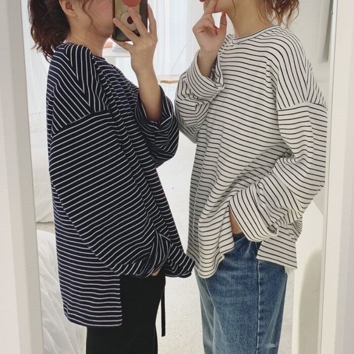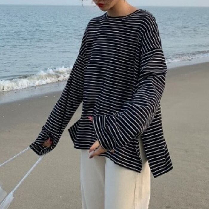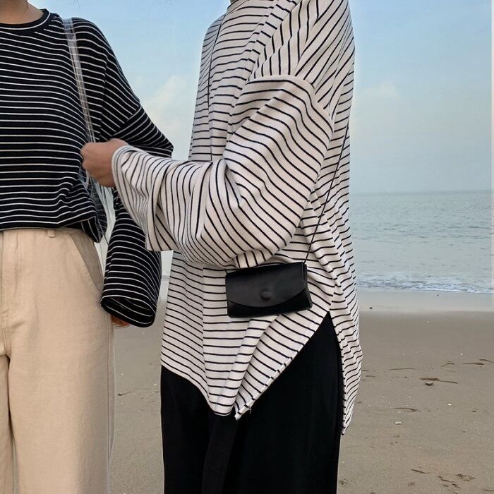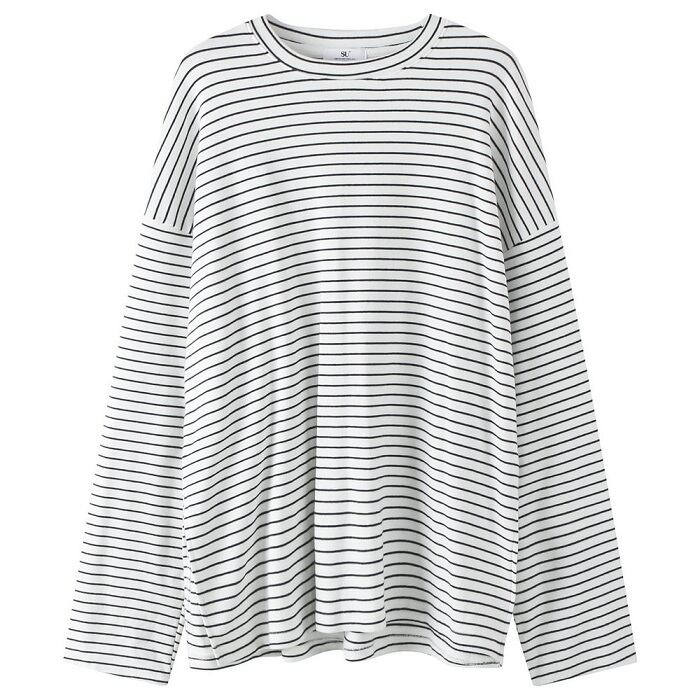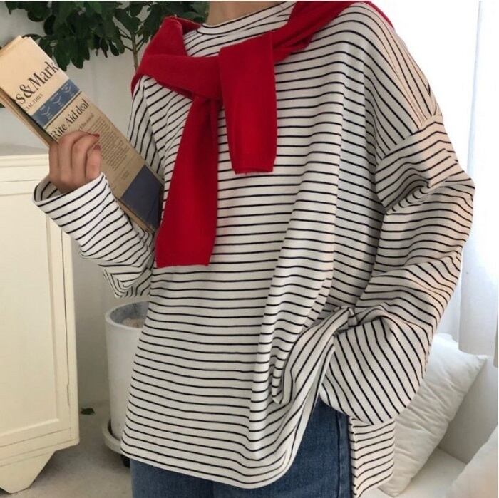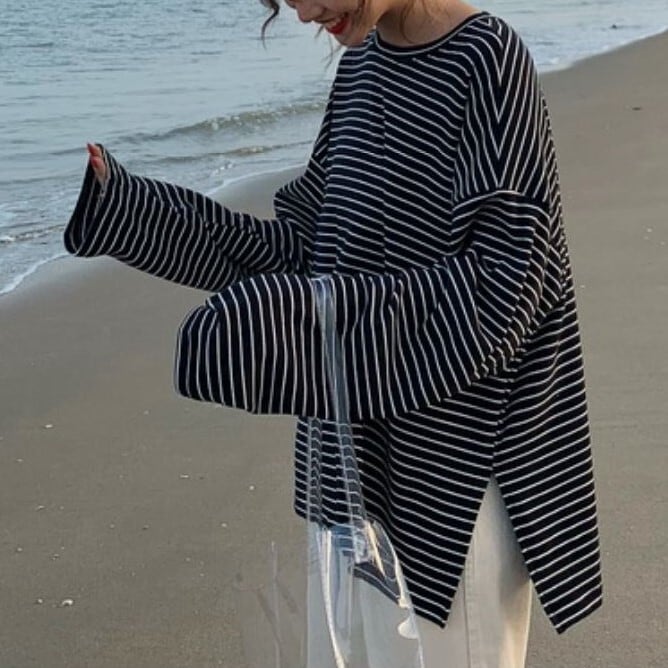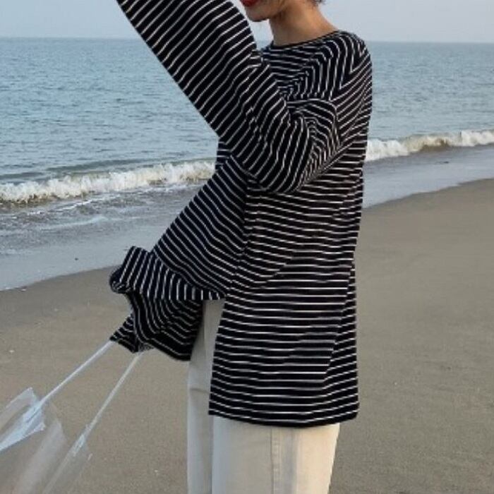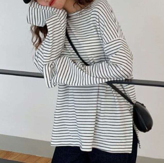 全2色 ボーダーTシャツ Tシャツ 長袖 ラウンドネック ドロップショルダー ゆったり オーバーサイズ カジュアル レジャー デイリー 普段着 ブラック ホワイト
