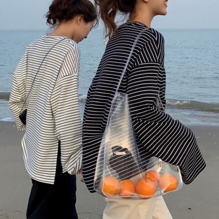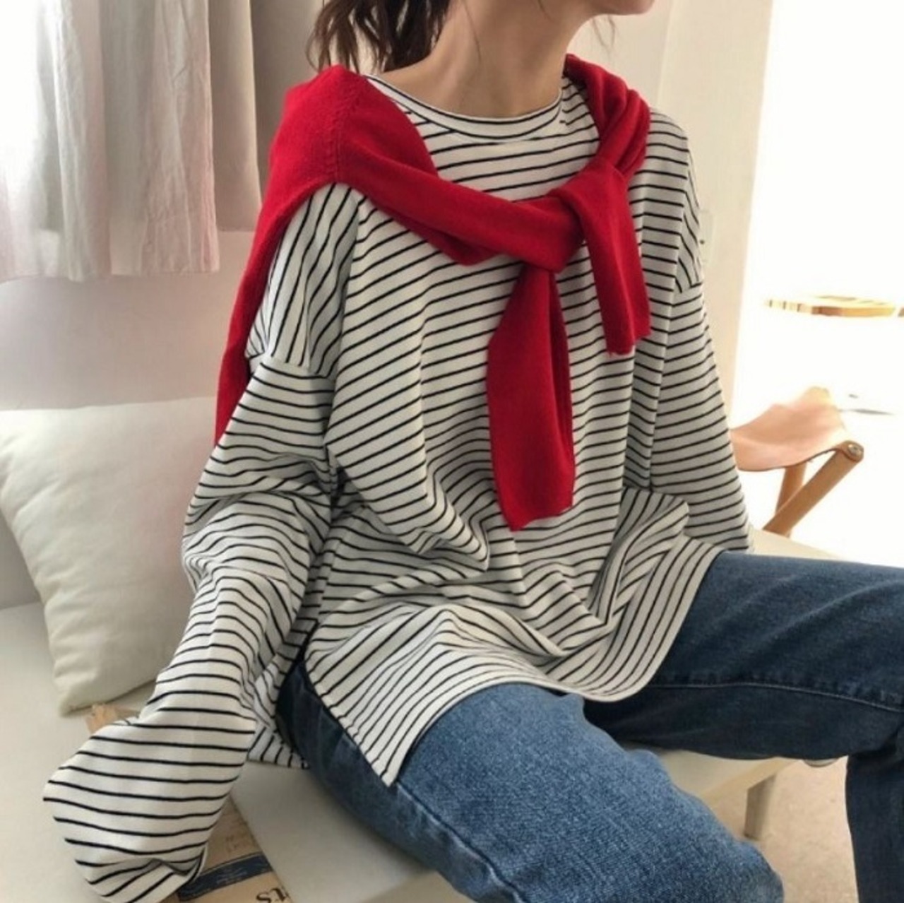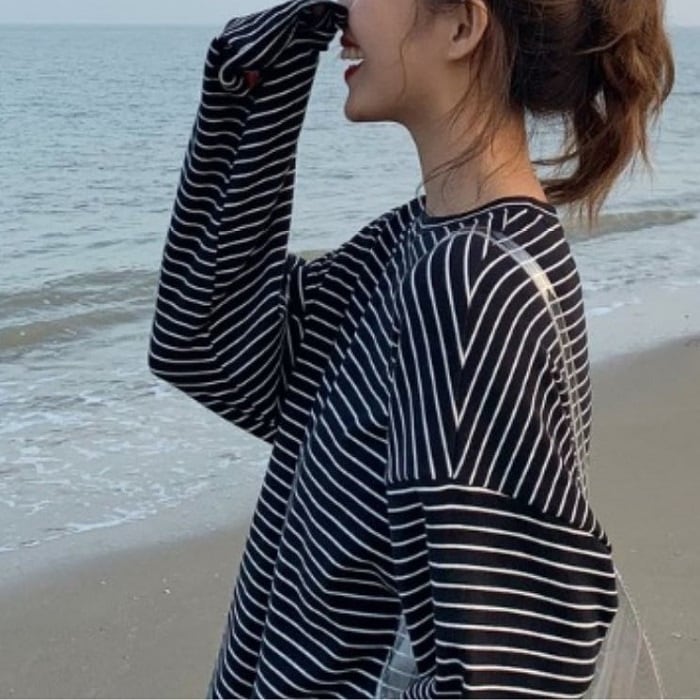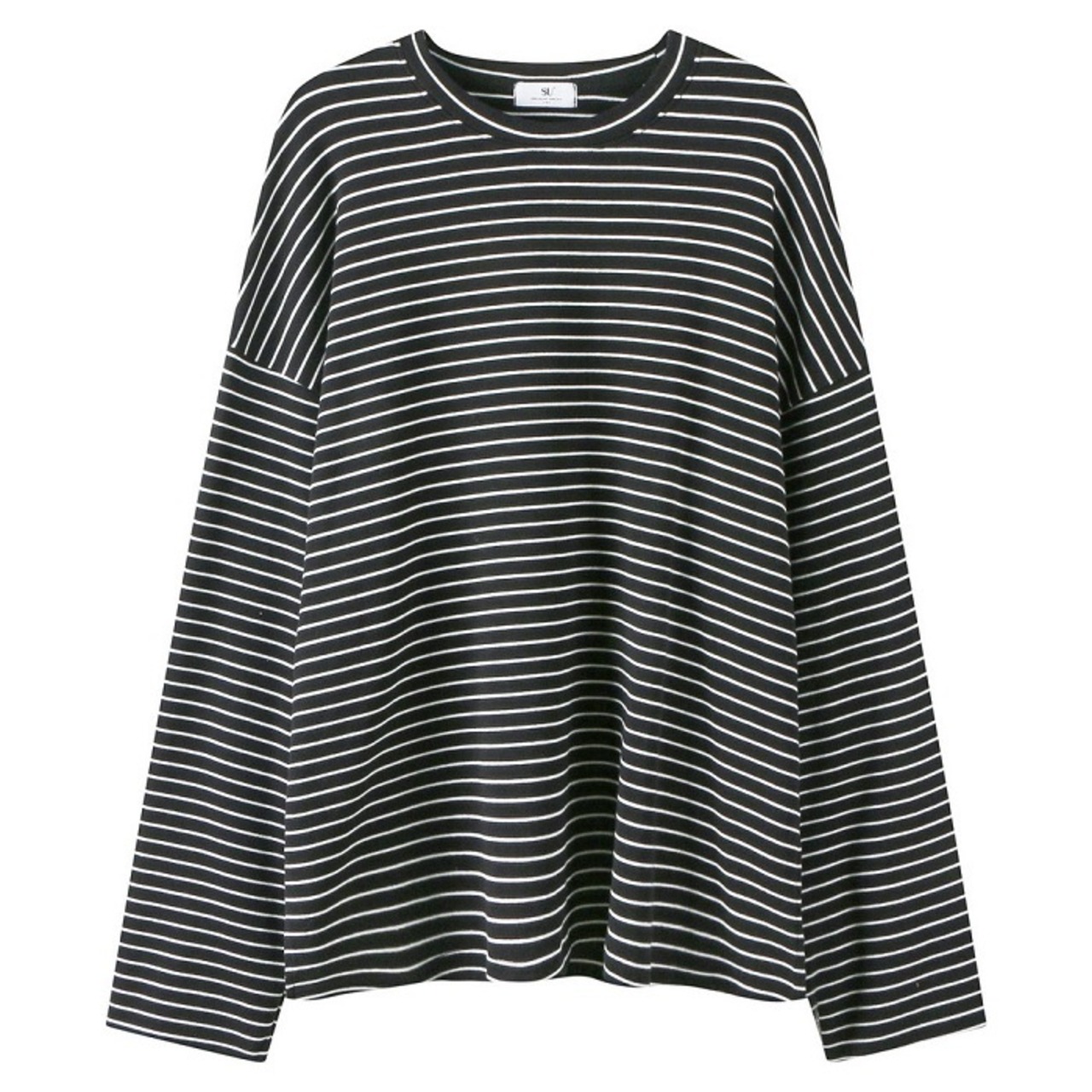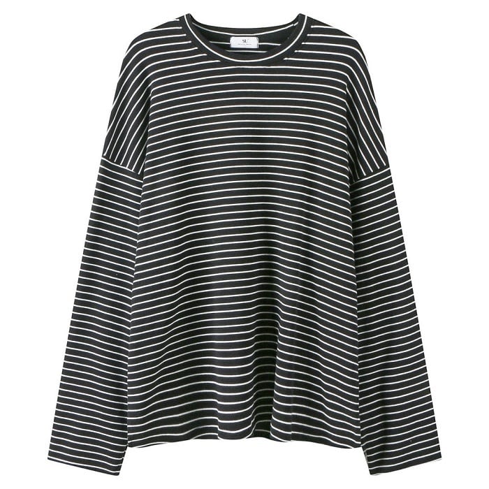 全2色 ボーダーTシャツ Tシャツ 長袖 ラウンドネック ドロップショルダー ゆったり オーバーサイズ カジュアル レジャー デイリー 普段着 ブラック ホワイト