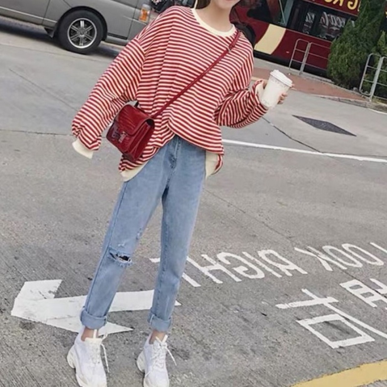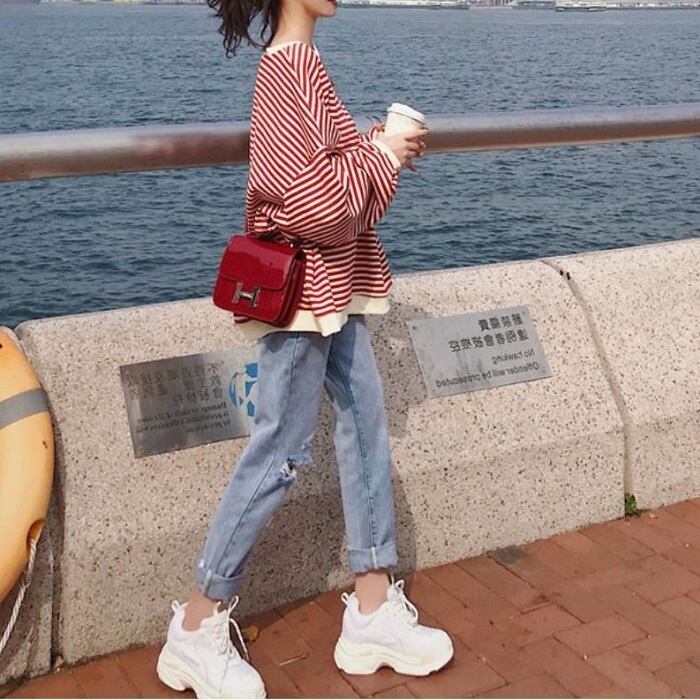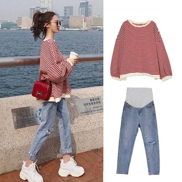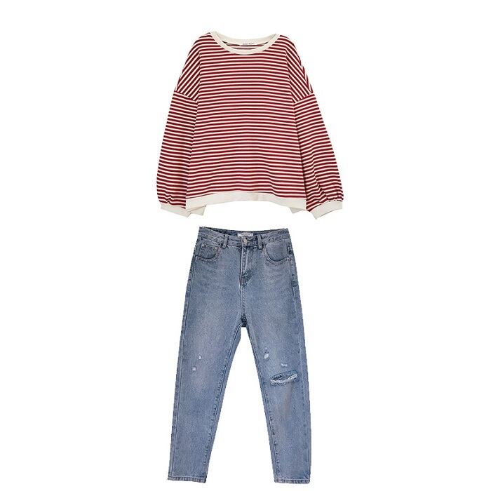 大きいサイズ セットアップ 上下セット ボーダーTシャツ 長袖 ラウンドネック ドロップショルダー ゆったり オーバーサイズ デニムパンツ ジーンズ ダメージ カジュアル レジャー デイリー 普段着